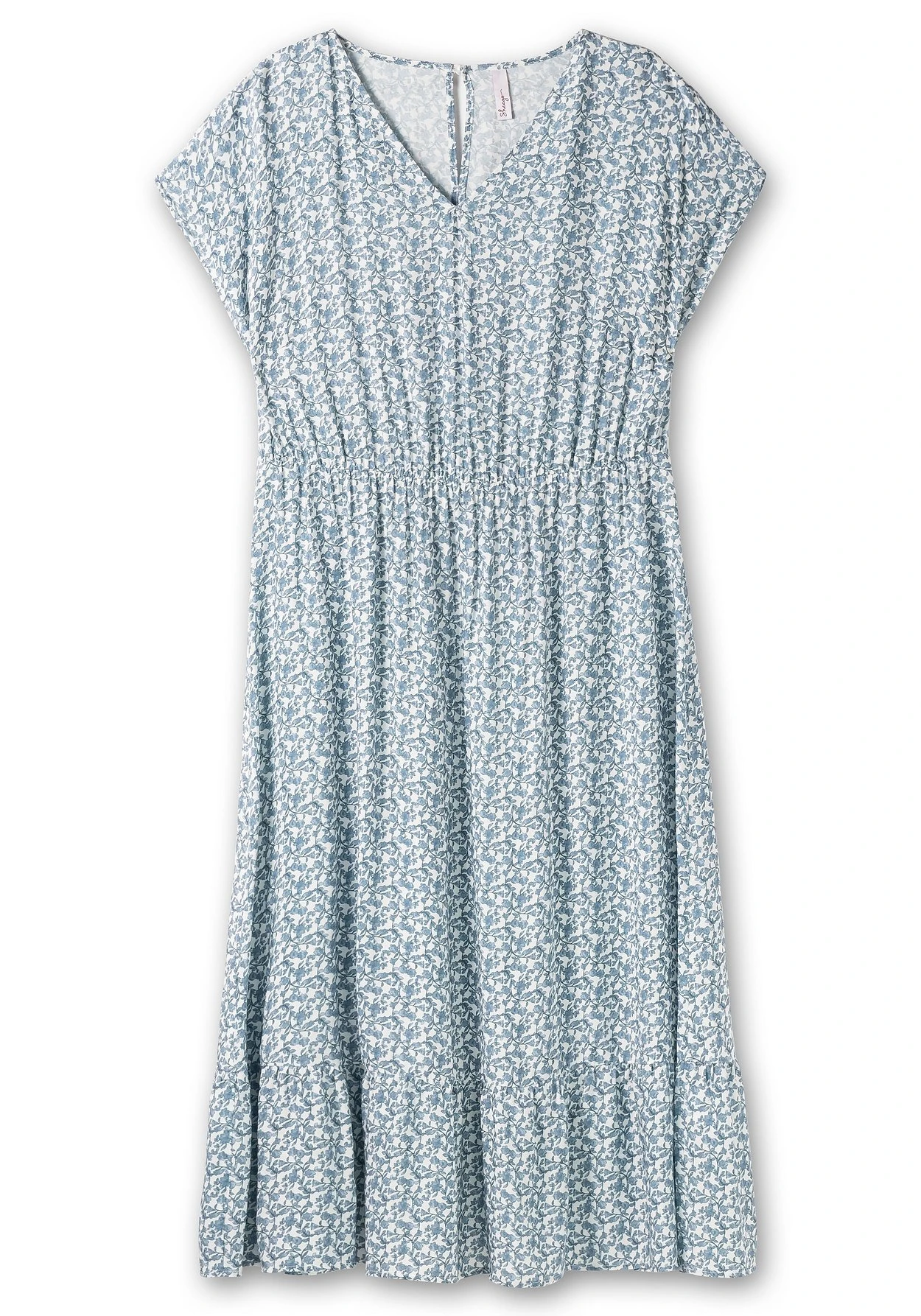 Kurzärmliges Kleid mit Allover-Blumendruck. Der romantische Auftritt wird durch den femininen V-Ausschnitt und das Schlüssellochdetail im Rücken ergänzt. Ein Gummizugbund betont die Taille, eine Ziernaht mit Kräuselung gibt dem Saum verspielten Schwung.