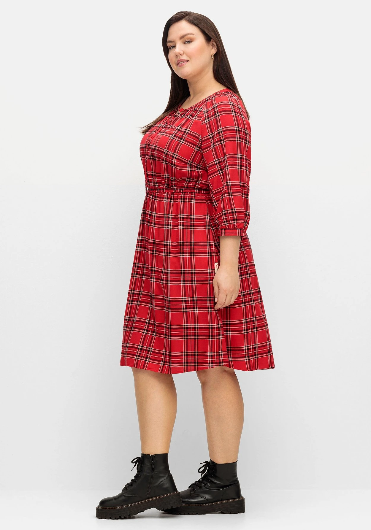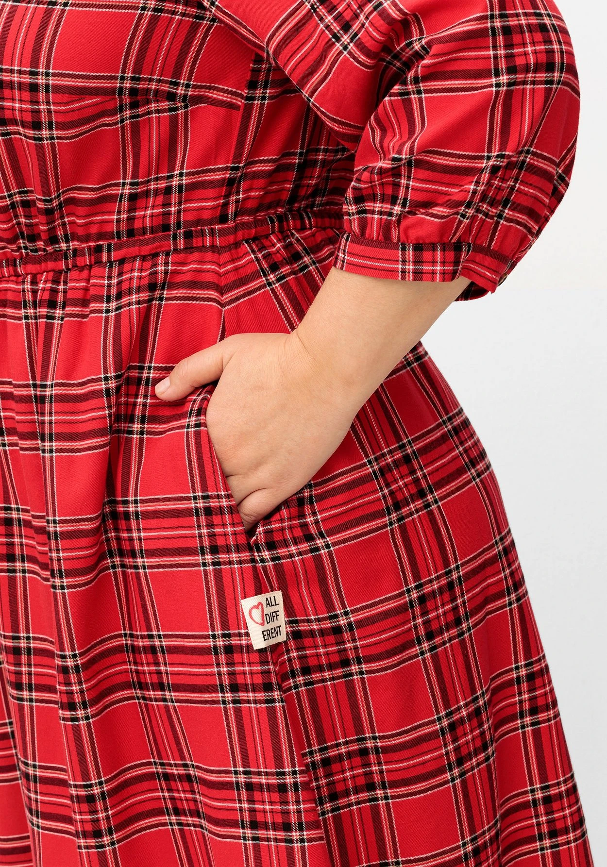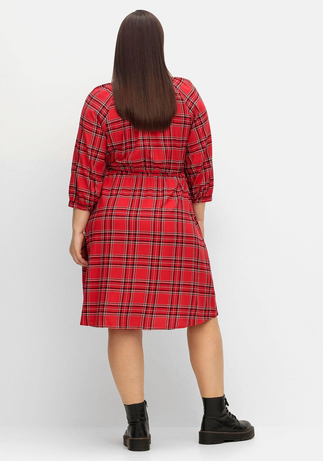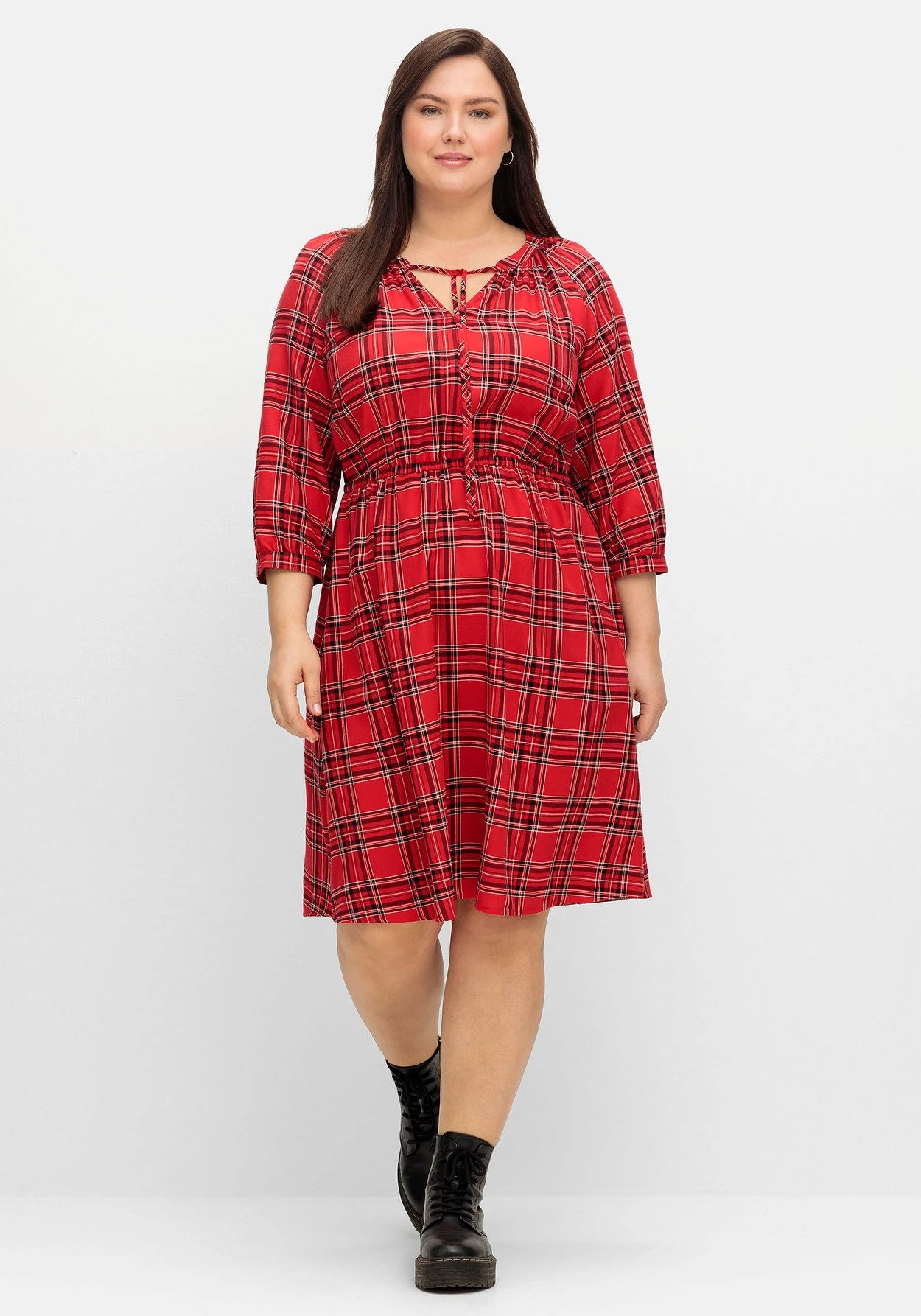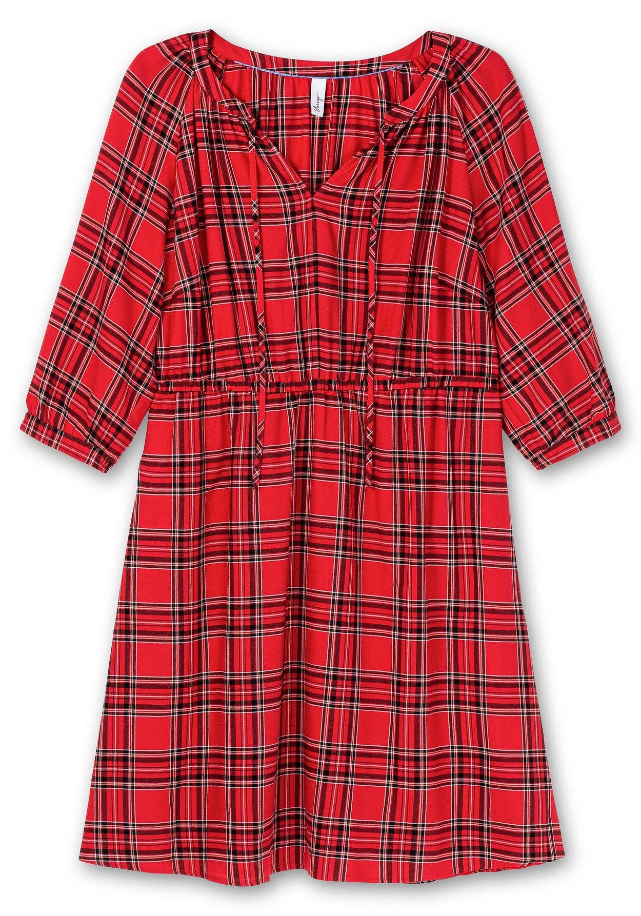 Kleid in knieumspielender Länge. Das markante Karomuster verzaubert mit lässigem Country-Charme. Der leicht gekräuselte Rundhals geht in einen V-Ausschnitt über und erhält durch die Bindebändchen eine verspielte Optik. Mit dem Gummizugbund wird die Körpermitte auf Taille gebracht und lässt gleichzeitig eine feminine X-Silhouette entstehen. Praktisch sind die seitlichen Nahttaschen. Schmale Manschetten am 3/4-Arm runden den Look gepflegt ab. Ein seitliches Weblabel mit Wordingprint ziert unterhalb der Eingrifftasche.