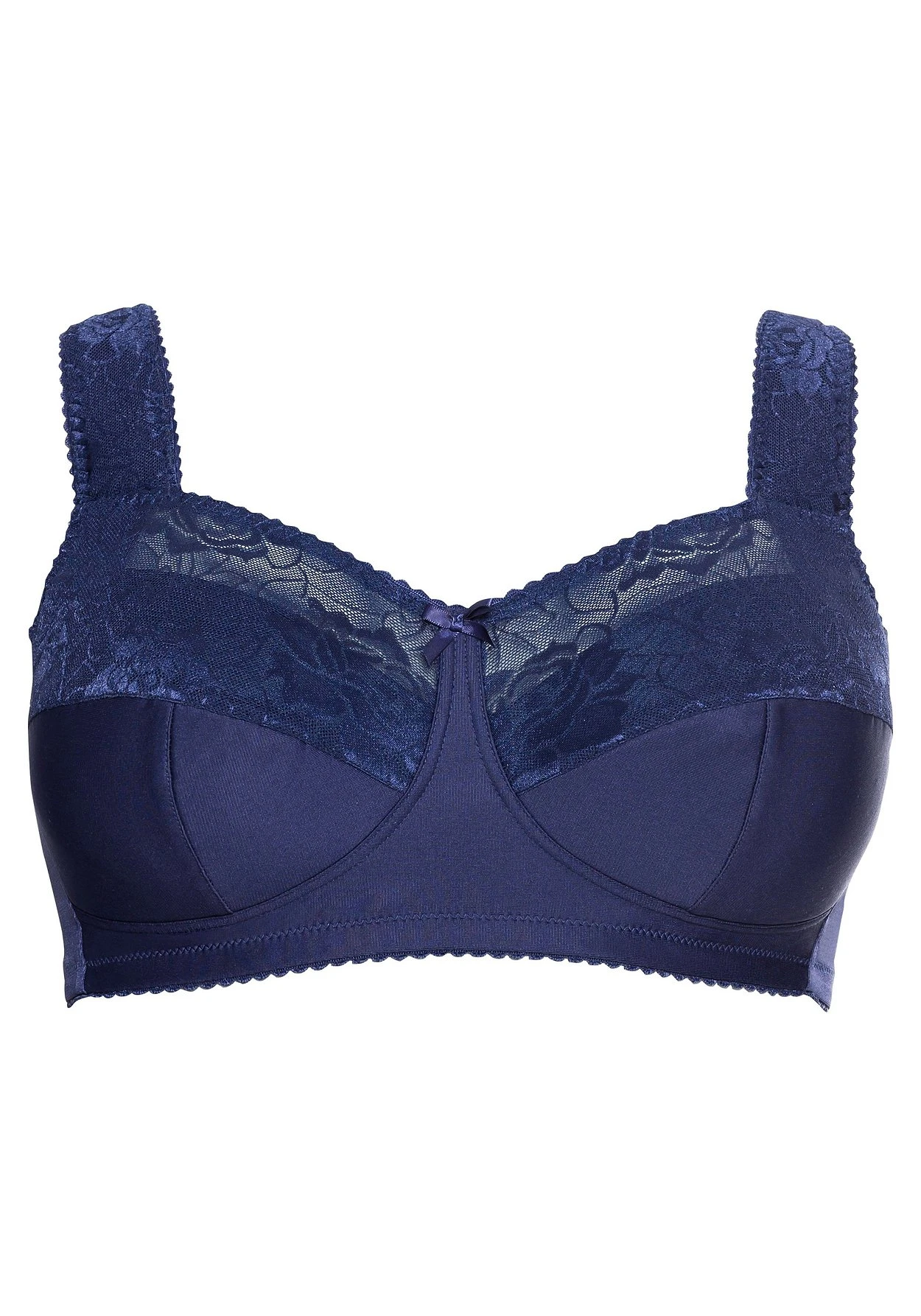 Komfort-BH ohne Bügel. Die zarte, leicht transparente Spitze am Ausschnitt und die kleine Schleife vorn verleihen dem BH seine raffinierte Note. Dazu überzeugt der hohe Tragekomfort: Die Cups decken die Brust komplett ab, dabei ist der untere Teil der Cups weich gepolstert. Guten Halt gibt der hohe Mittelsteg, breite Träger sind ebenfalls eine stützende Hilfe und schneiden nicht ein. Auch der verstellbare Rückenverschluss ist weich wattiert. Für noch mehr Entlastung und Unterstützung sorgt die innenliegenden Mesh-Verstärkung seitlich unter dem Arm.