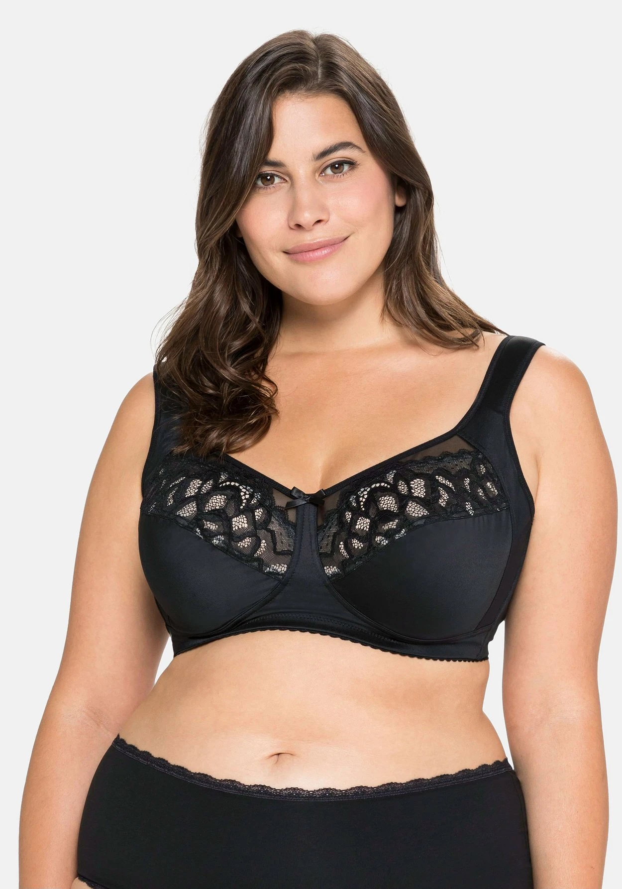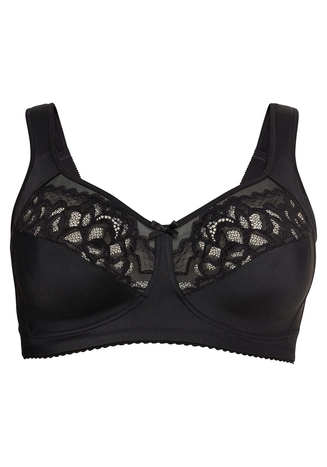 Komfort-BH ohne Bügel. Die leicht transparenten Details aus Spitze und Netz-Material am Ausschnitt sowie die kleine Schleife vorn verleihen dem BH seine raffinierte Note. Dazu überzeugt der hohe Tragekomfort: Die Cups decken die Brust komplett ab, der hohe Mittelsteg gibt Halt und die breiten Träger schneiden nicht ein. Auch der verstellbare Rückenverschluss ist weich wattiert.