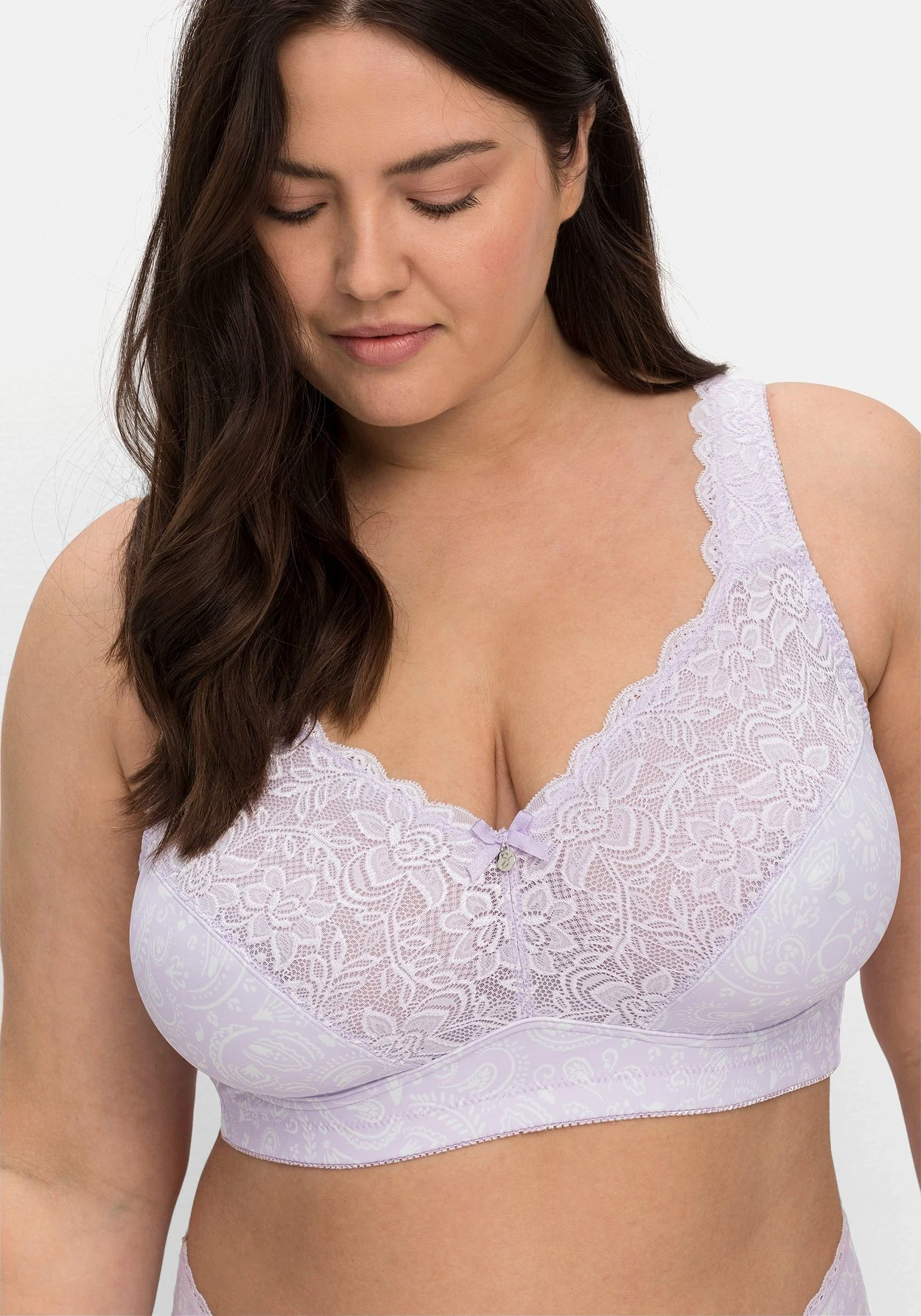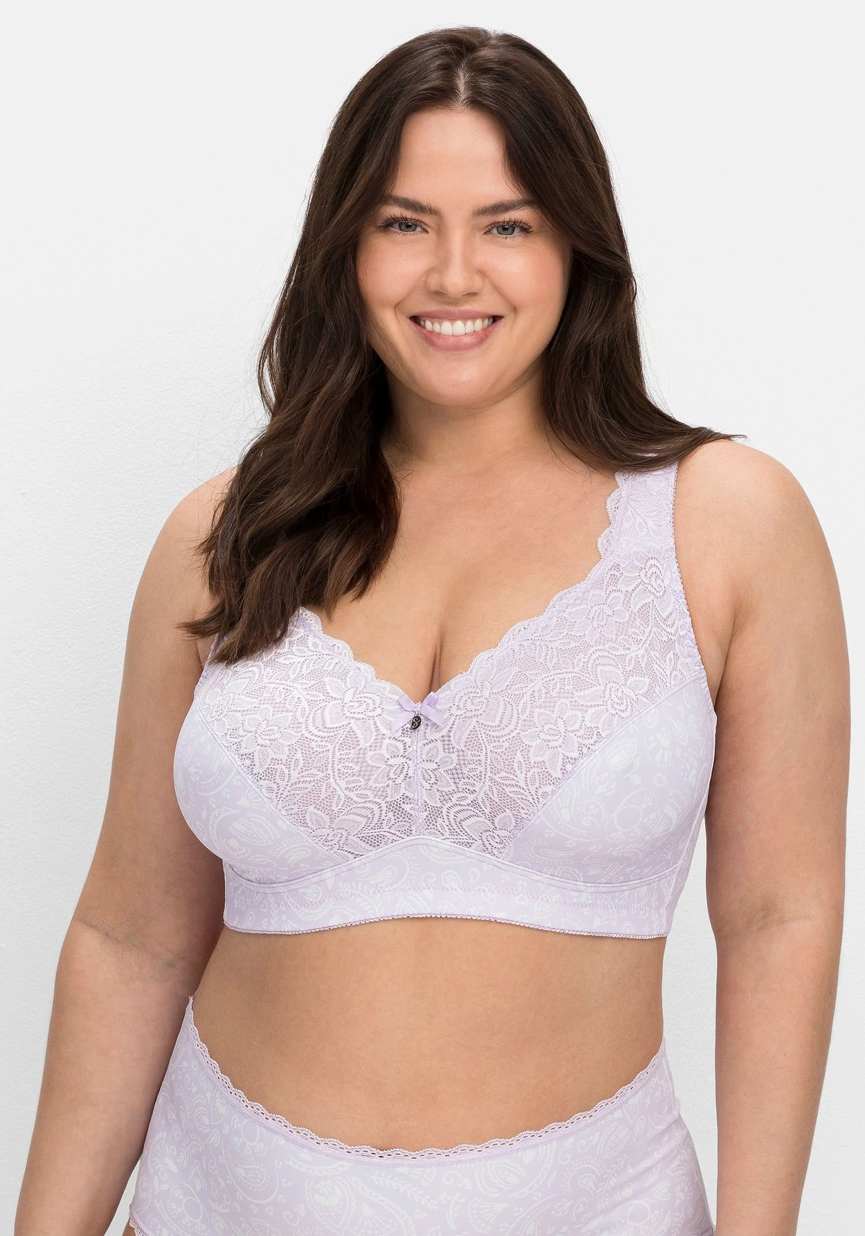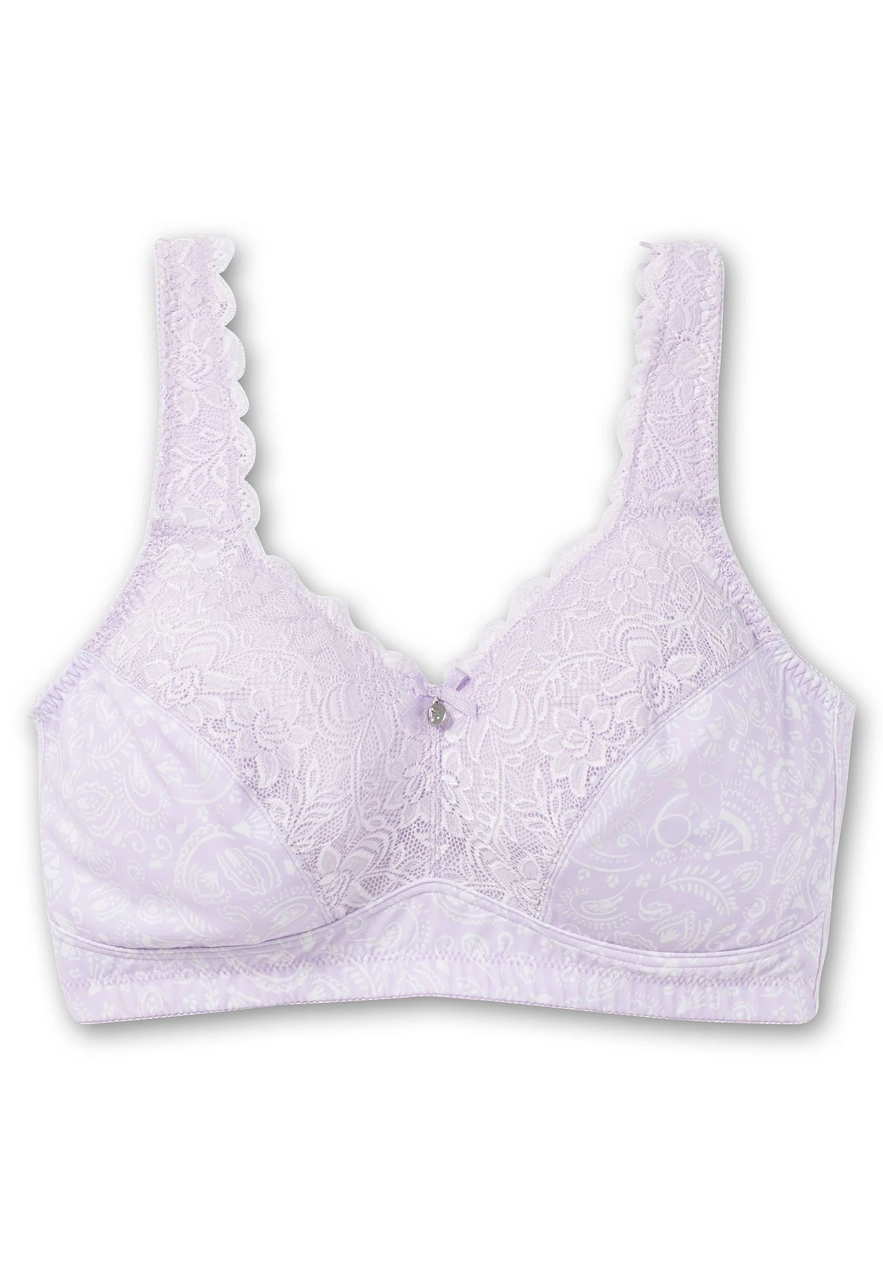 Komfort-BH ohne Bügel. Die zarte Spitze wird durch die doppellagige Verarbeitung blickdicht, ein Besatz aus Spitze am Ausschnitt ergänzt den femininen Style. Dazu überzeugt der bügellose BH mit hohem Tragekomfort: Die Cups decken die Brust komplett ab, der hohe Mittelsteg gibt Halt und die breiten Träger schneiden nicht ein. Zusätzlich stützt und entlastet das breite Unterbrustgummi.