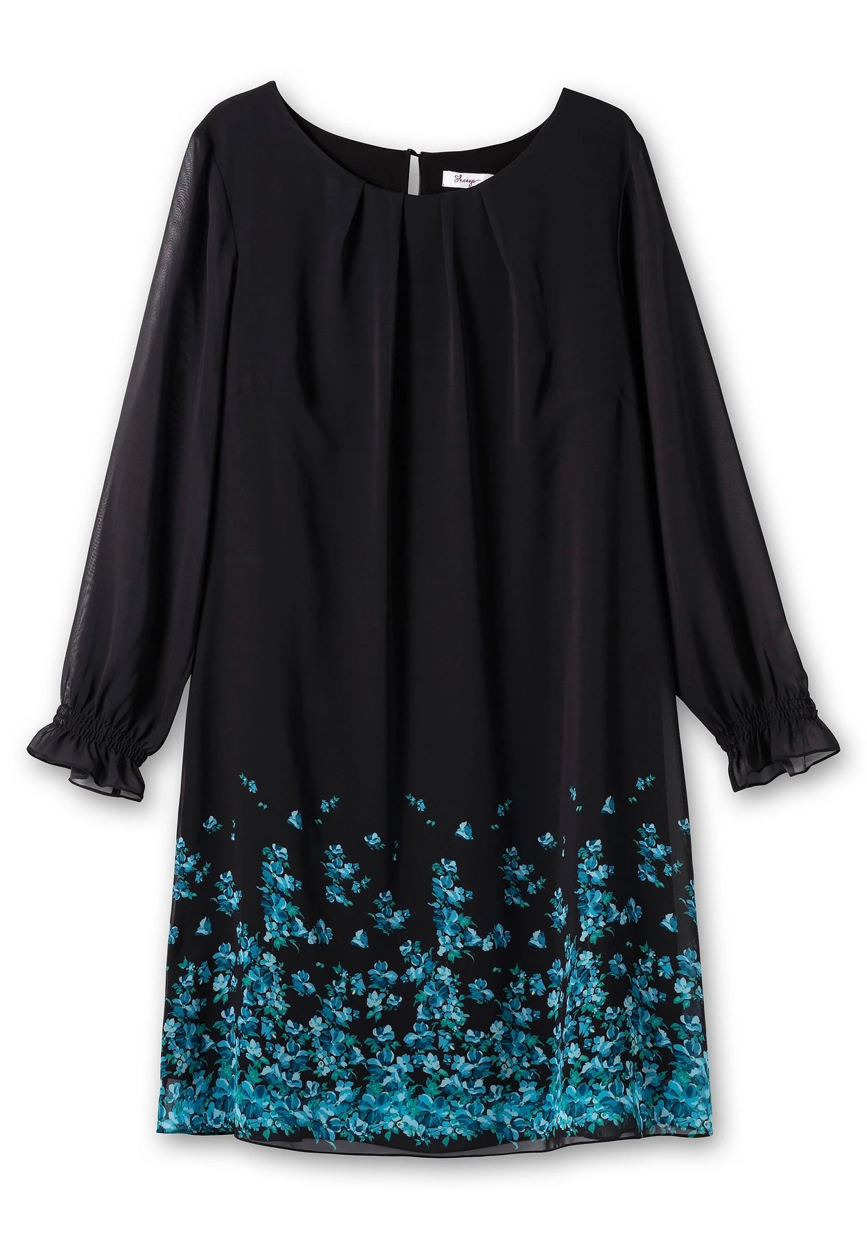 Chiffonkleid in kniefreier Länge. Durch die zarte, leicht transparente Qualität wirkt das Kleid sehr feminin, das Unterkleid macht den Body blickdicht. Ein zarter Blumenprint rückt den Saum in den Fokus. Der Rundhalsausschnitt ist vorn mit gelegten Falten dekoriert, im Nacken überraschen Schlitz und Knopfverschluss. Als verspieltes Finish dient der Smokbund am Ärmelsaum.