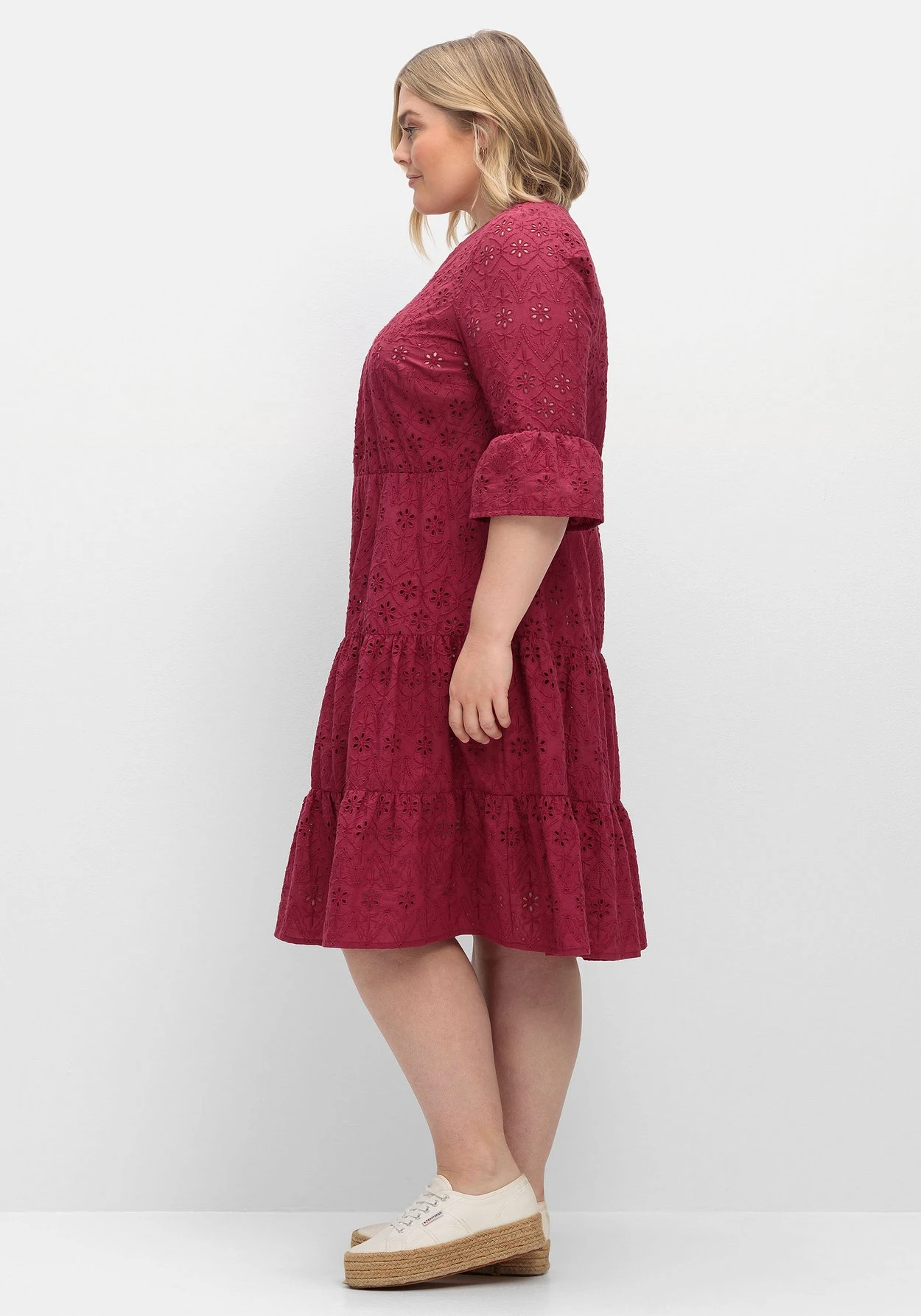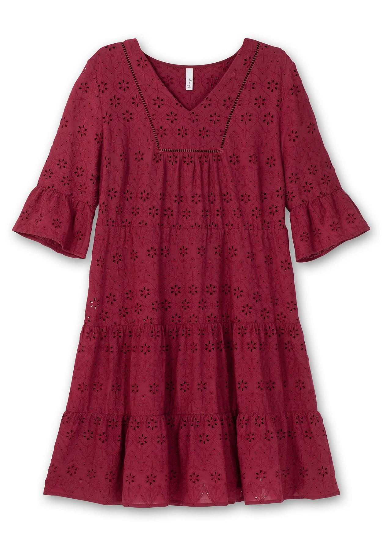 Kleid in Kaskadenform. Die florale Lochstickerei und das Ajourmuster verleihen dem Kleid sommerliches Boho-Flair. Angekräuselte Teilungsnähte im Rockteil sowie am Saum der 3/4-Ärmel lassen verspielte Volants entstehen. Der V-Ausschnitt und ein Gummizug in der Taille ergänzen den femininen Look.
