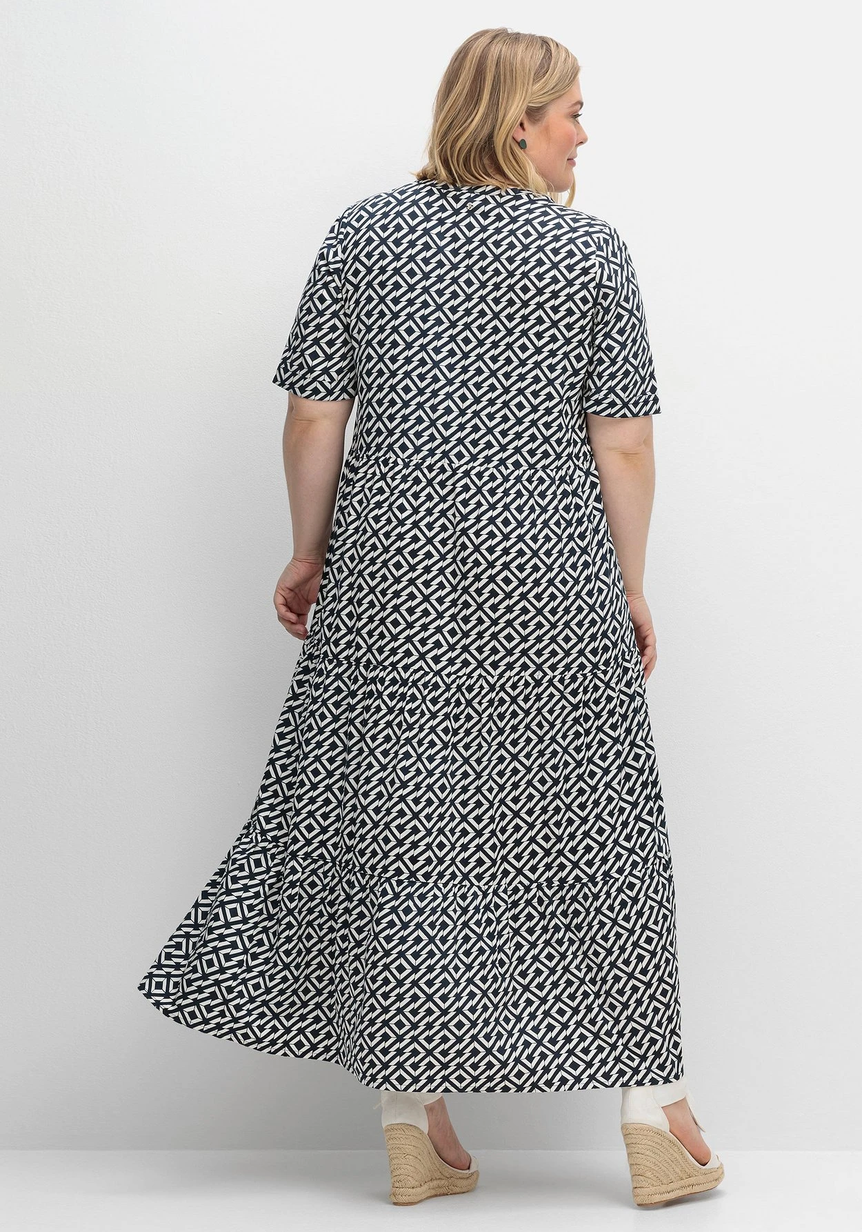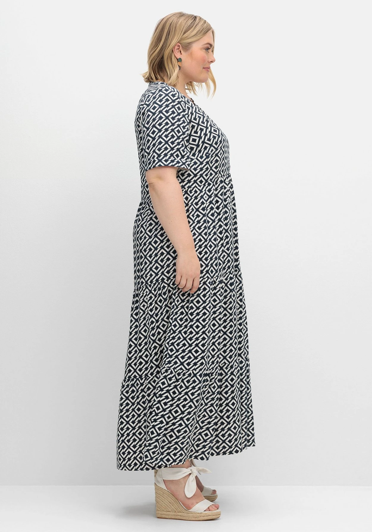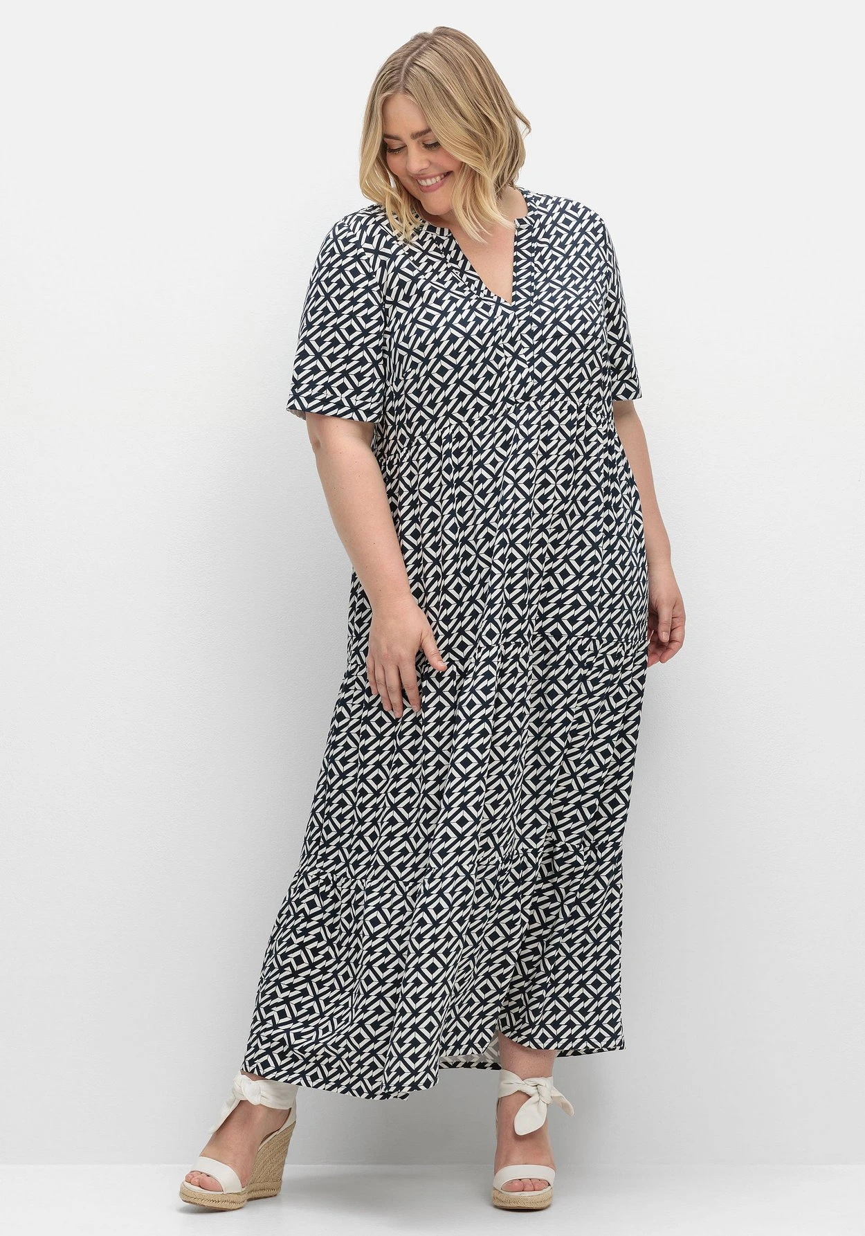 Kleid in Maxilänge. In leichter A-Linie und mit weit schwingendem Rock zeigt sich das Kleid luftig und bequem, angekräuselte Teilungsnähte lassen dabei verspielte Stufenvolants entstehen. Der tief geschlitzte Rundhalsausschnitt ist mit einem Druckknopf versehen, als modisches Finish dient der grafische Alloverprint.