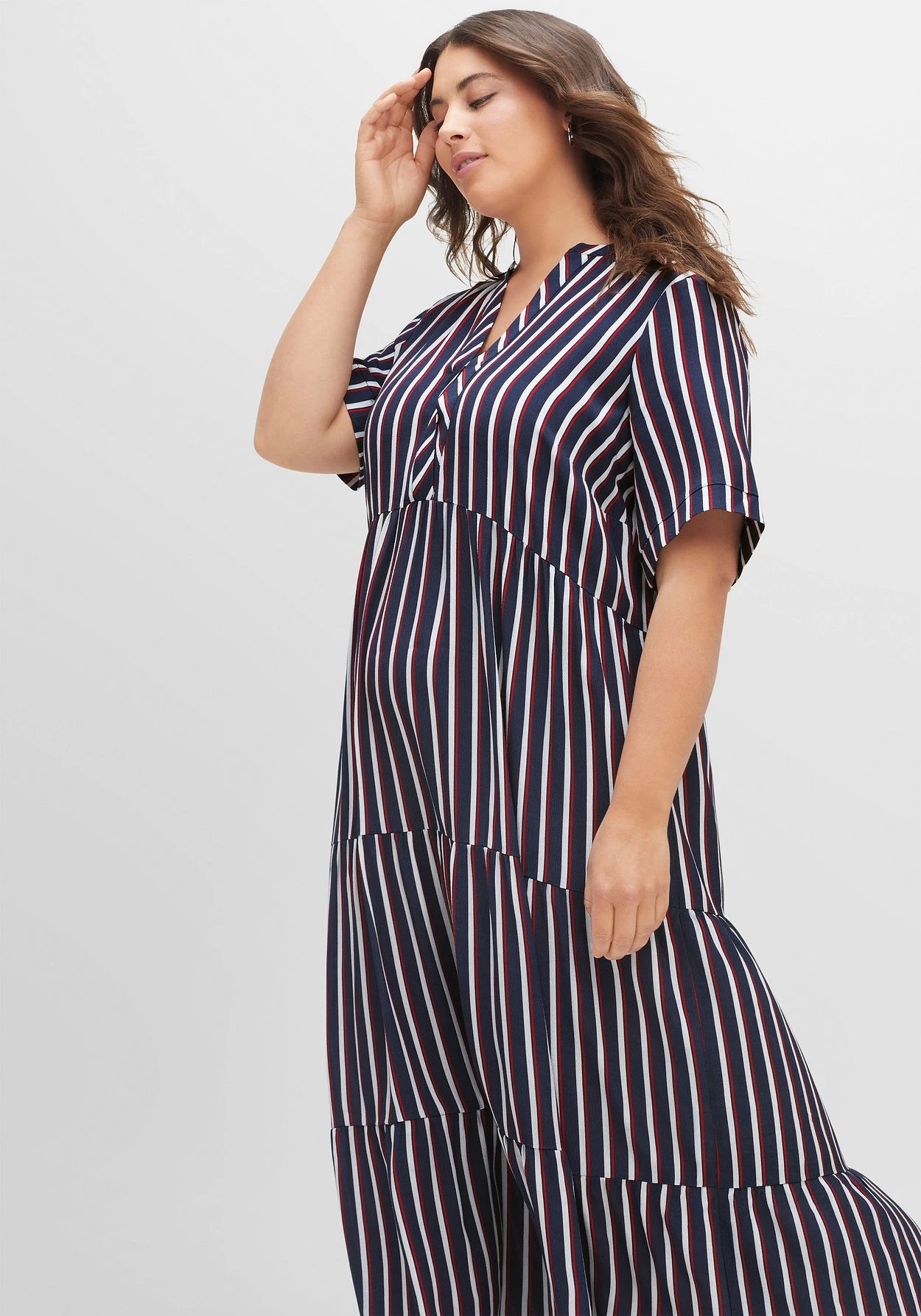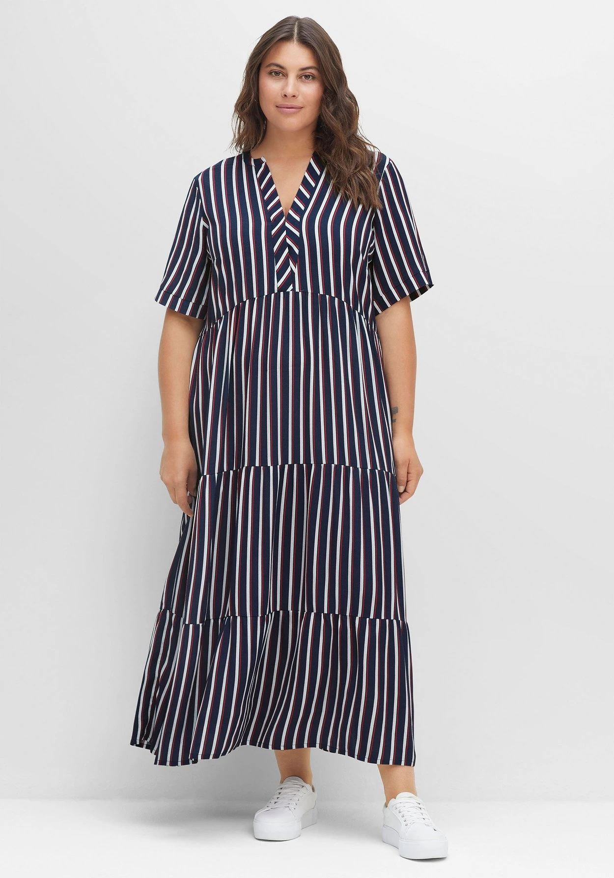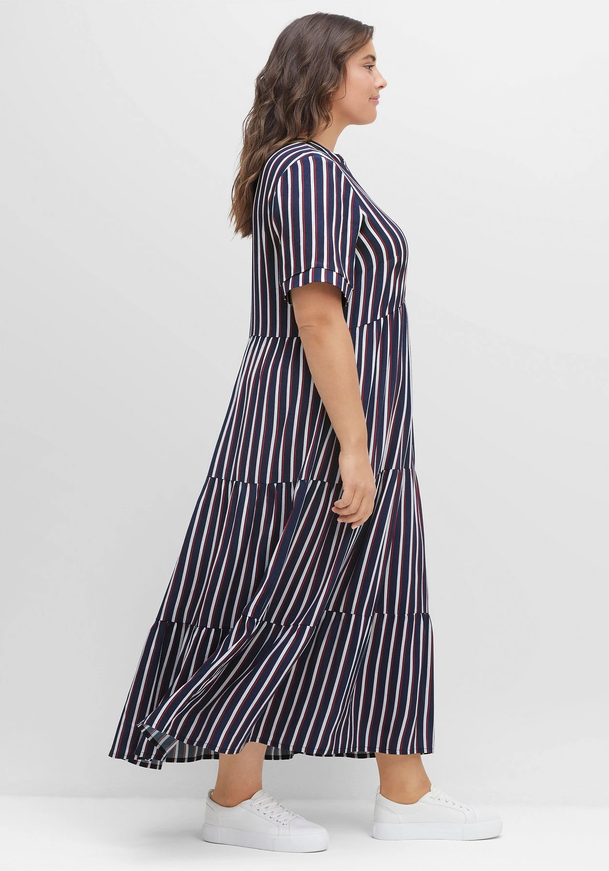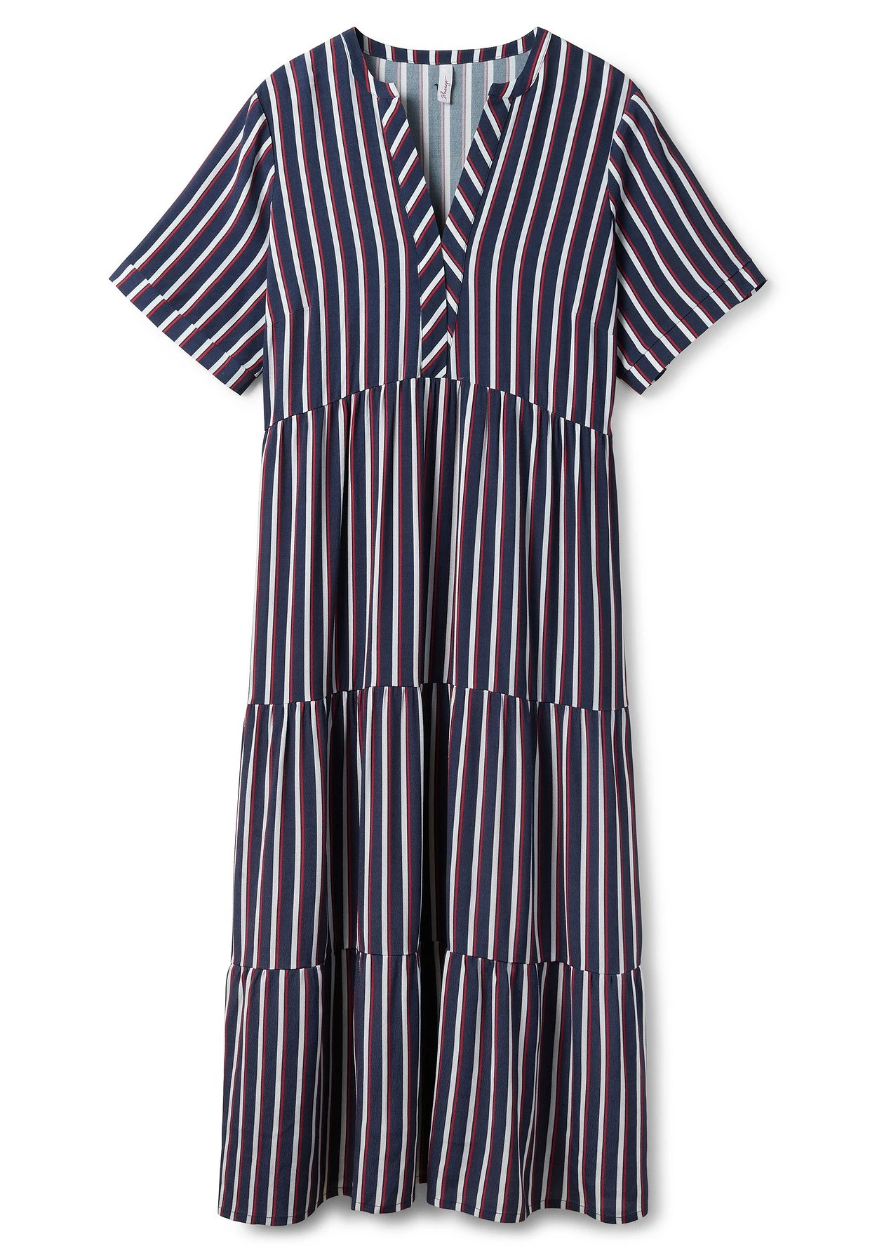 Maxikleid in Knöchellänge. Die Längsstreifen strecken optisch die Silhouette. Das zweifarbige Streifendessin und die entgegengesetzte Linienführung an den kurzen Ärmeln sowie am Ausschnitt brechen den Look modisch auf. Dank des stufigen Volants schwingt der Rock mit jedem Schritt schön mit.