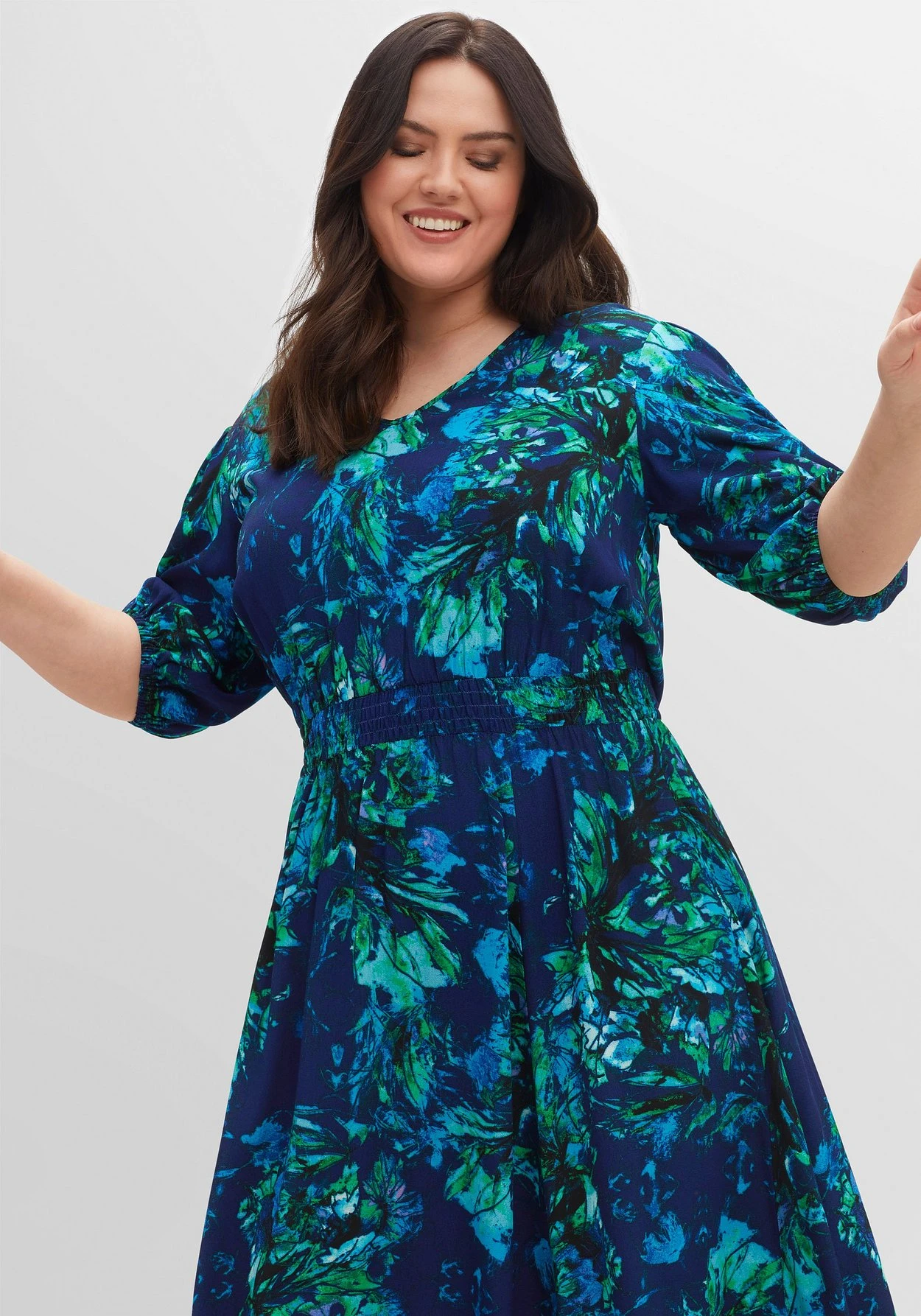 Kleid in Maxilänge. Der wunderschöne Blumenprint und die verspielten Details lassen eine feminine und zugleich elegante Optik entstehen. Die 3/4-langen Ballonärmel erhalten durch den Gummizug modische Weite, der breite Smokbund definiert die Taille. Darunter schließt sich ein weit schwingender, bodenlanger Rock an.