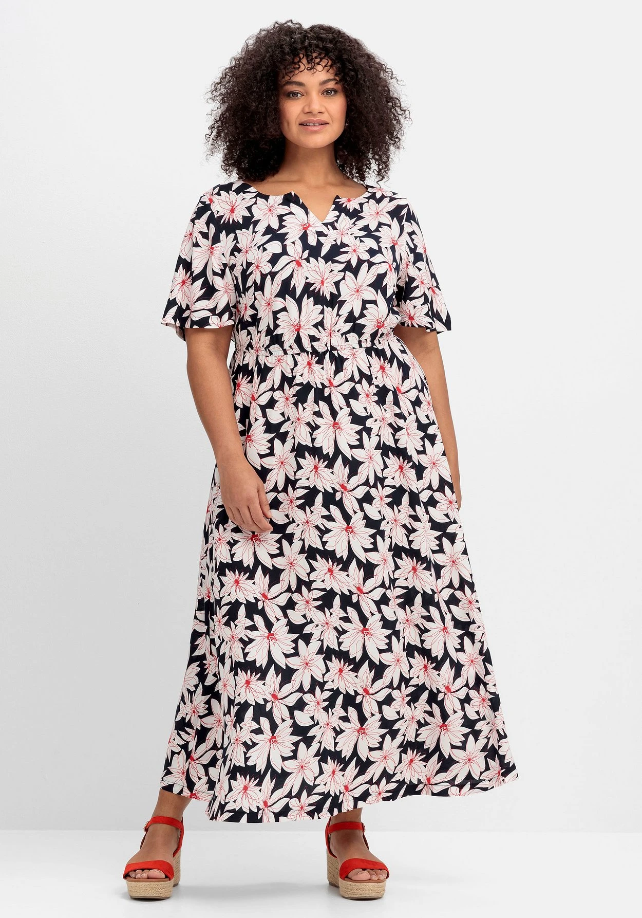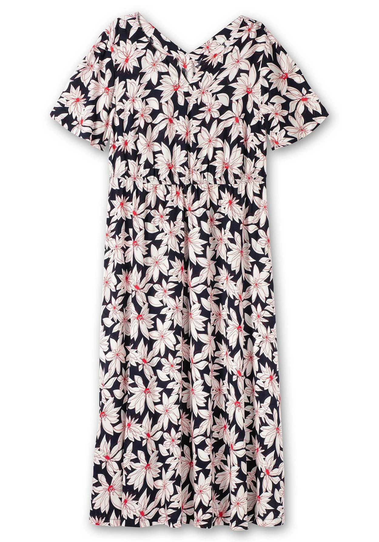 Kleid in Maxilänge. Der florale Alloverprint sorgt hier für sommerlich-entspannte Stimmung. Zum V-Cut am Ausschnitt vorn passt der V-Ausschnitt hinten. Ein bequemer Gummizugbund gibt der Silhouette Form, hinten lässt sich das Kleid mit einem Bindeband auf Taille bringen. Darunter schließt sich der weit schwingende Rock in Maxilänge an.