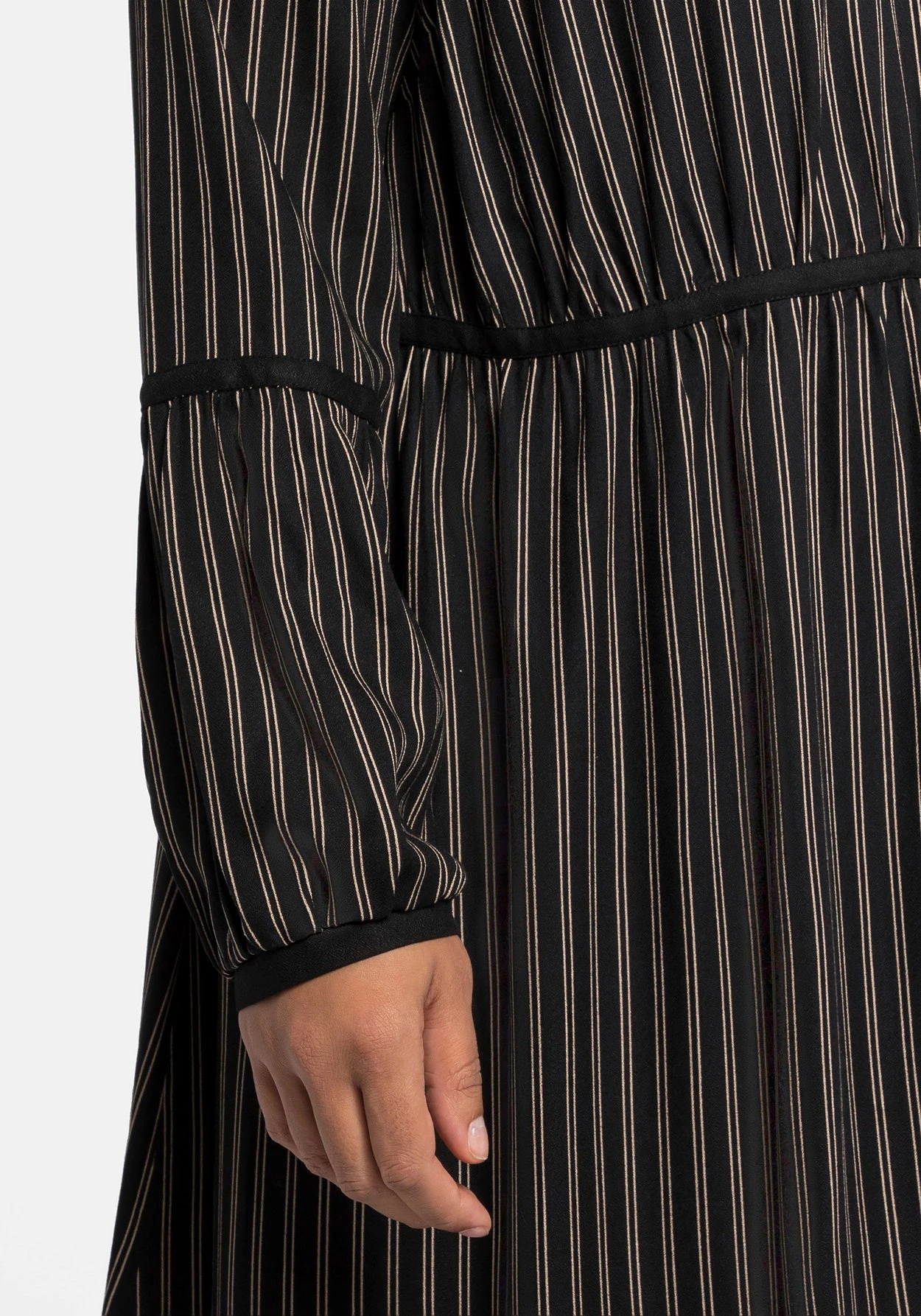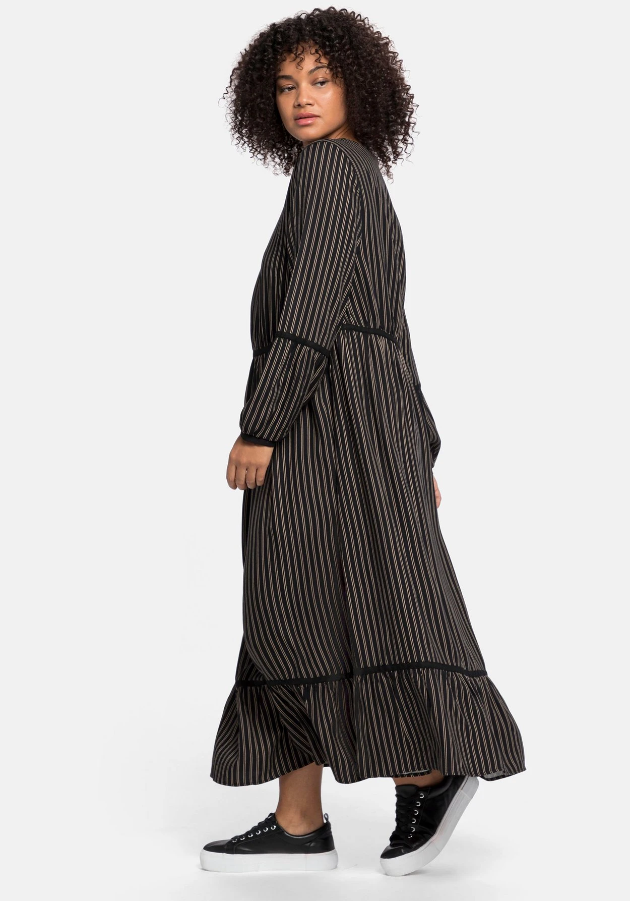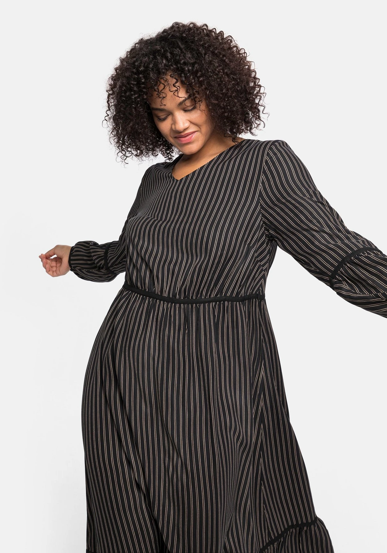 Langärmliges Maxikleid mit V-Ausschnitt. Dekorative Blenden unterbrechen das Streifenmuster und lassen so modische Spannung entstehen.