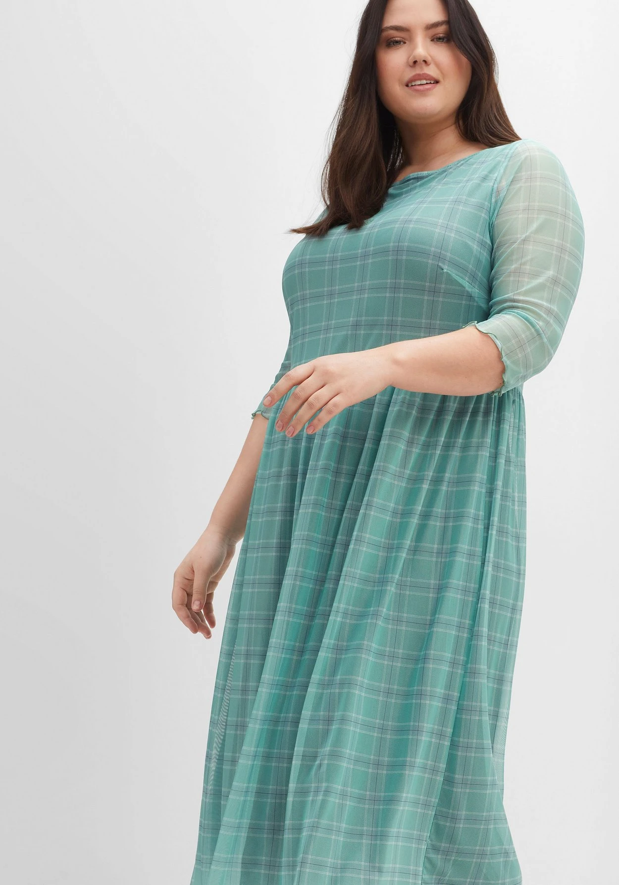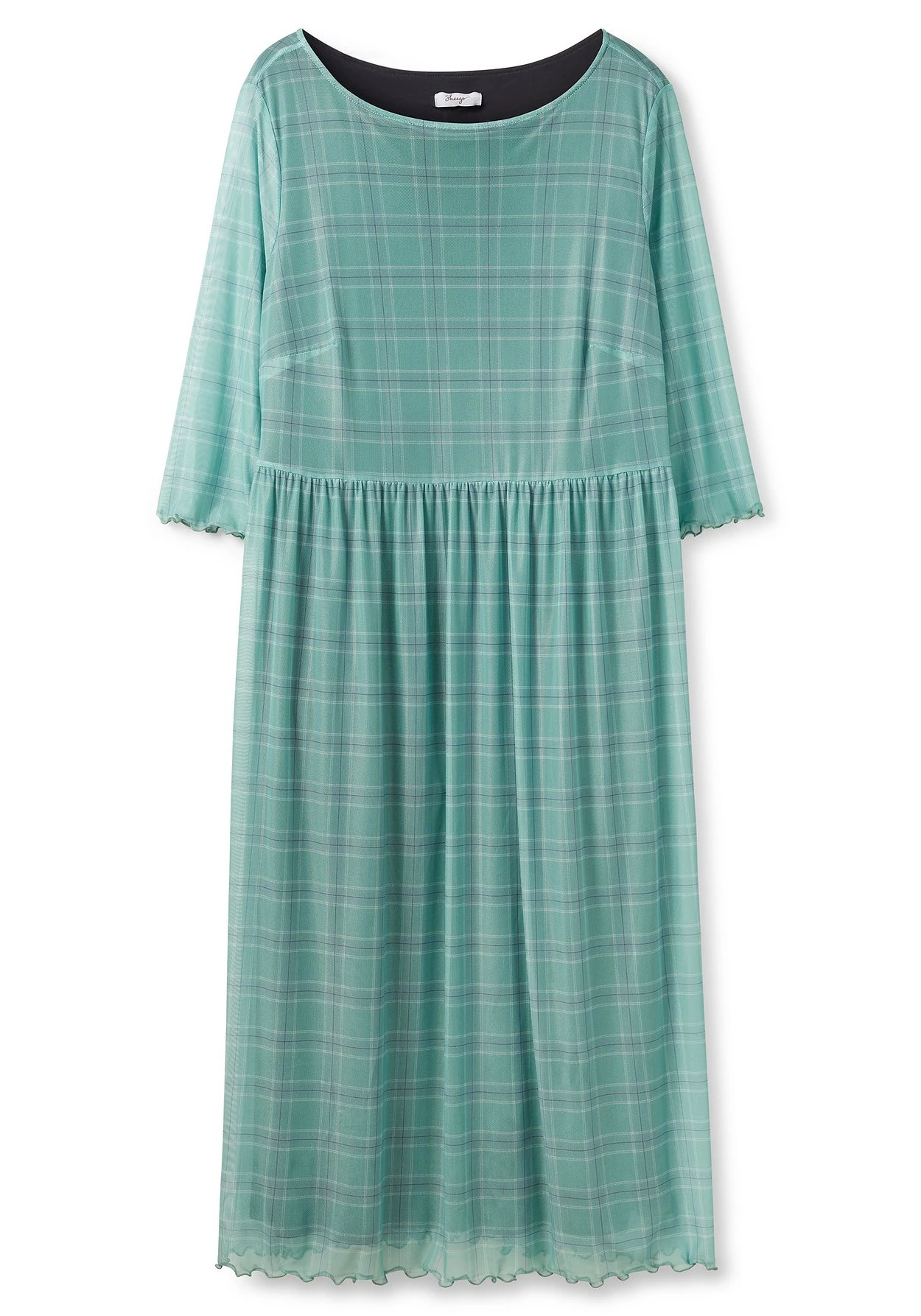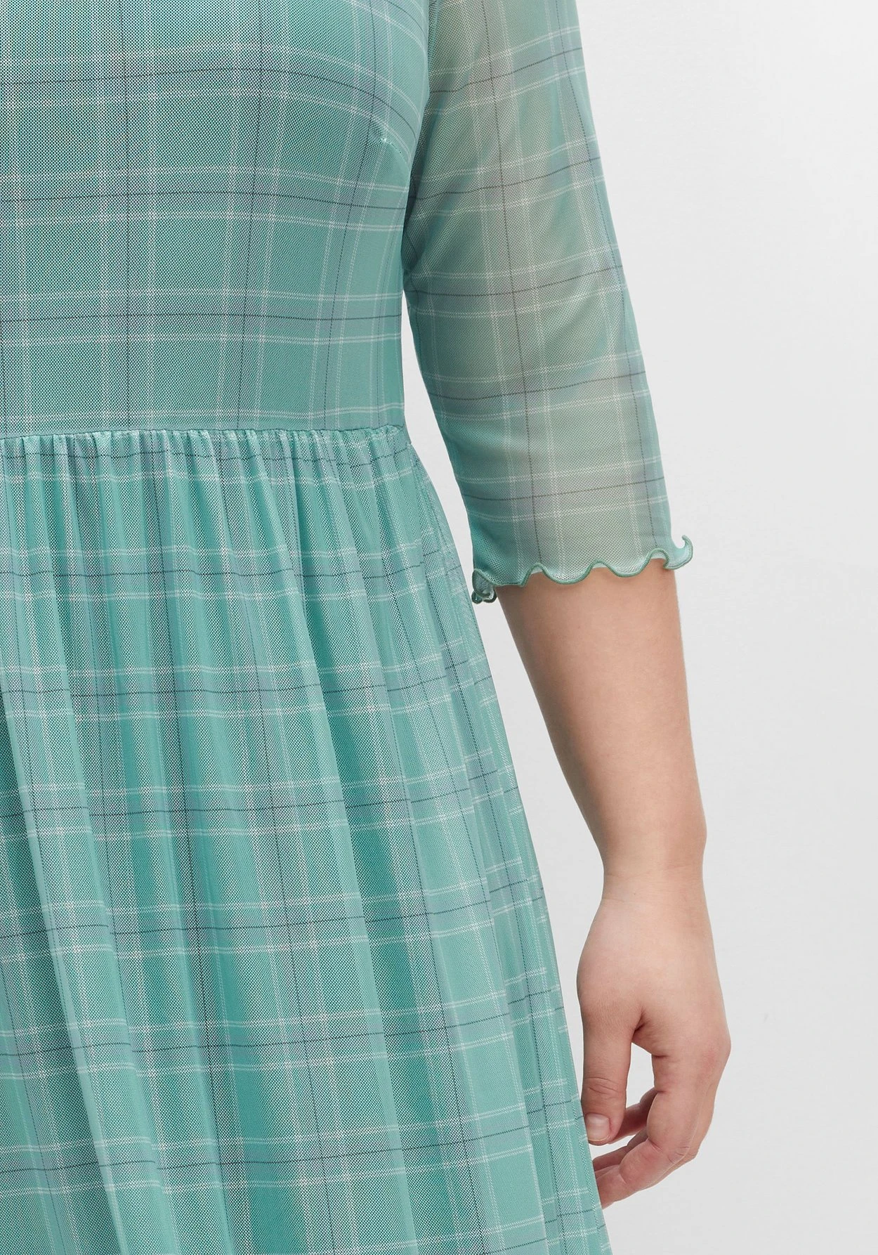 Fein kariertes Meshkleid. Der formschöne, etwas weitere Rundhalsausschnitt und die transparenten 3/4-Ärmel unterstreichen den femininen Auftritt. Durch den Babylocksaum am Arm und Saumabschluss erhält der Look eine zusätzliche verspielte Note. Die Körpermitte wird mit einer elastischen Taillennaht betont, der weit schwingende Rock fällt locker über die Silhouette.