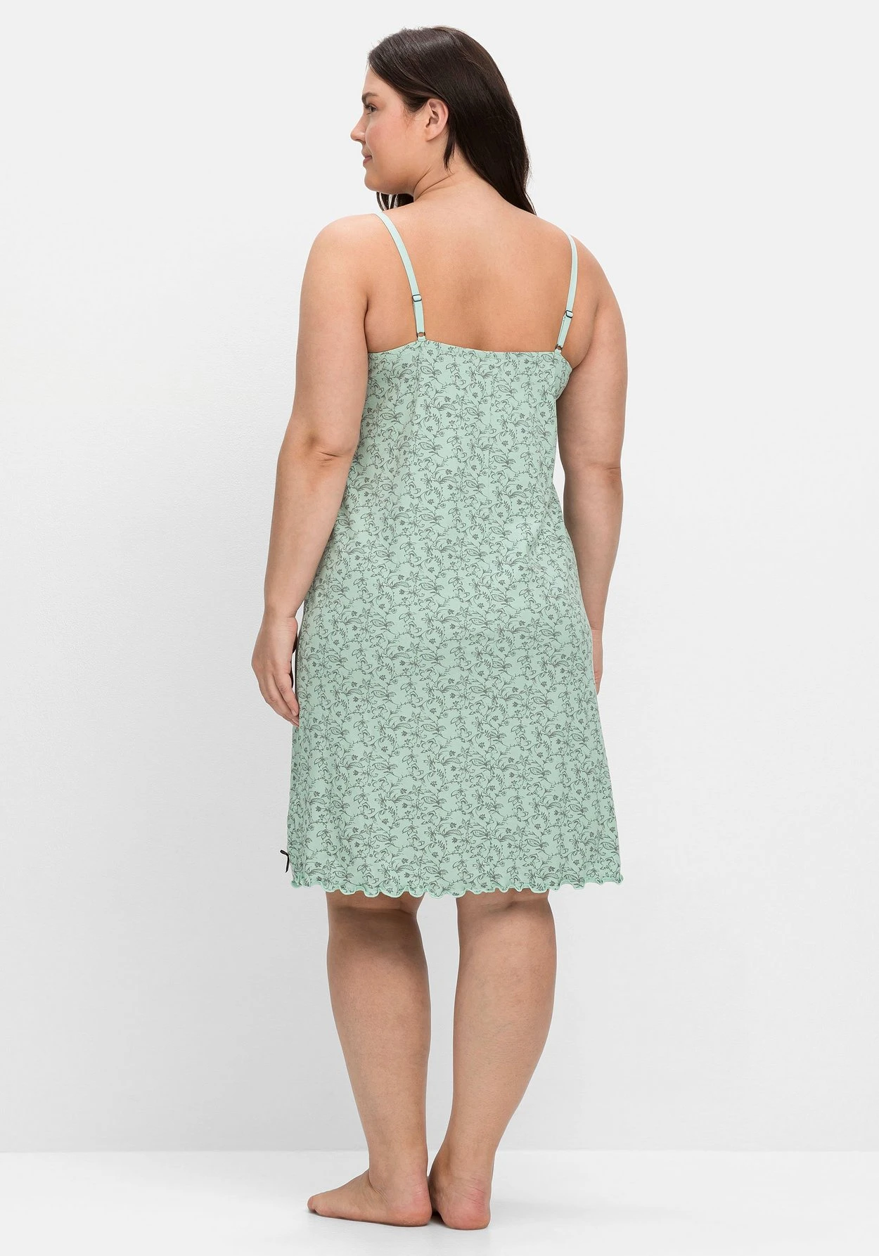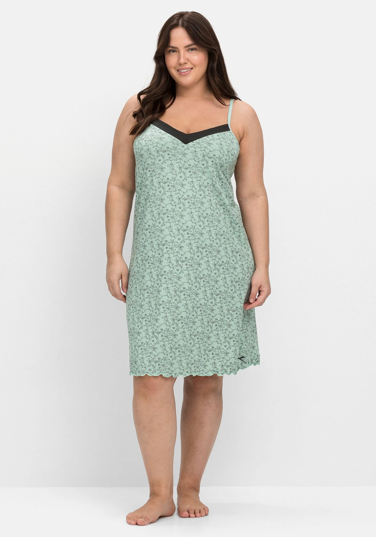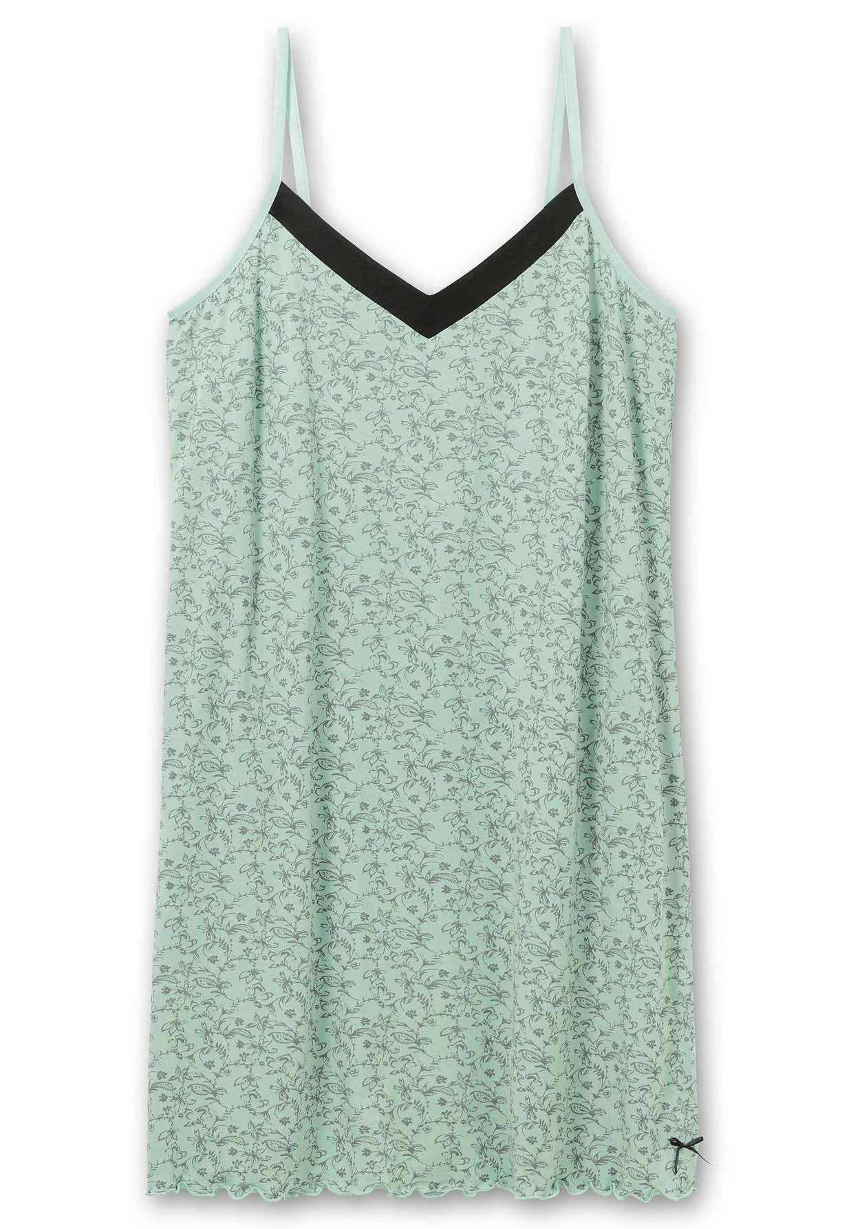 Nachthemd mit zartem floralem Print. Eine Kontrastblende vorn betont dekorativ den V-Ausschnitt und setzt einen farblichen Akzent. Das Nachthemd besitzt schmale Träger, die sich individuell in der Länge verstellen lassen. Der leicht gekräuselte Saumabschluss und die kleine schmückende Satinschleife darüber runden den Style feminin ab. Ein elastischer Gummizug im Rücken sorgt für den optimalen Sitz.