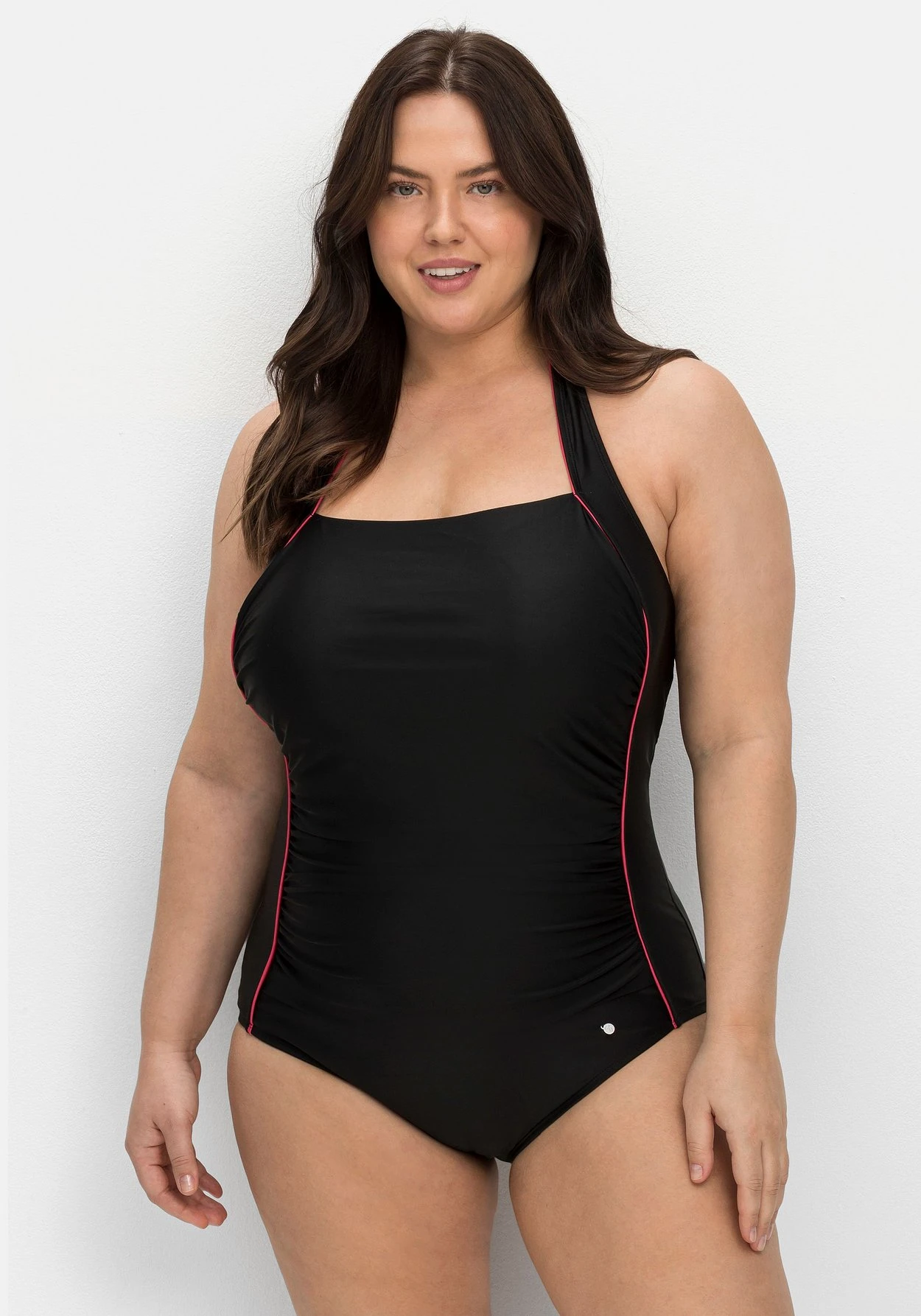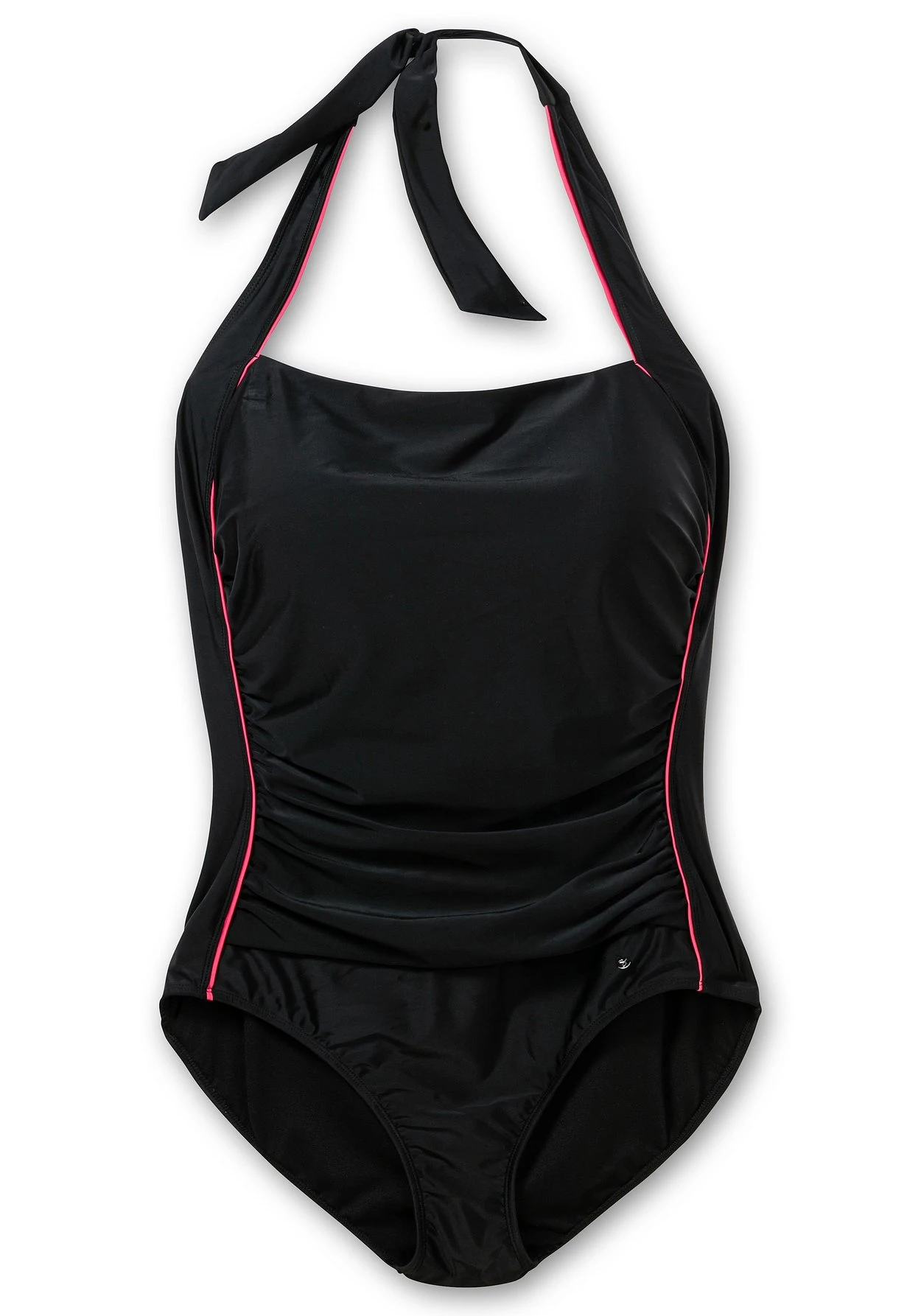 Badeanzug mit Neckholder-Trägern. Der schlichte, unifarbene Look erhält durch die kontrastfarbenen Paspeln eine sportive Note. Die wattierten Softcups und das Unterbrustgummi formen das Dekolleté und geben gleichzeitig Halt. Dazu überzeugt der hohe Rückenausschnitt.