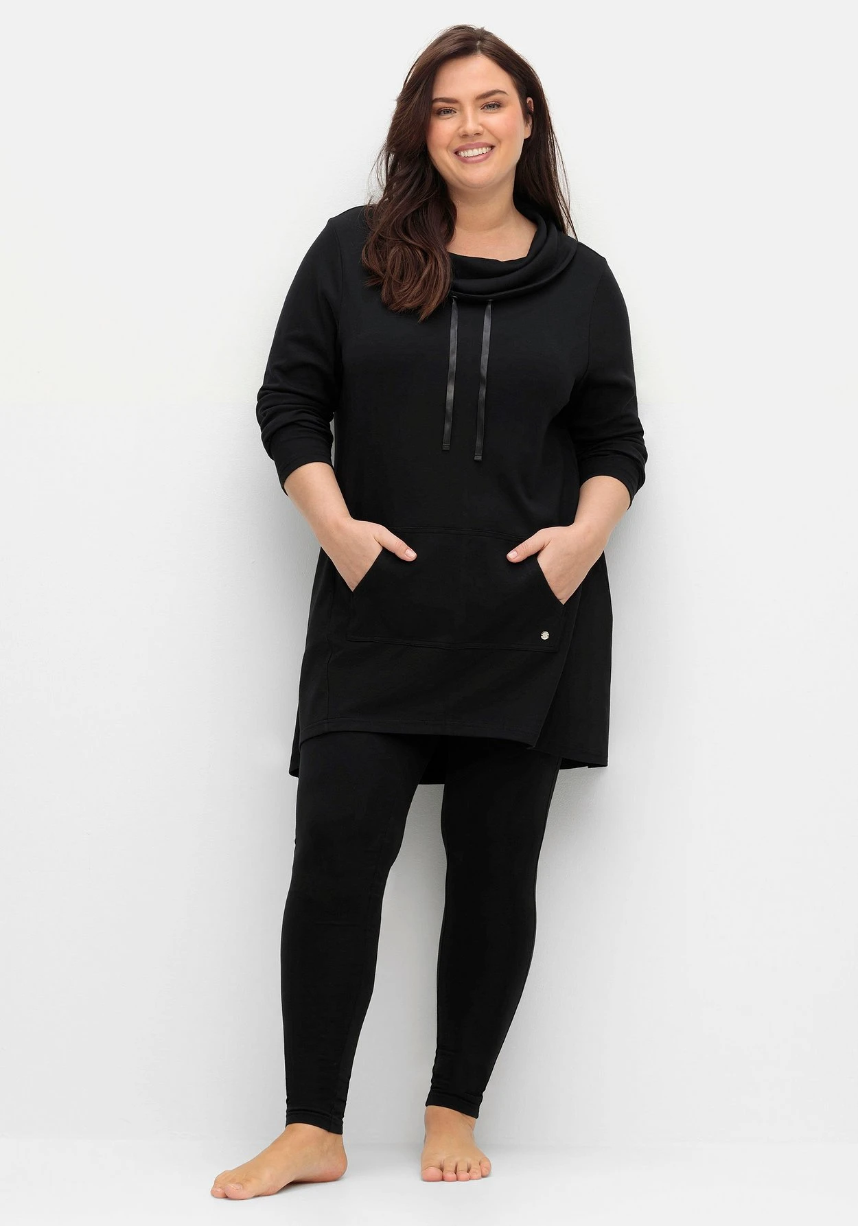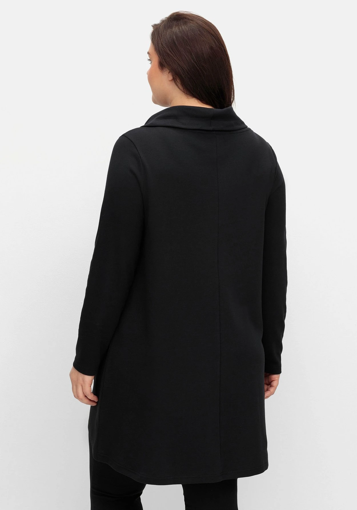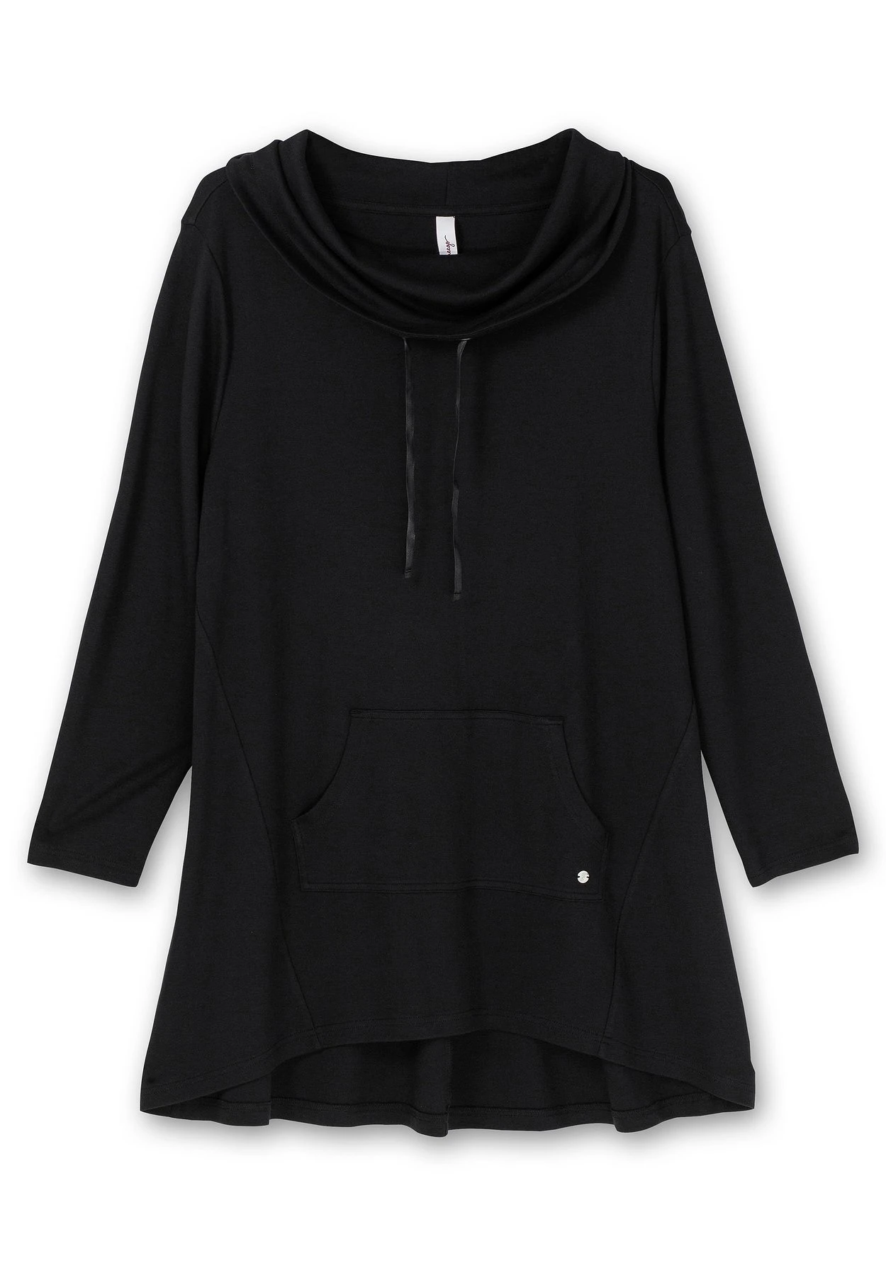 Longshirt in Oversizedform, ideal zum Relaxen. Das Shirt besitzt einen überlappend geschnittenen Stehkragen mit Bindeband sowie eine praktische Kängurutasche. Der gerundete Saum ist hinten länger als vorn, die bequeme A-Linie umspielt locker die Bauchpartie.