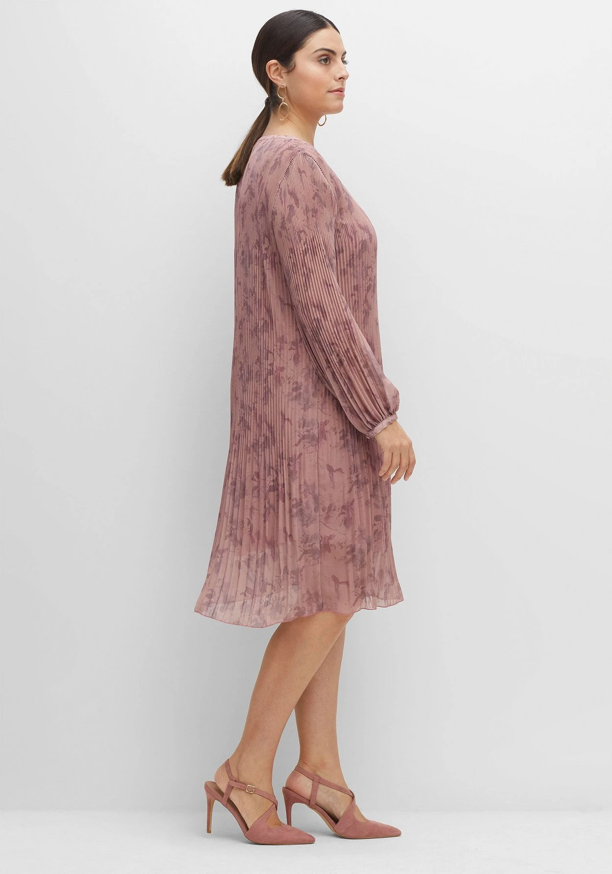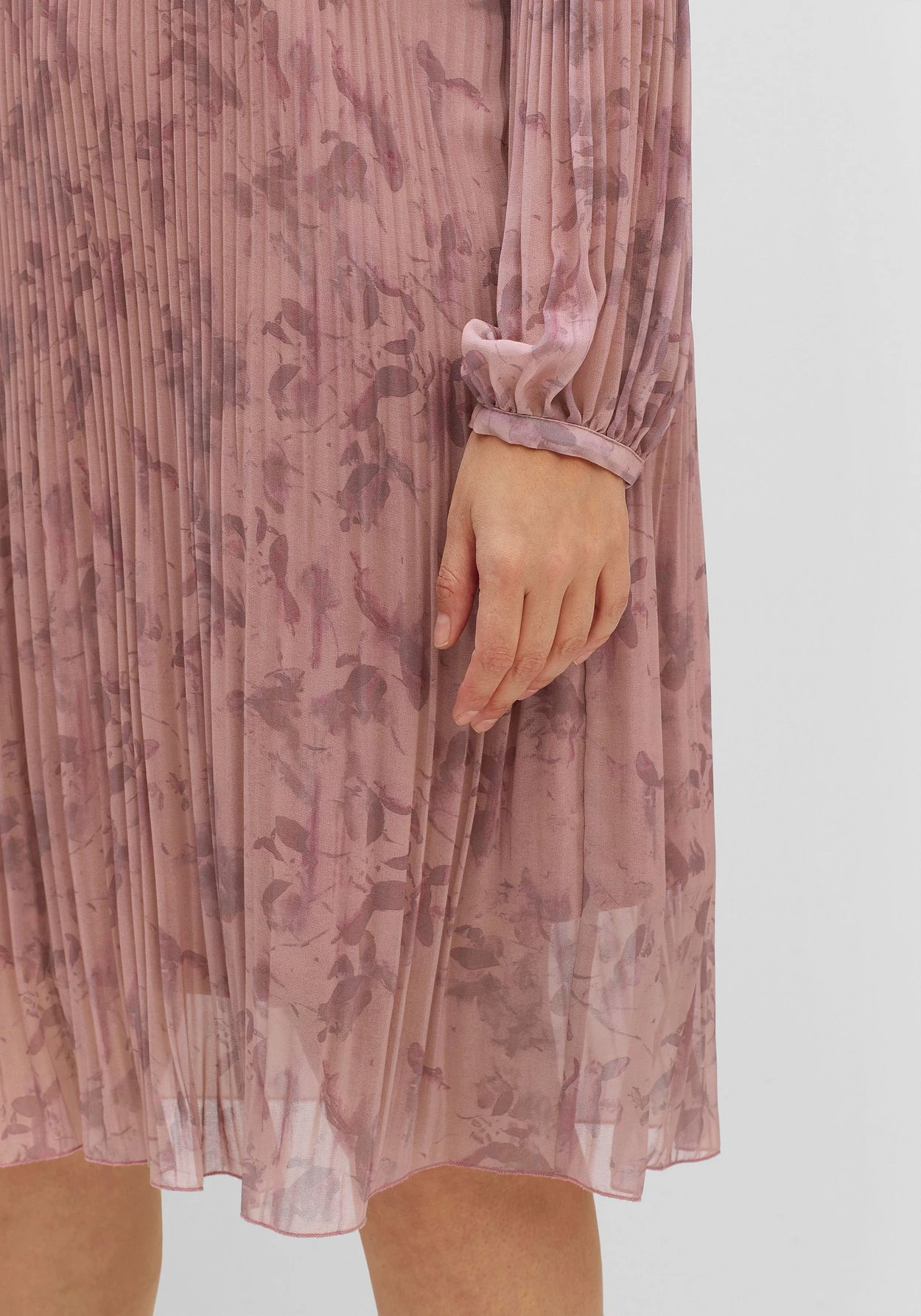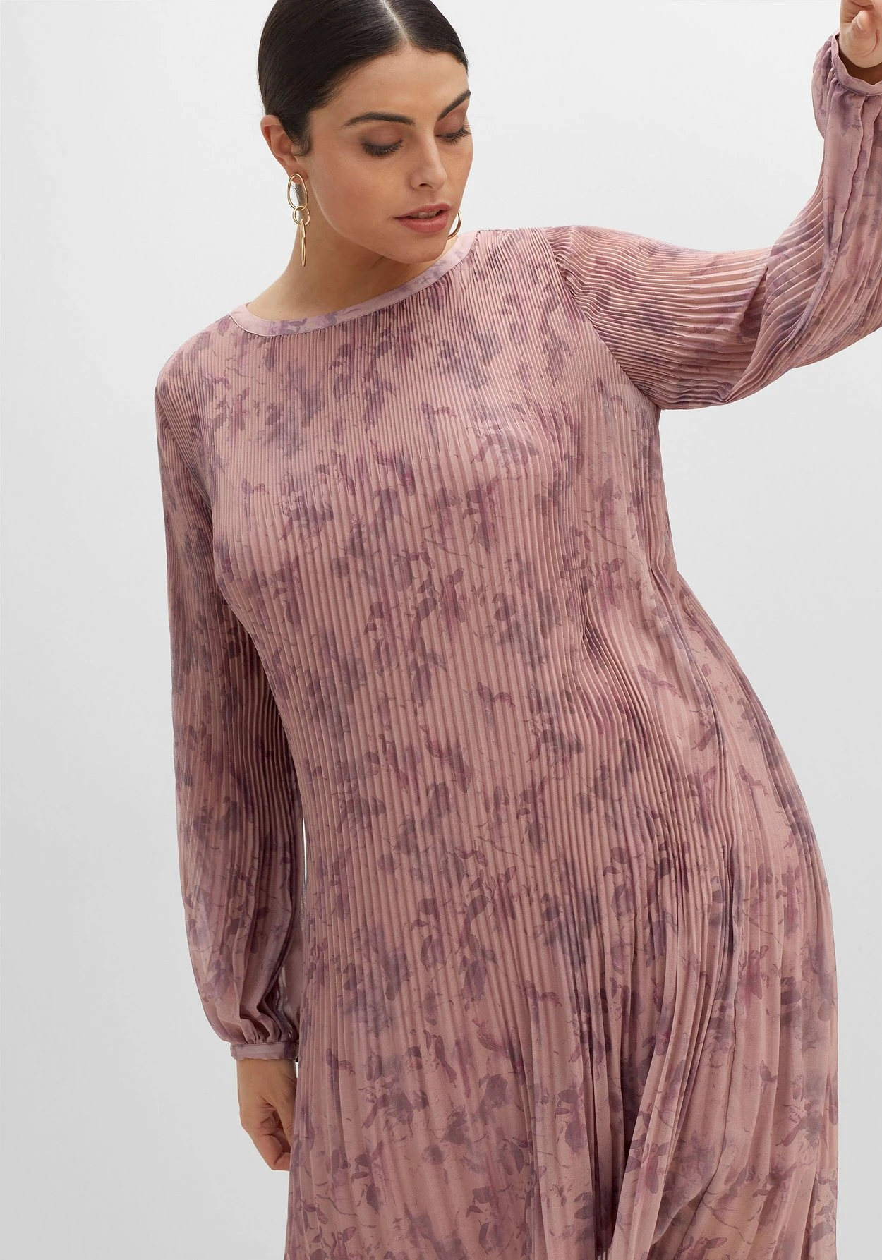Abendlicher Look aus zartem, allover bedrucktem Chiffon. Das feine Plisseekleid mit nach unten hin aufspringenden Falten schwingt wunderschön bei jedem Schritt. Dazu rückt die knieumspielende Länge die Beine verführerisch in den Fokus. Die langen Ärmel sind ebenfalls plissiert und schließen mit schmaler Manschette, einem Schlitz und Knopfverschluss ab.
