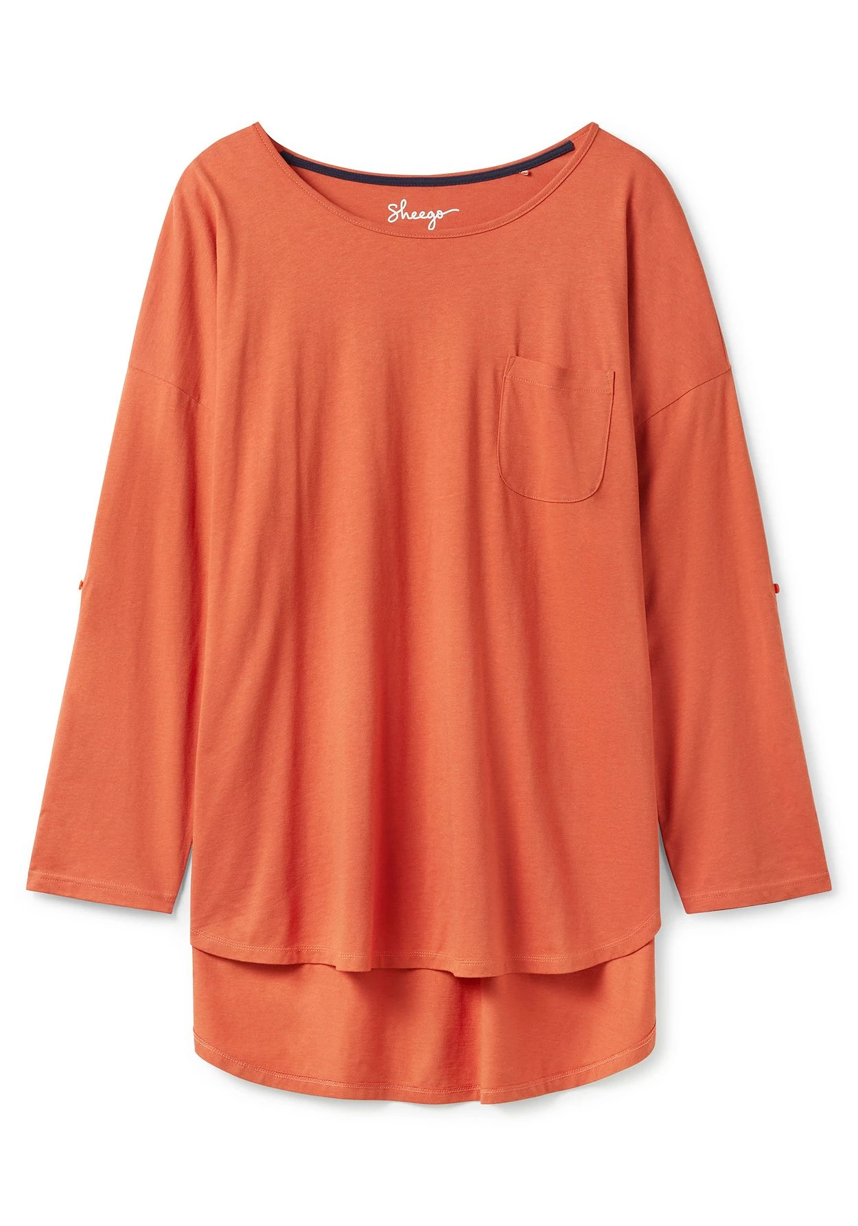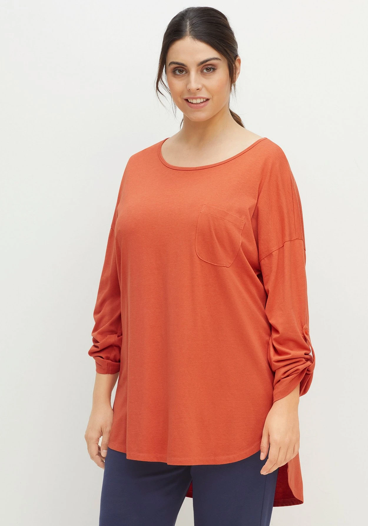Longshirt zum Relaxen. Das bequeme Shirt zeigt sich mit Krempelriegeln am Ärmel. Für Tragekomfort sorgt auch der verlängerte Rücken, der besonders der Po-Partie schmeichelt. Eine Brusttasche und seitliche Kontrastnähte runden den Wohlfühl-Look perfekt ab.