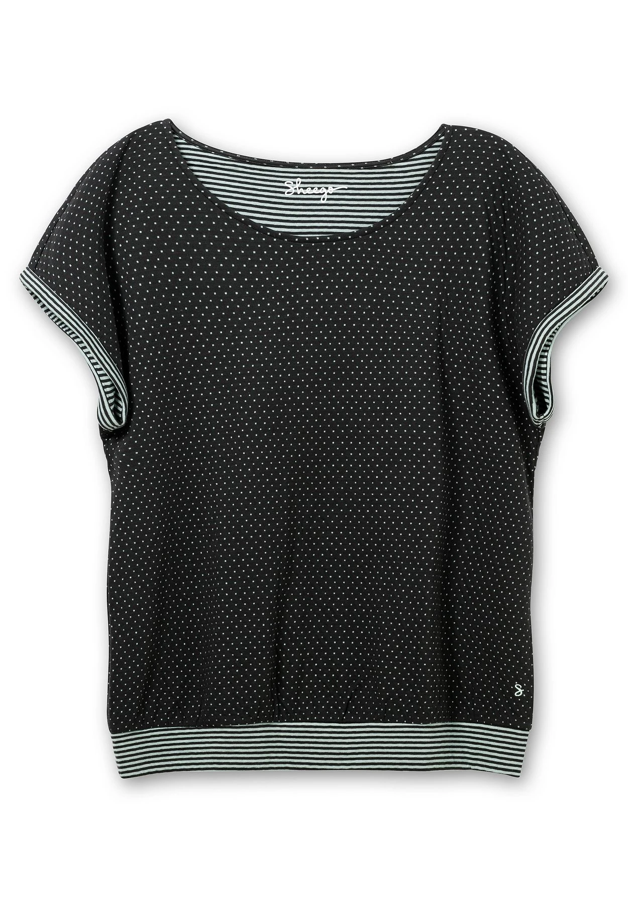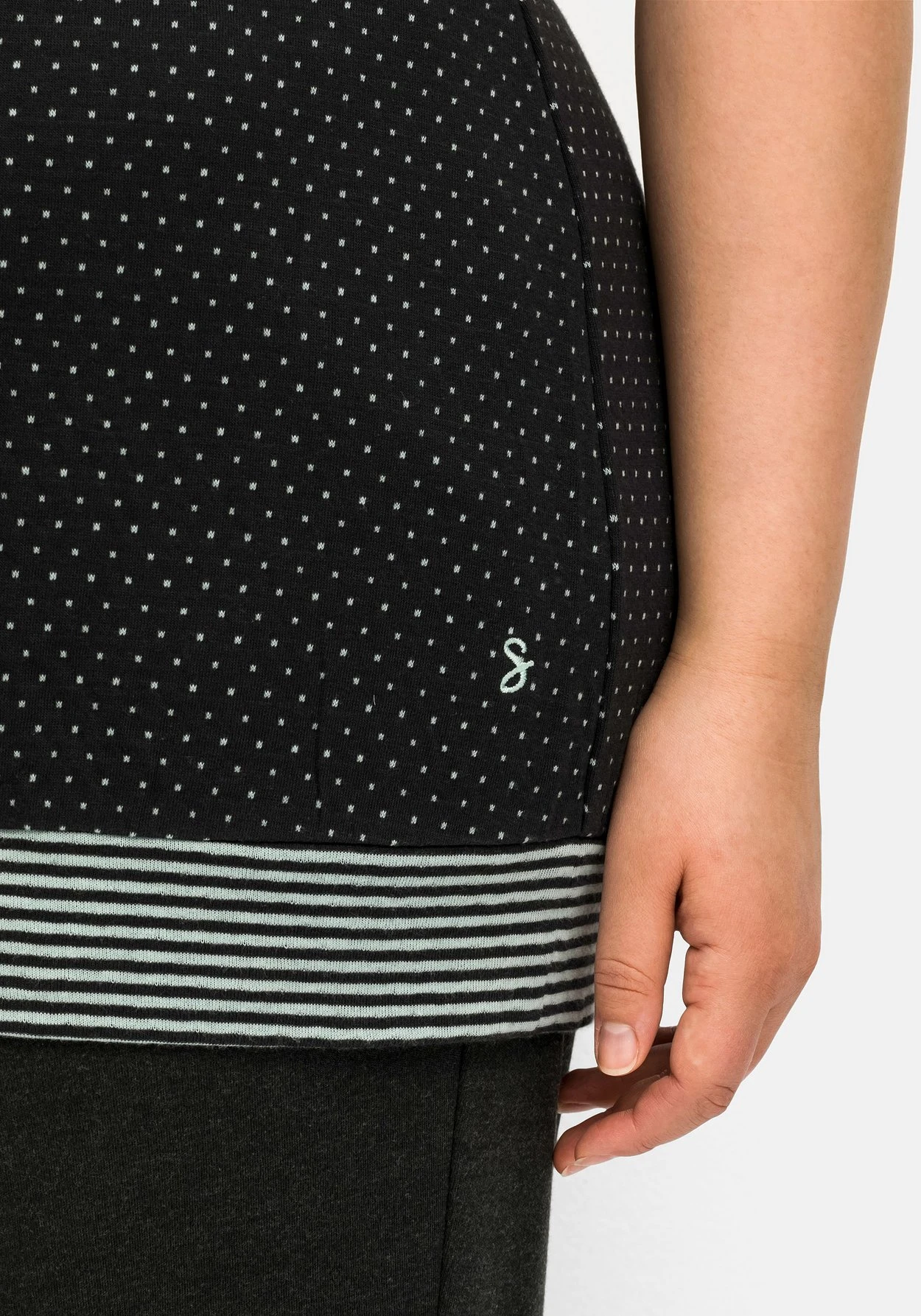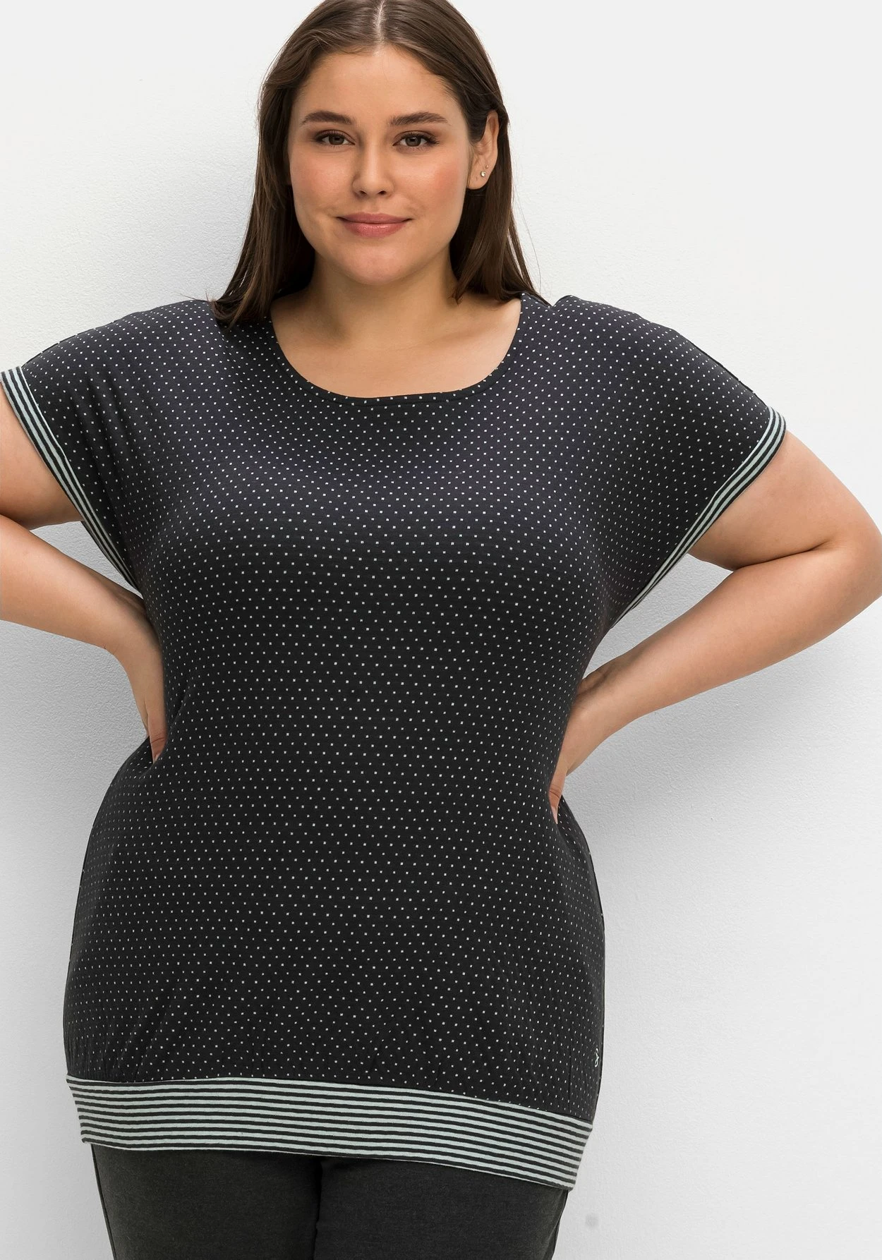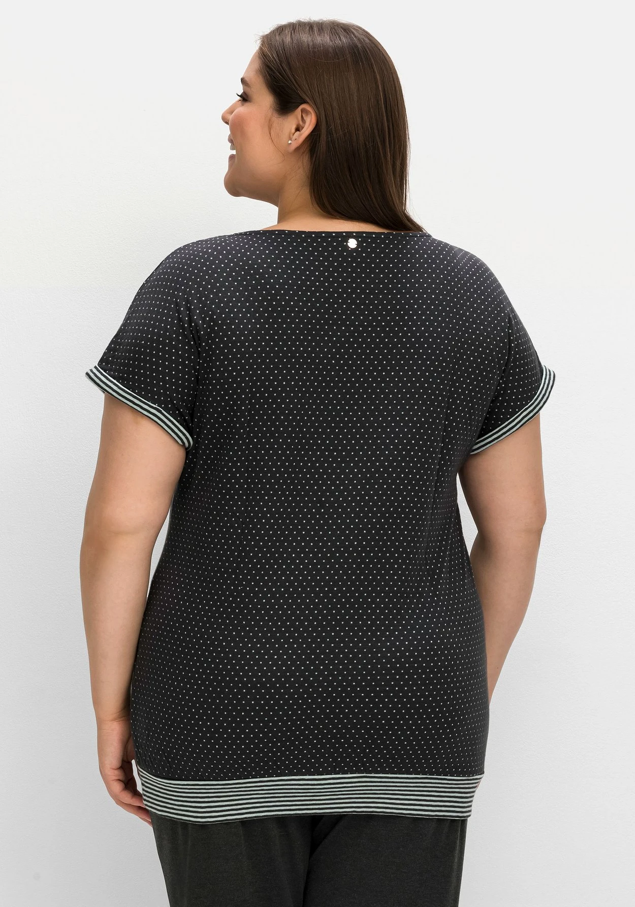 Relax-Shirt im Mustermix. Die besondere Optik entsteht durch den charmanten Mix aus Pünktchendruck und geringelten Partien. Die Schultern sind lässig überschnitten, die Ärmel enden mit fixiertem Umschlag. Der figurumspielende Schnitt findet im elastischen Saumbündchen ein modisches Finish und macht das Shirt zum idealen Homewear-Partner.