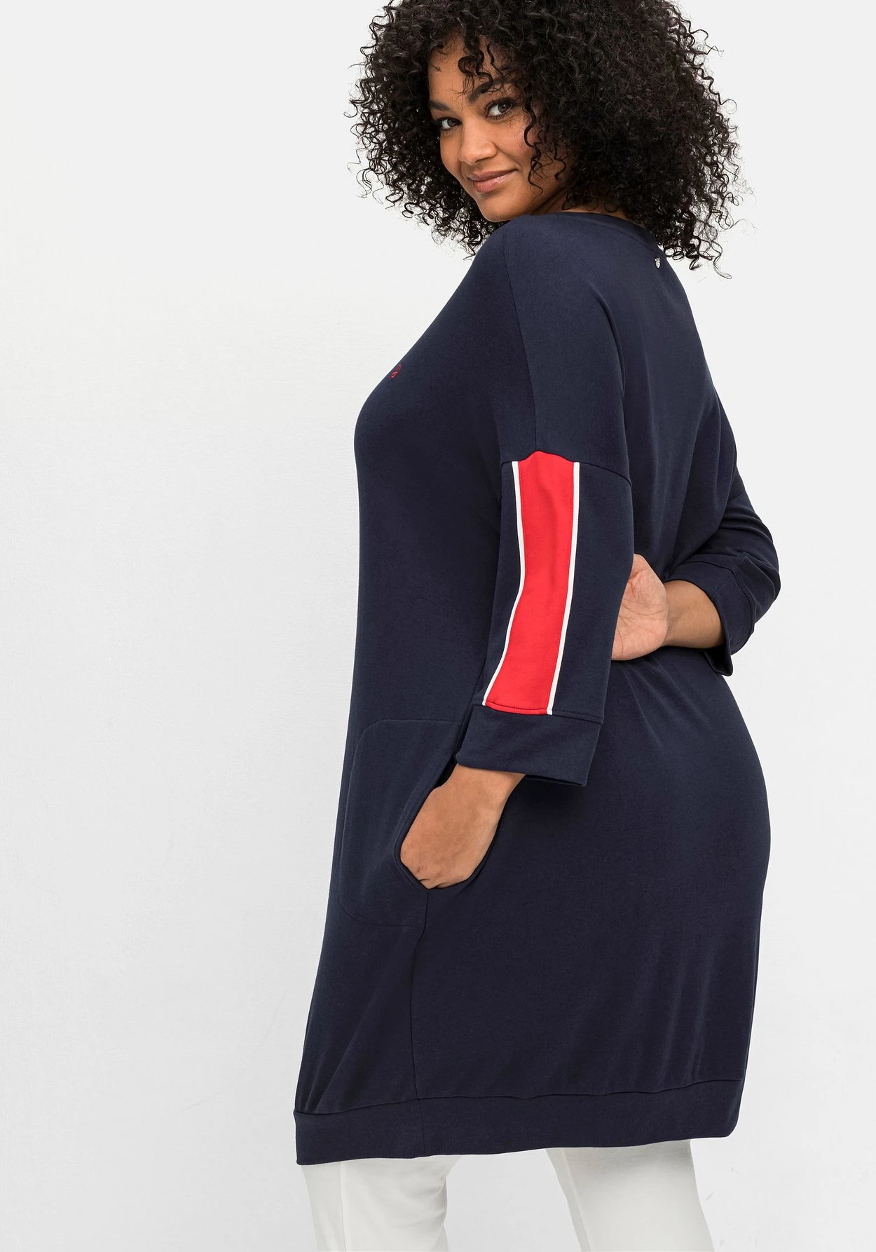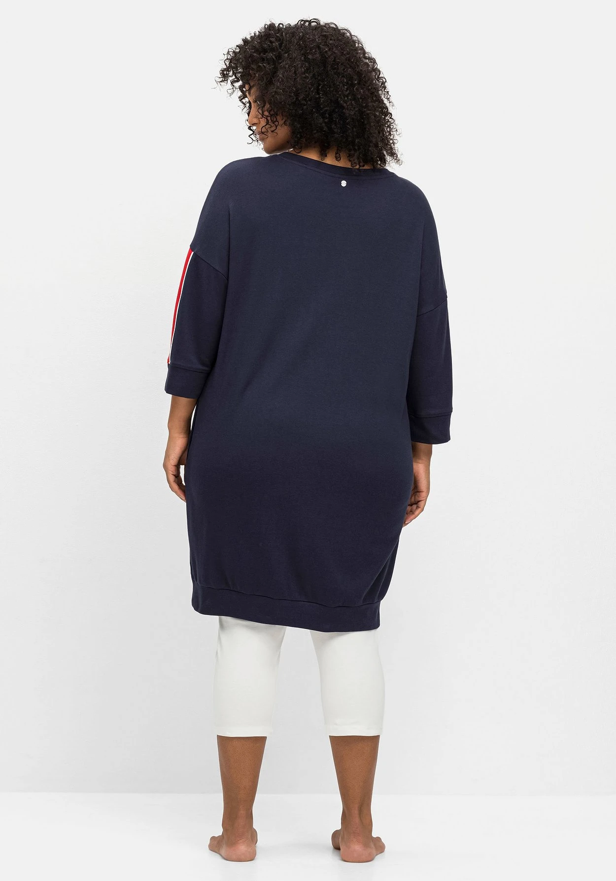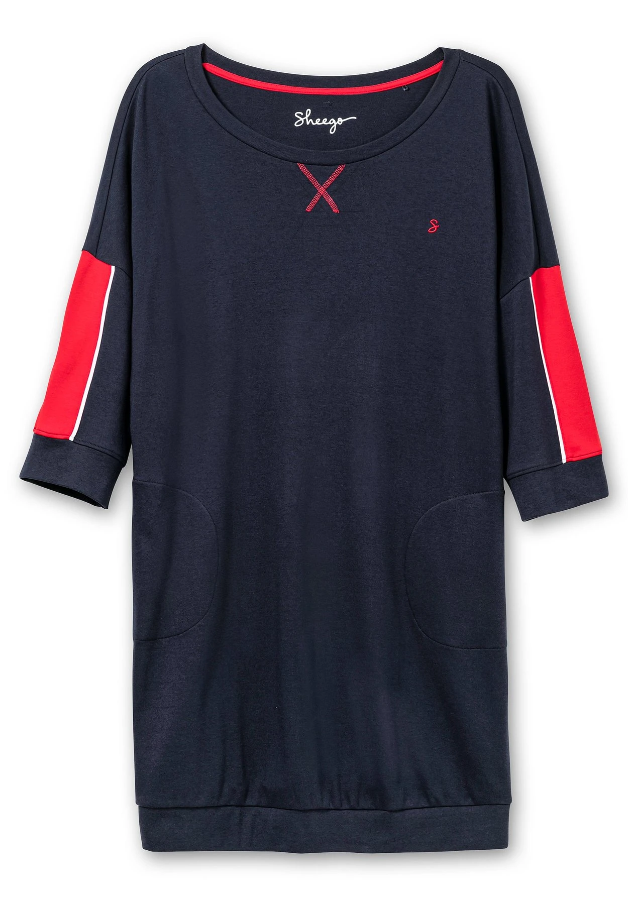 Relax-Shirtkleid mit kleiner Bruststickerei. Eyecatcher ist der sportive Kontraststreifen seitlich am Arm. Überschnittene Schultern und 3/4-Ärmel unterstreichen die legere Optik, zwei seitliche Taschen sowie elastische Ärmel- und Saumbündchen ergänzen den entspannten Homewear-Look.
