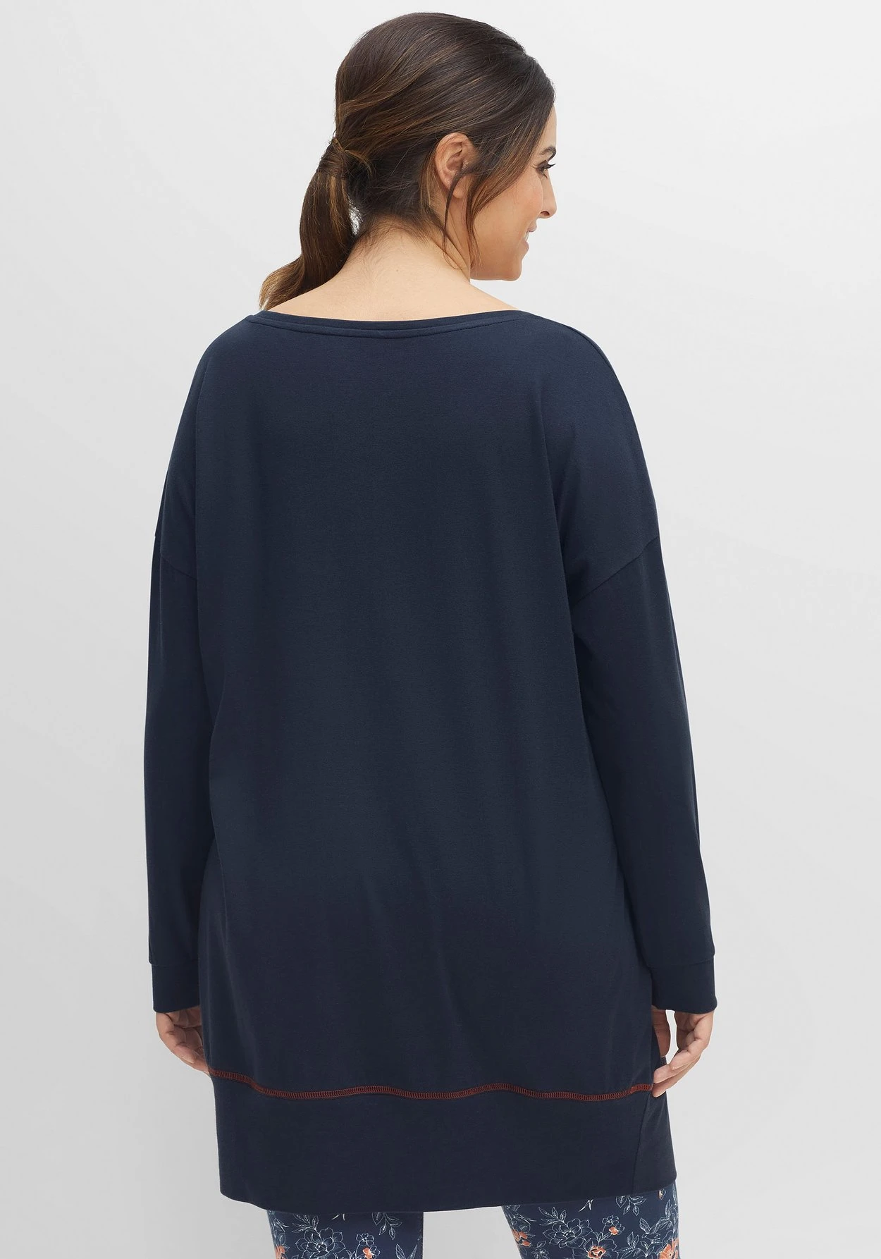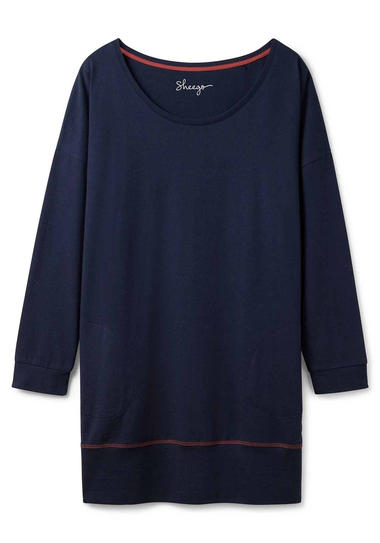 Shirtkleid zum Relaxen, mit weitem Rundhalsausschnitt. Für Lässigkeit sorgen die überschnittenen Schultern. Ein extrabreiter Gummibund am Saum verleiht dem Kleid mehr Bequemlichkeit. Dazu akzentuiert die dekorative Kontrast Flatlocknaht am Saum den cleanen Look. Praktische Eingrifftaschen runden den Style ab. Ein rundum entspannter Homewear-Look!