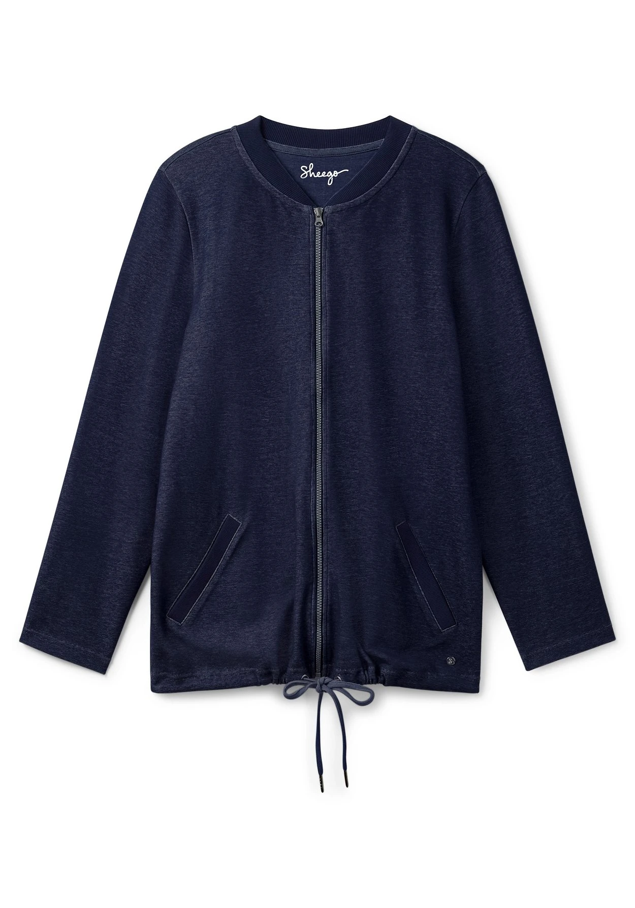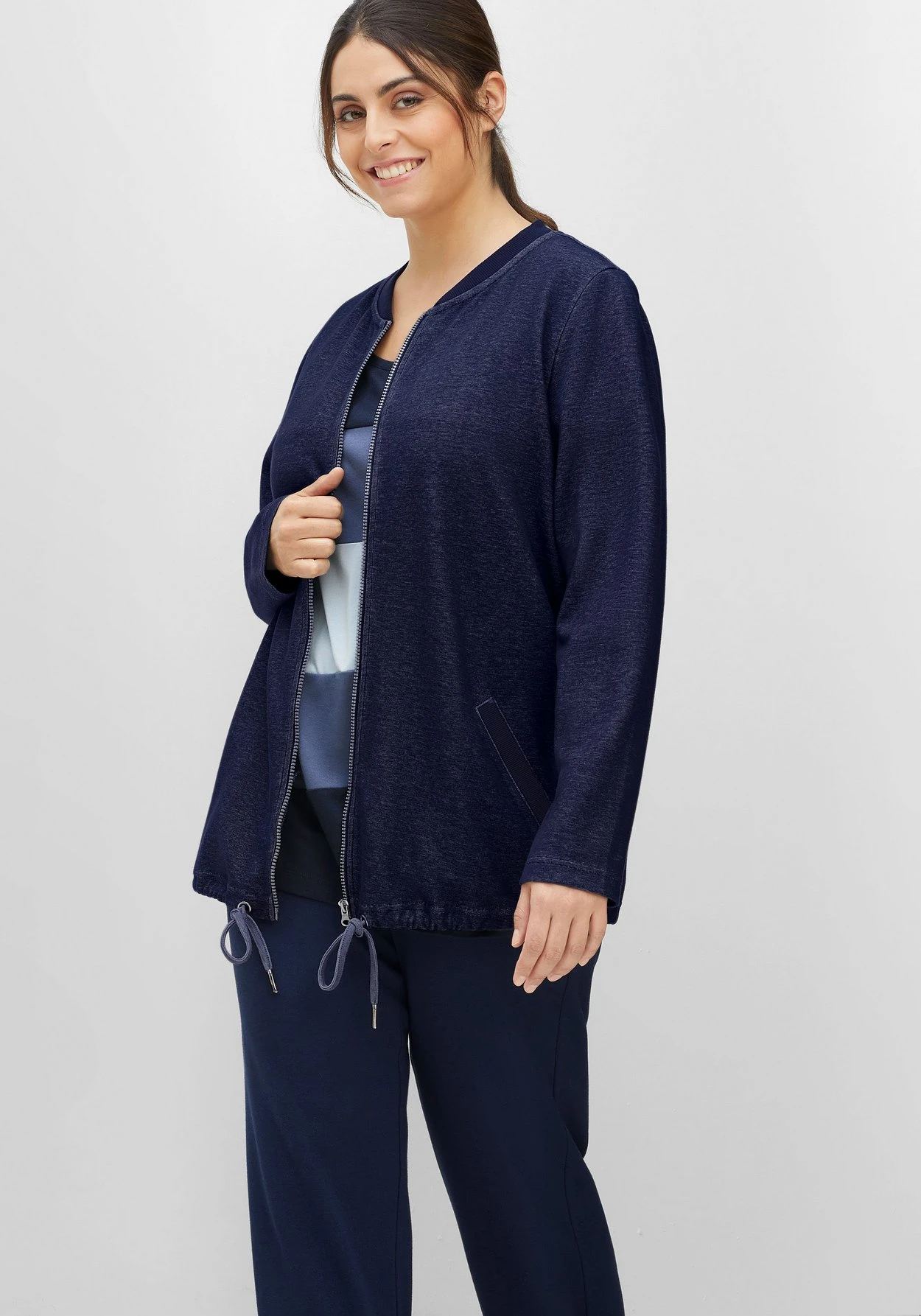 Relax-Sweatjacke. Für den sportiven Look sorgt der Tunnelzug am Saum, die etwas längeren Ärmel lassen sich locker aufkrempeln. Die Jacke ist in Double-Face-Qualität gearbeitet – außen Indigofarben, innen in Marine. Kragen und Eingrifftaschen in gerippter Qualität ergänzen das lässige Design.