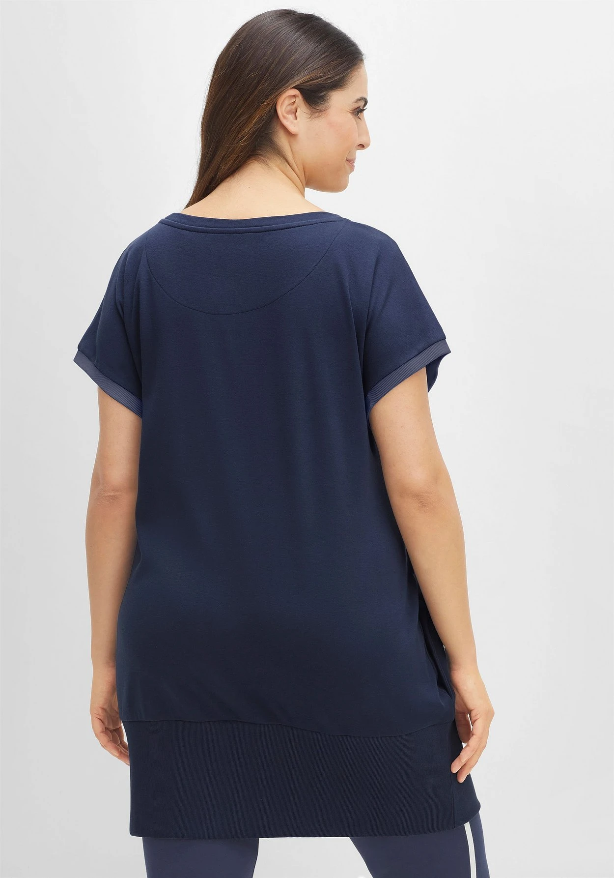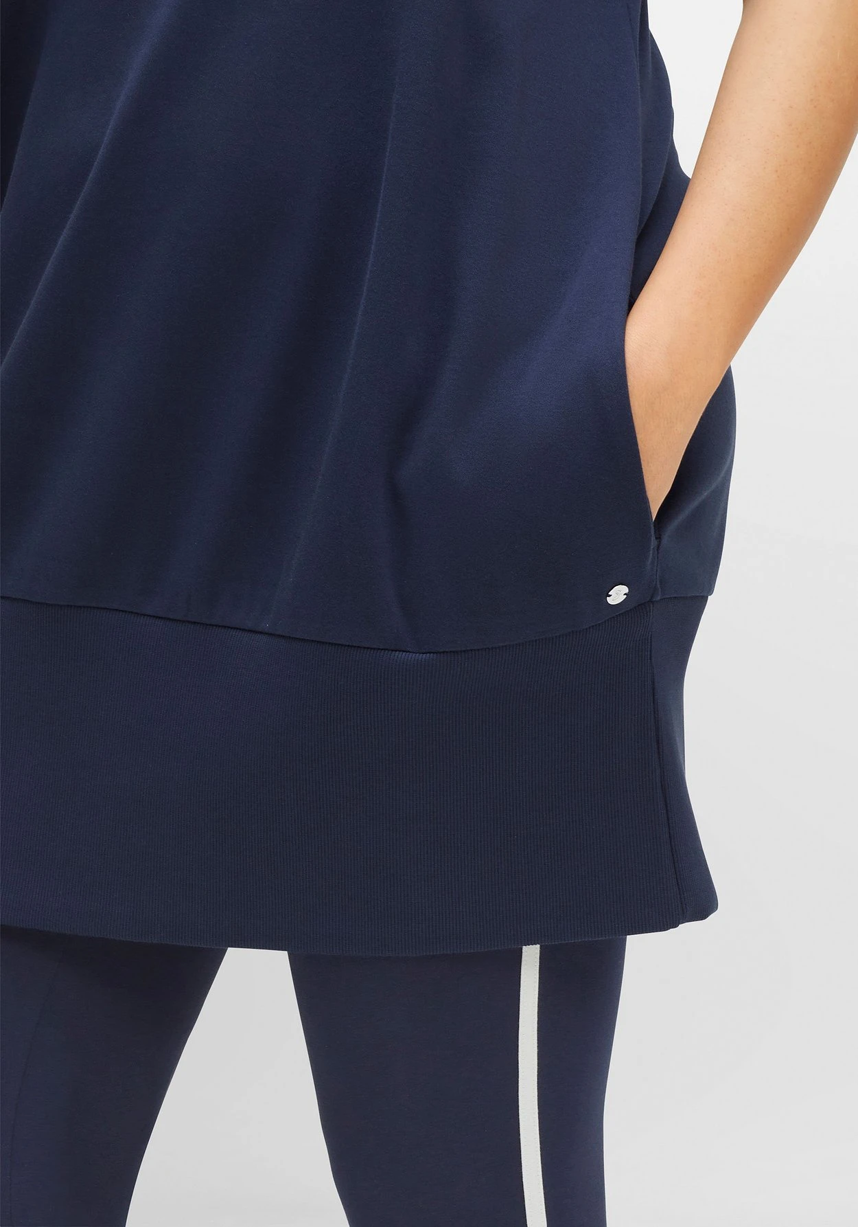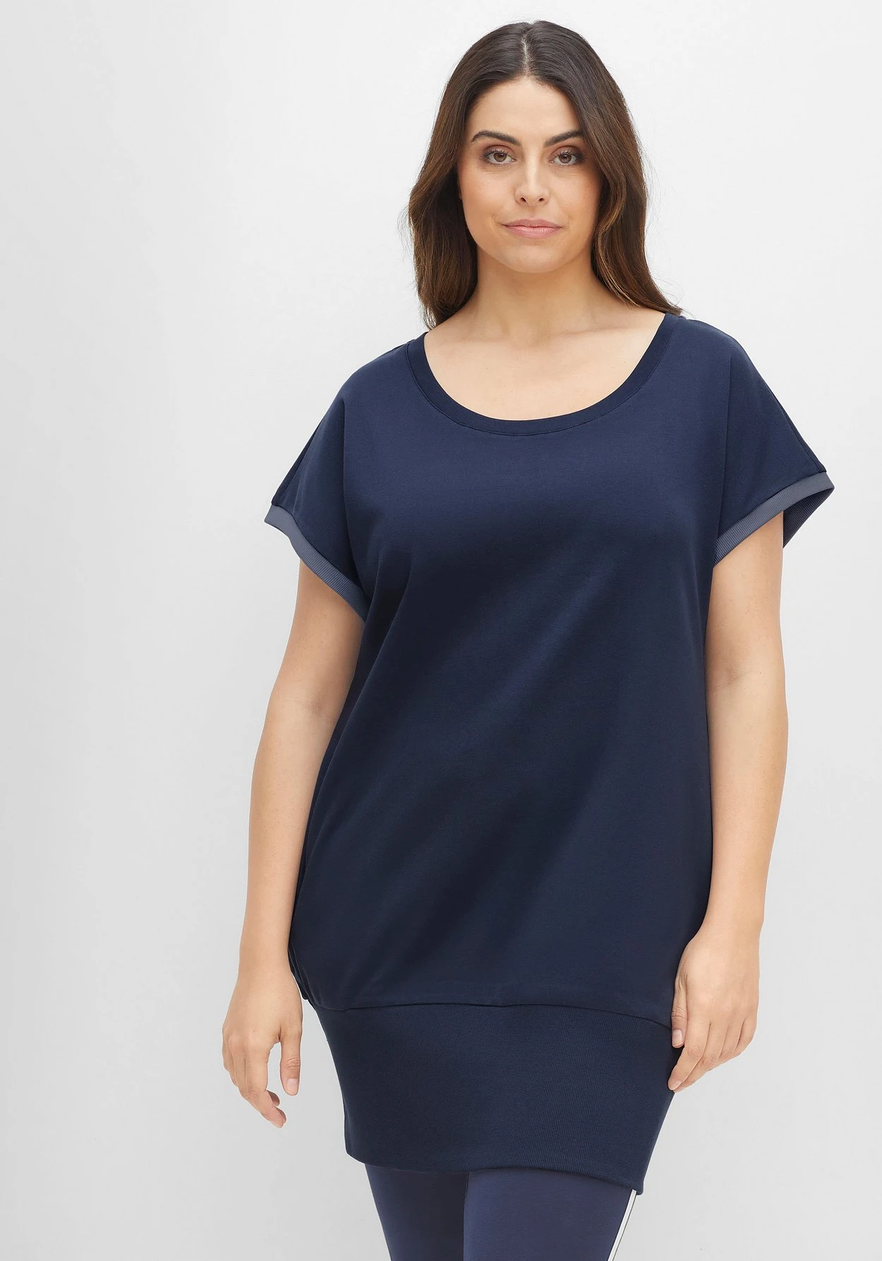 Relax-Sweatkleid mit weitem Rundhalsausschnitt. Für den lässigen Look sorgen die überschnittenen kurzen Ärmel, die mit kontrastfarbenen Rippbündchen enden. Seitliche Eingrifftaschen und der breite Saum verleihen dem Look zusätzliche Bequemlichkeit – ein idealer Kombipartner für Freizeit und Urlaub.