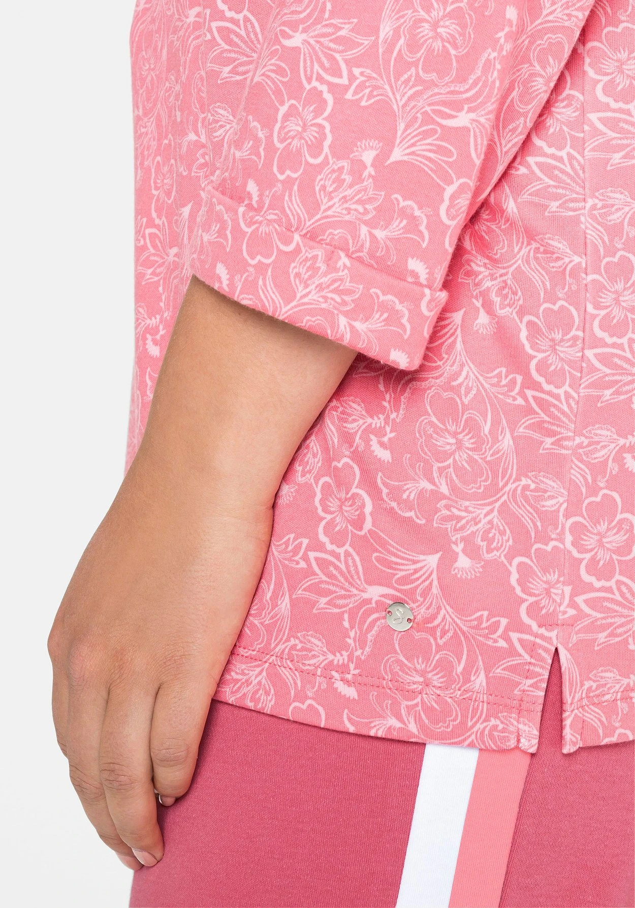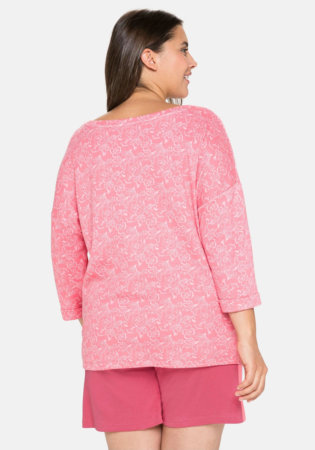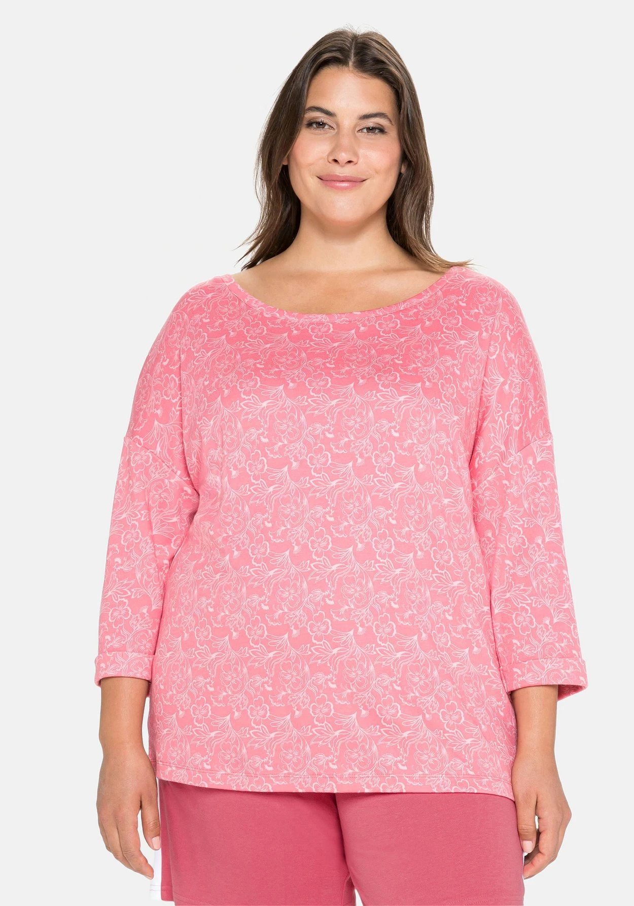Sweatshirt mit weitem Rundhalsausschnitt. In bequem lockerer Oversized-Form kommt dieses Oberteil, das durch den Blumendruck seinen femininen Look erhält. Überschnittene 3/4-Ärmel mit fixiertem Umschlag geben dem Style mehr Lässigkeit, kurze Seitenschlitze am geraden Saum lassen das Shirt locker über die Hüfte fallen – perfekt zum Relaxen. Unser Tipp: Das Shirt mit diesem Design lässt sich wunderbar mit anderen Teilen aus der sheego Homewear Kollektion kombinieren!