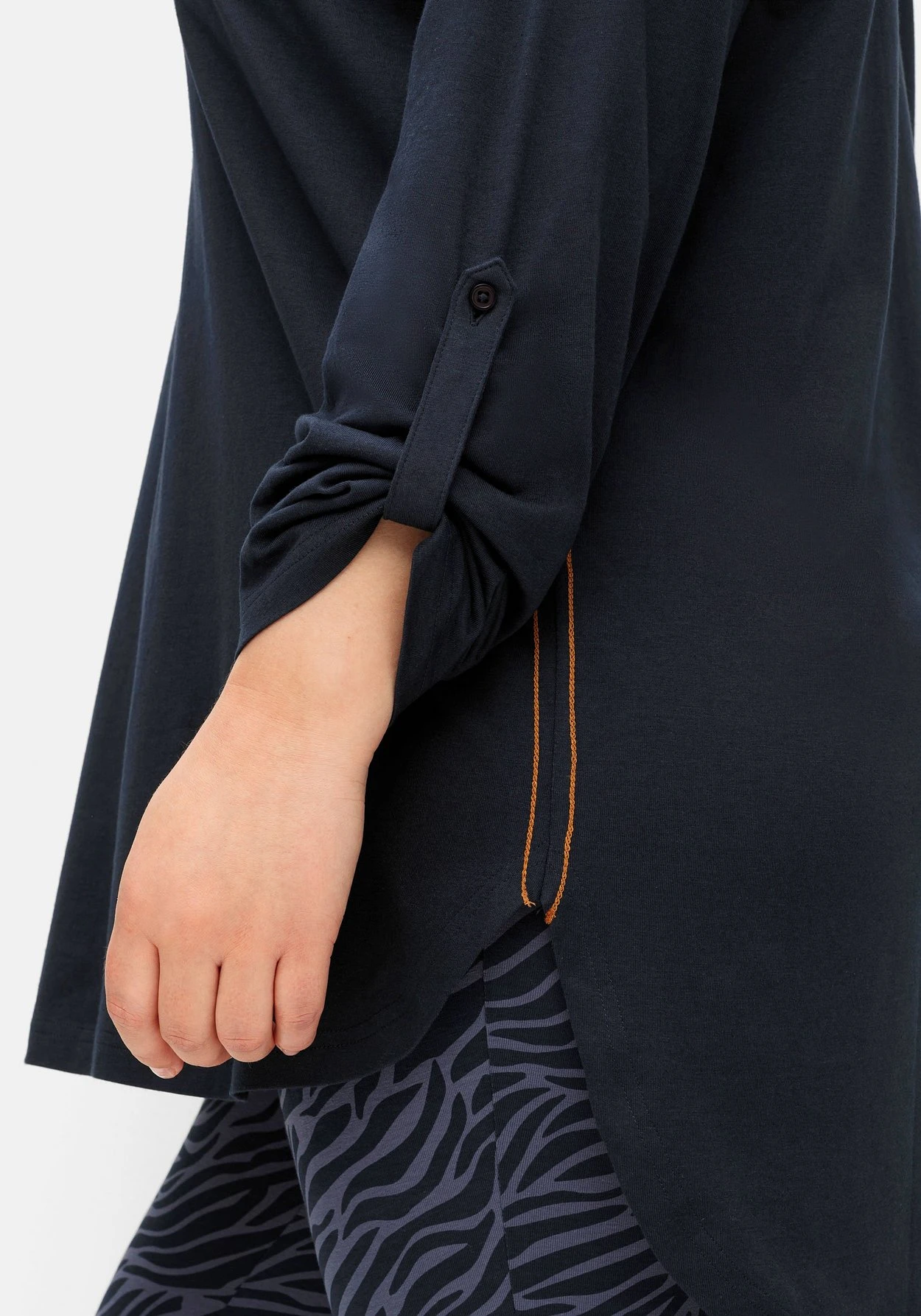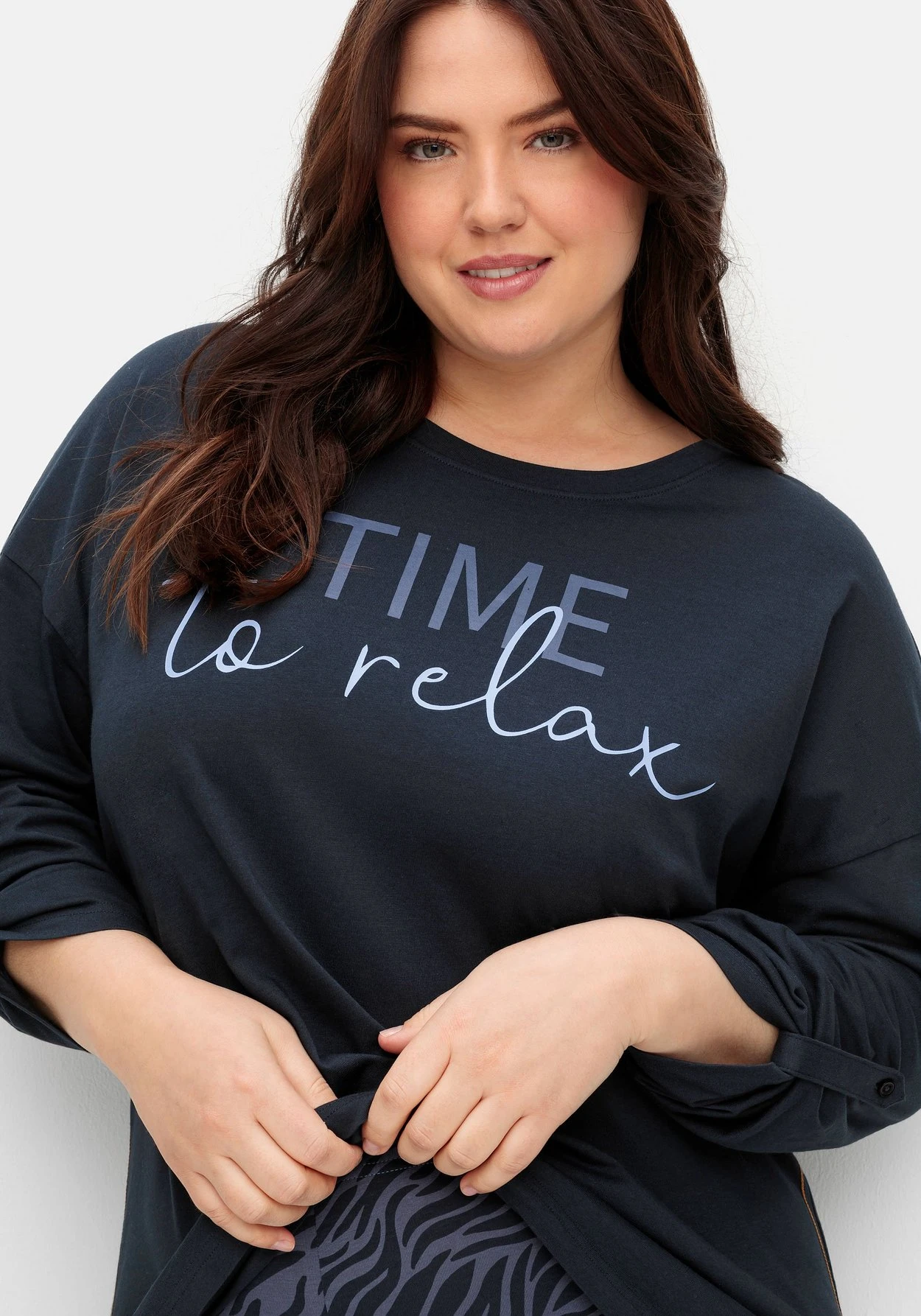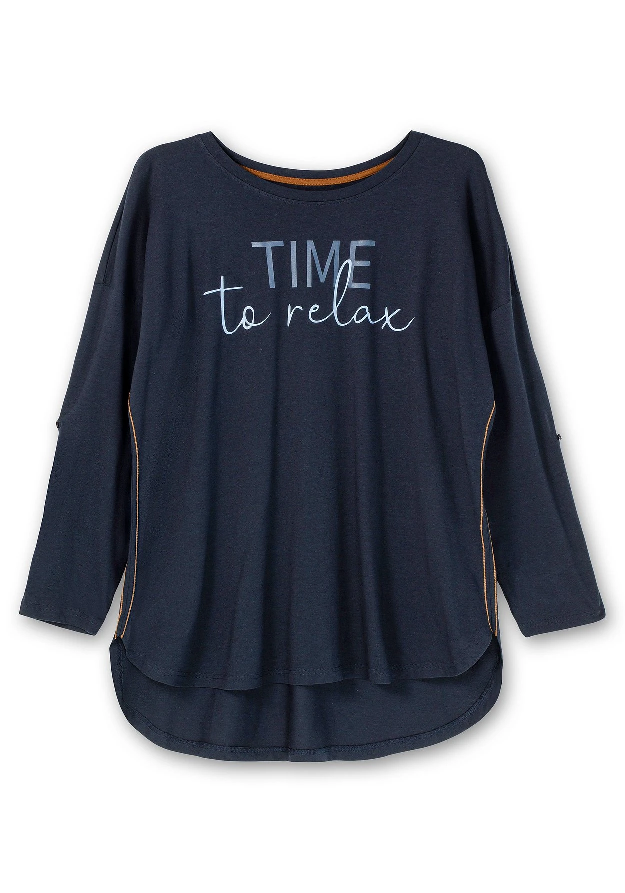 Longshirt zum Relaxen. In langer, figurumspielender Form und mit überschnittenen Schultern sitzt das Shirt locker und bequem. Die Ärmel können hochgekrempelt und mit Riegel und Knopf fixiert werden. Der abgerundete Saum mit verlängerter Rückenpartie reicht bis über die Po-Partie. Kontrastfarbene Nähte an den Seiten und der einladende Wordingprint vorn geben dem Loungewear-Style ein sportives Finish. Mit den passenden Leggings aus unserer Homewear-Kollektion ist der Wohlfühl-Look komplett – auch als Schlafshirt geeignet.