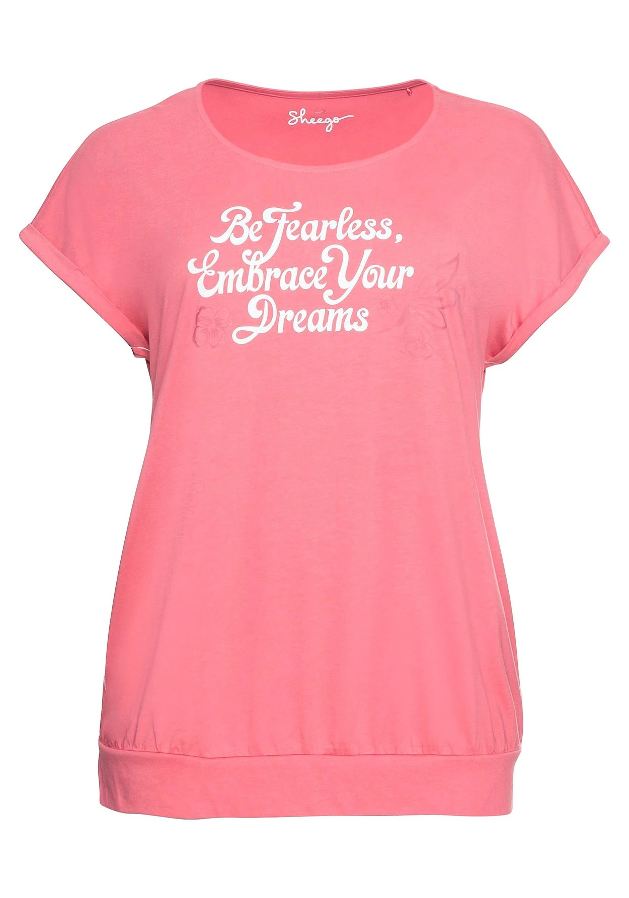 Relaxshirt in bequemer Oversized-Form. Der entspannte Homewear-Look zeigt sich großzügig im Schnitt, ein etwas weiterer Rundhalsausschnitt und überschnittene Schultern unterstreichen die Lässigkeit. Der kleine Ärmelaufschlag bringt eine sportive Note in den Style, für Femininität sorgt der dezente florale Frontdruck mit überzeugendem Statementprint. Seitliche Teilungsnähte sind kontrastfarben abgesetzt und schmeicheln der Silhouette. Unser Tipp: Das Shirt mit diesem Design lässt sich wunderbar mit anderen Teilen aus der sheego Homewear Kollektion kombinieren!