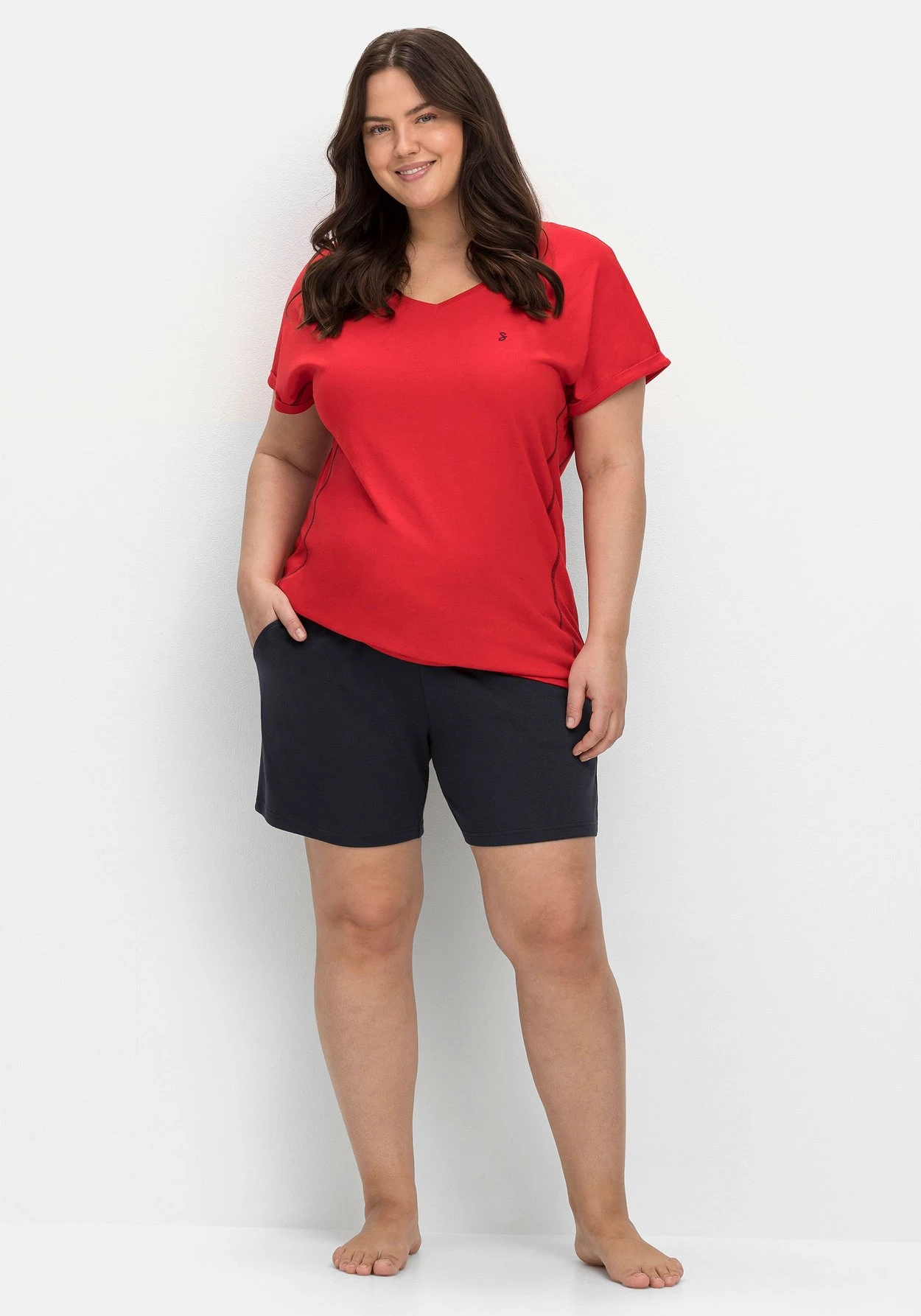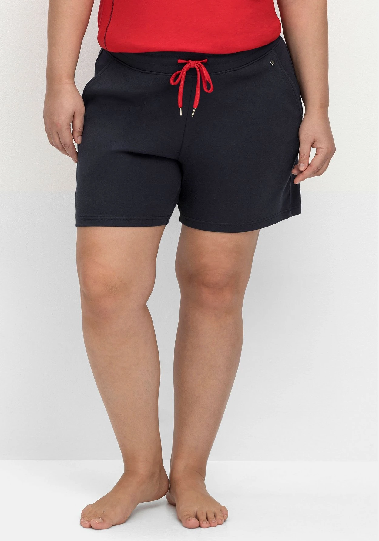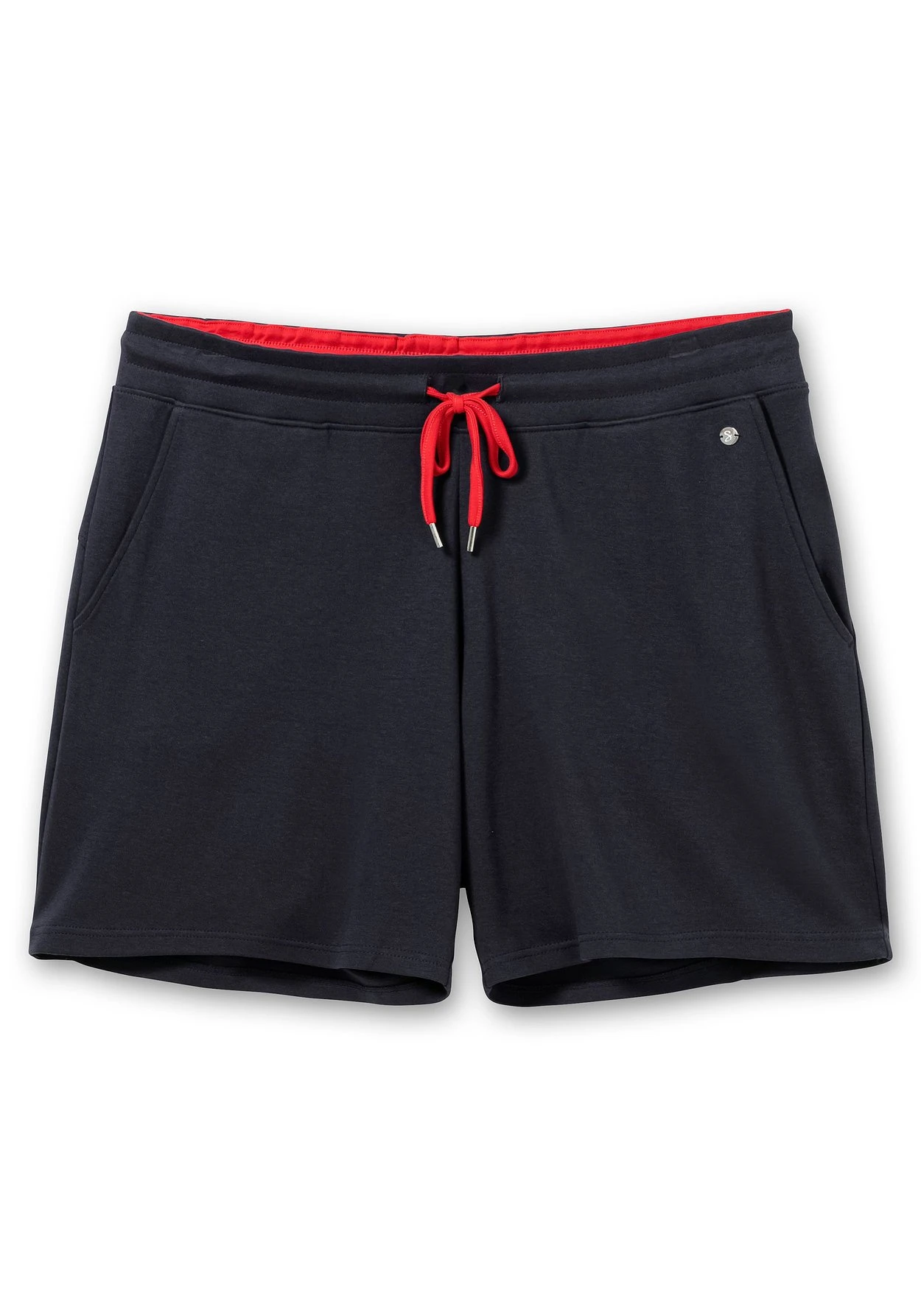 Shorts mit Kontrastdetails. Bequemlichkeit erhält die kurze Hose durch den elastischen Bund mit regulierbarem Tunnelzug. Dabei setzen das Bindeband und der Innenbund farbliche Akzente. Ein kleines Metalllabel und zwei seitliche Eingrifftaschen ergänzen den sportiven Look. Unser Tipp: Die Relaxshorts lassen sich wunderbar mit anderen Teilen aus der sheego Homewear Kollektion kombinieren.