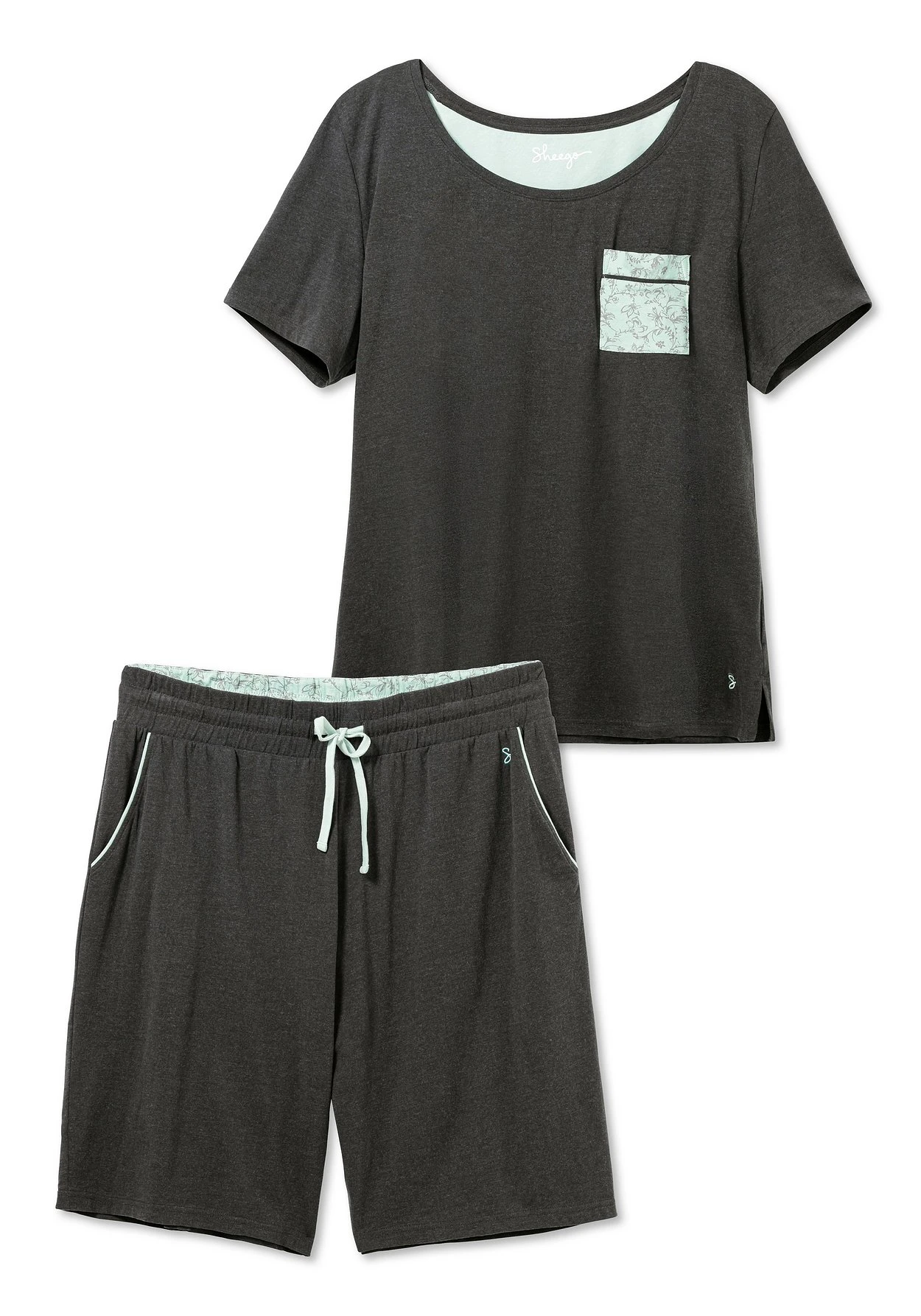 Shorty-Set mit Kontrastdetails. Das schlichte, kurzärmelige Shirt bekommt durch die floral bedruckte Brusttasche eine dezent feminine Note. Kleine seitliche Schlitze am geraden Saum lassen das Oberteil entspannt über die kurze Hose fallen. Hier sorgt der elastische Hosenbund für Bequemlichkeit, regulierbare Bindebändchen und die paspelierten Eingrifftaschen setzen passend zum Oberteil sportive Kontrastakzente.