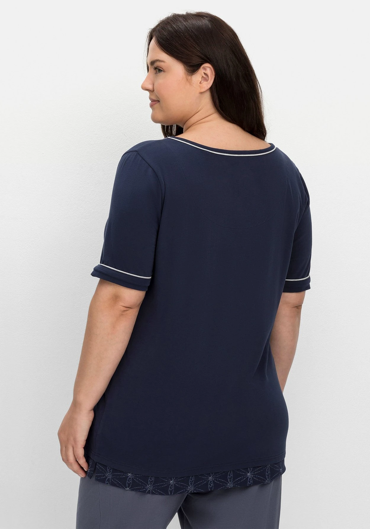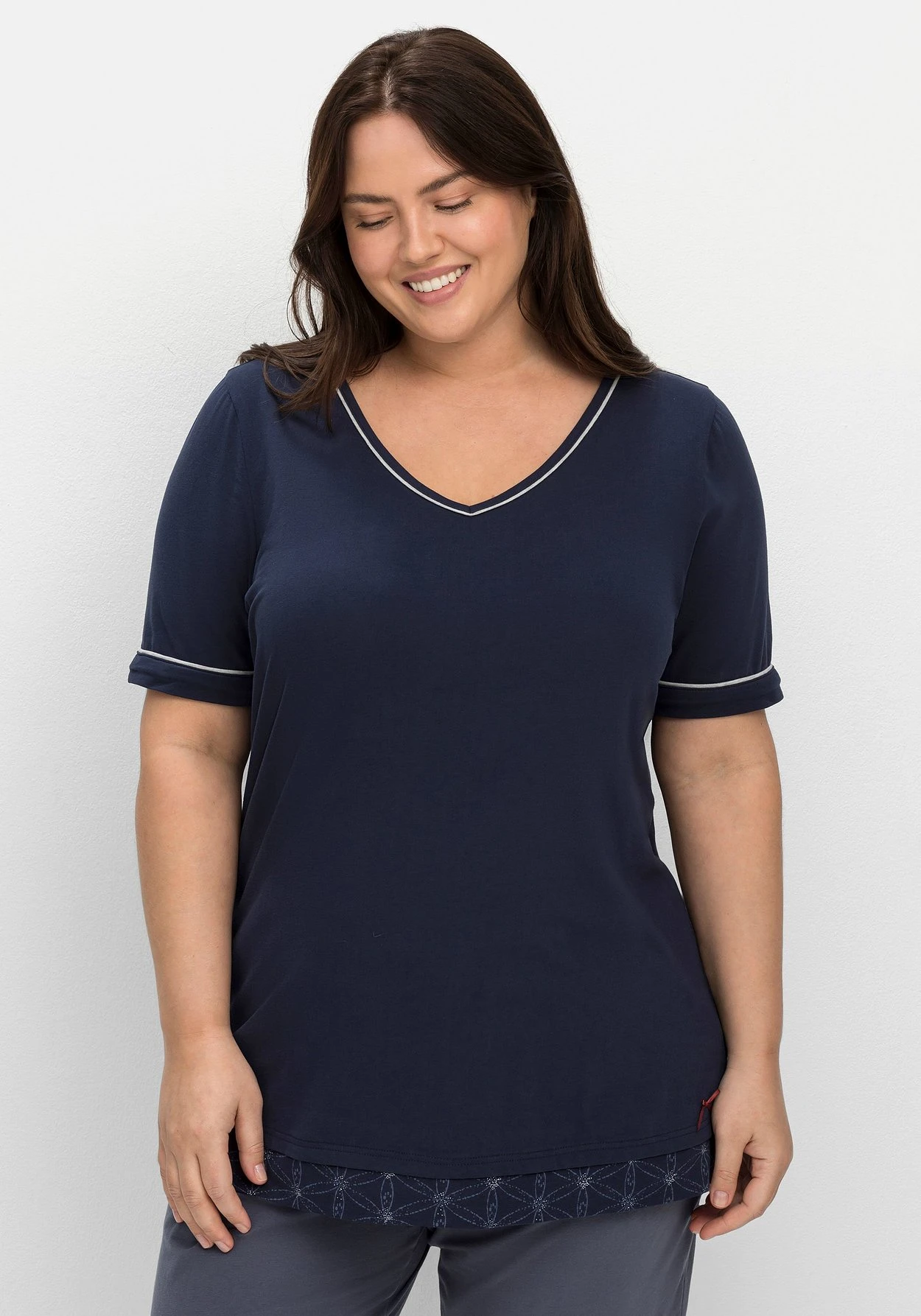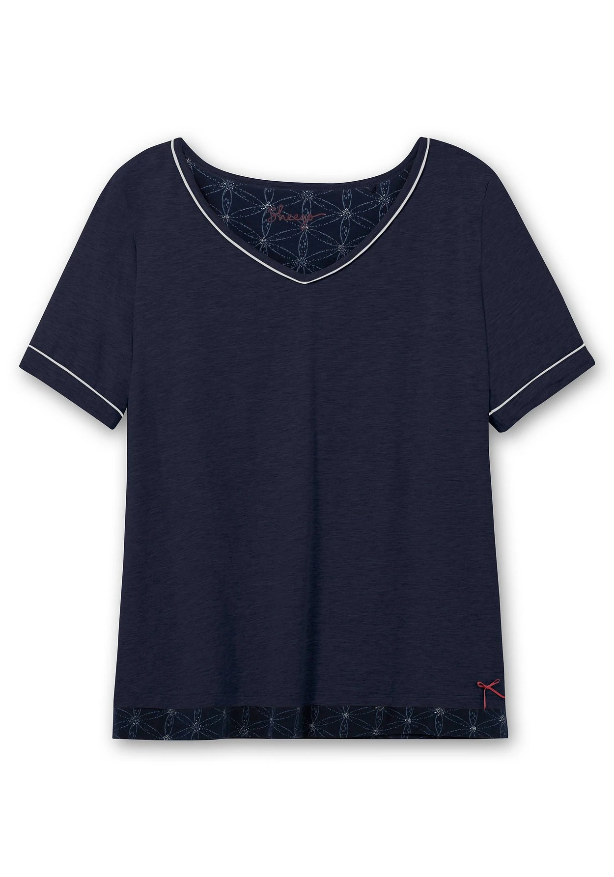 Schlafshirt mit Halbarm und V-Ausschnitt. Kontrastfarbene Details geben der Nightwear eine sportive Note, der gemusterte Saum dient als Eyecatcher. Eine kleine Schleife oberhalb des Saumes ergänzt den Look. Unser Tipp: Dank des Mix & Match-Charakters lässt sich das Schlafanzugoberteil perfekt mit Unterteilen aus der sheego Nachtwäsche-Kollektion kombinieren.