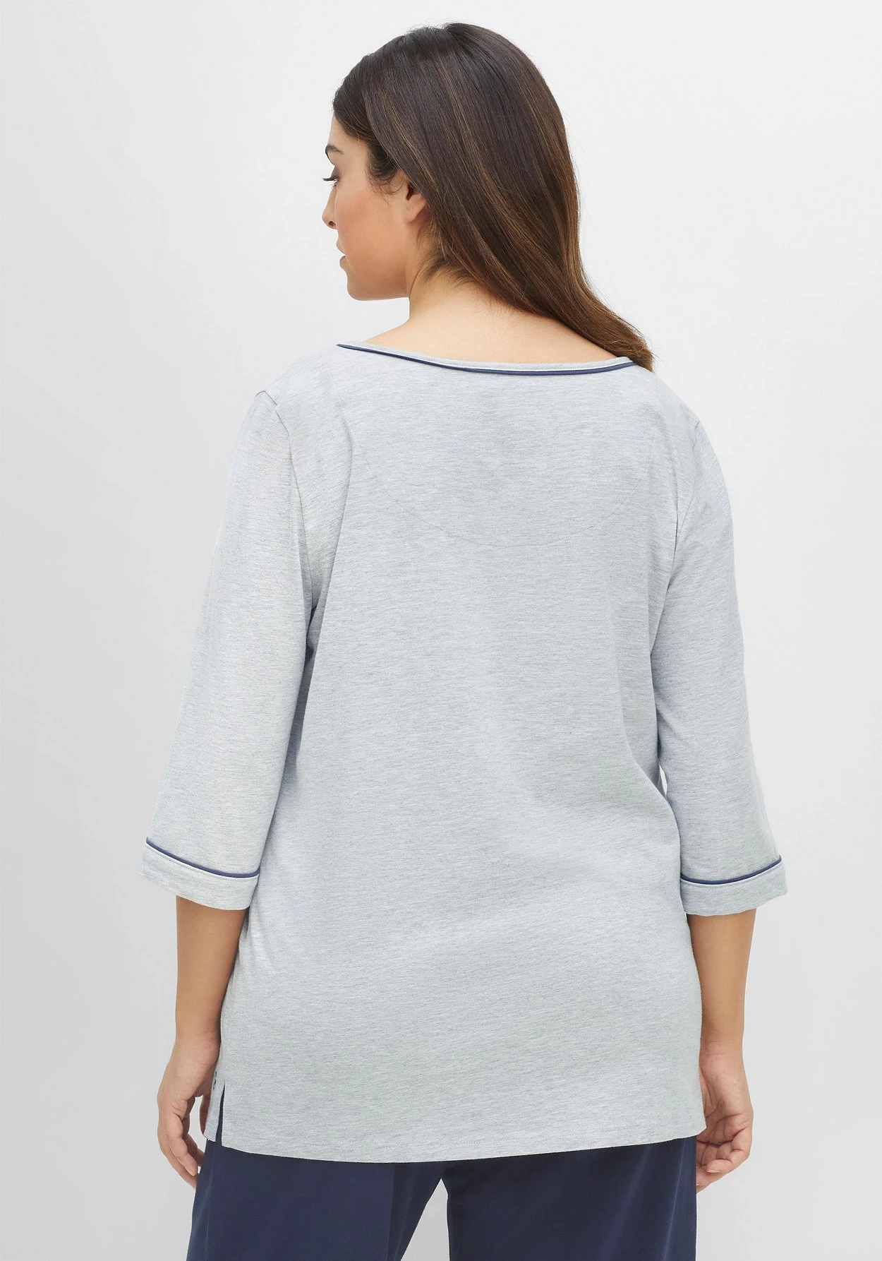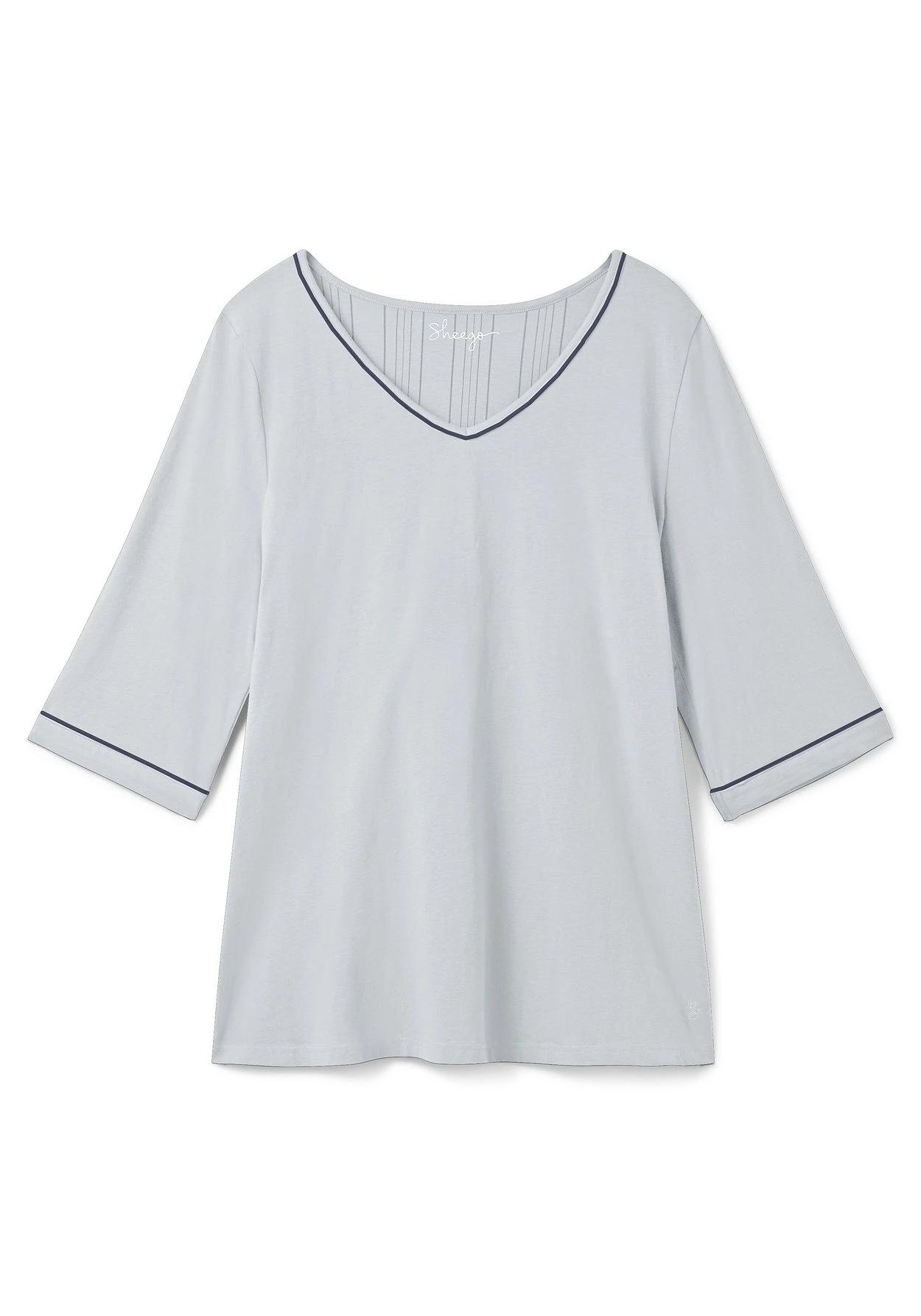 Schlafshirt mit 3/4-Arm. Kontrastpipings am V-Ausschnitt sowie am Ärmelsaum geben dem Shirt eine sportive Note. Unser Tipp: Dank des Mix & Match-Charakters lässt sich das Shirt perfekt mit Unterteilen aus der sheego Nachtwäsche-Kollektion kombinieren.