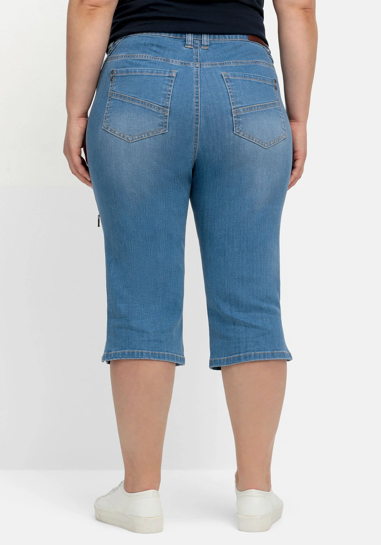 Die Jeans ist schmal geschnitten und besitzt eine Caprilänge bis knapp über das Knie. Seitliche Schlitze geben Bewegungsfreiheit.