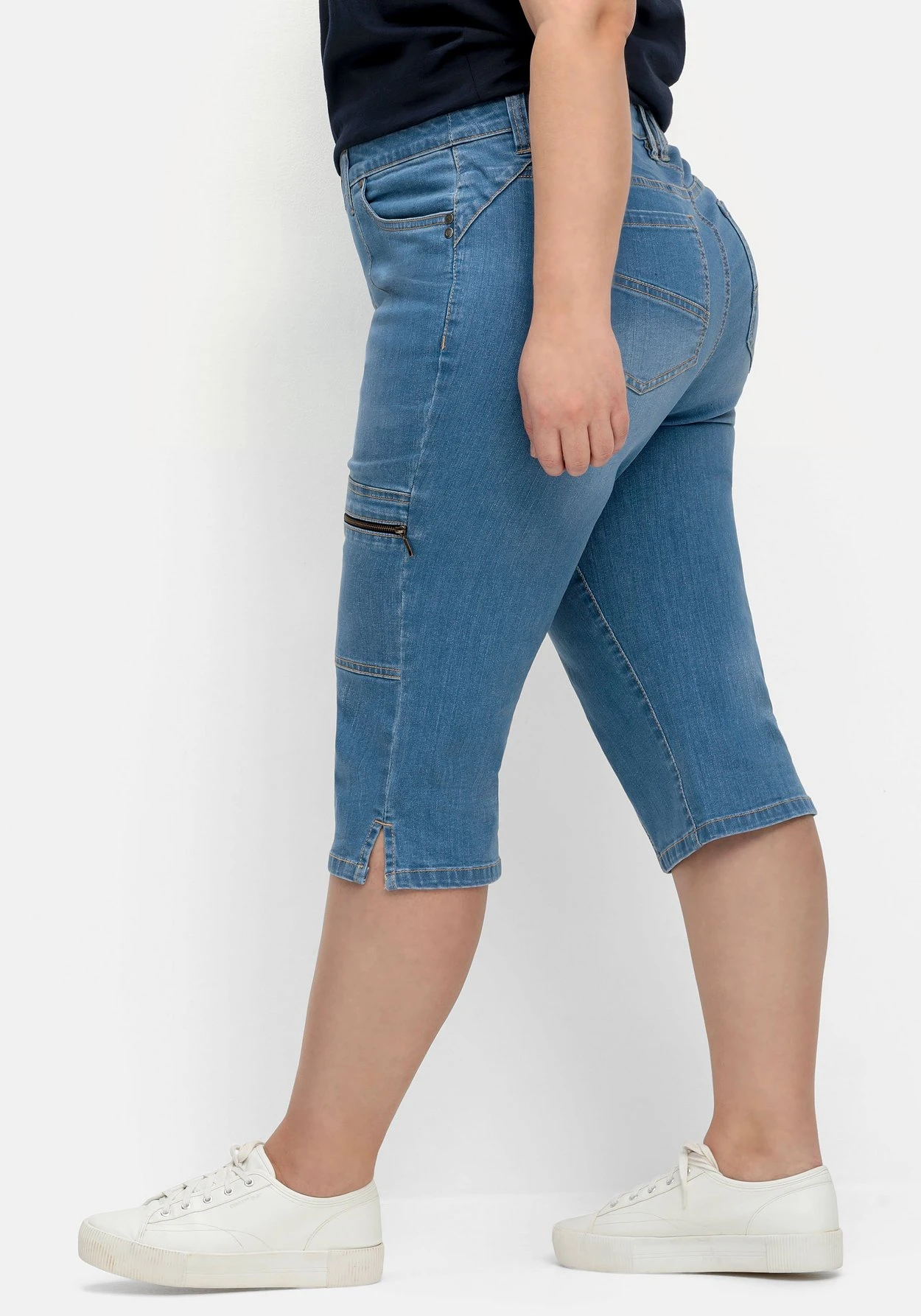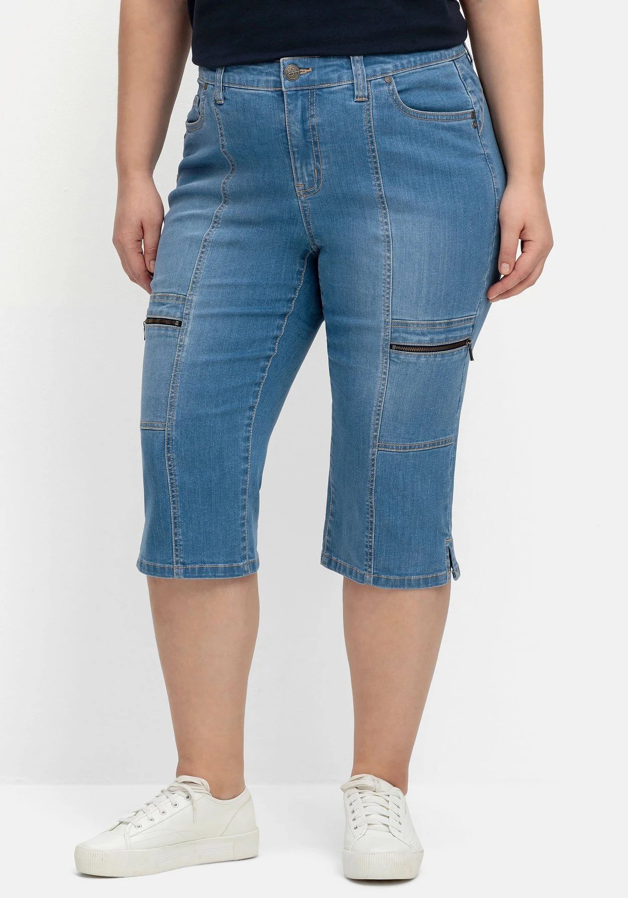 Schmale Jeans in Caprilänge. Aufgesetzte Reißverschlusstaschen am Oberschenkel lassen in Kombination mit den markanten Teilungsnähten die sportive Cargo-Optik entstehen. Die Hose besitzt die klassischen fünf Taschen und ist mit Formbund und Gürtelschlaufen gearbeitet. Eine individuelle Waschung unterstreicht den lässigen Auftritt.