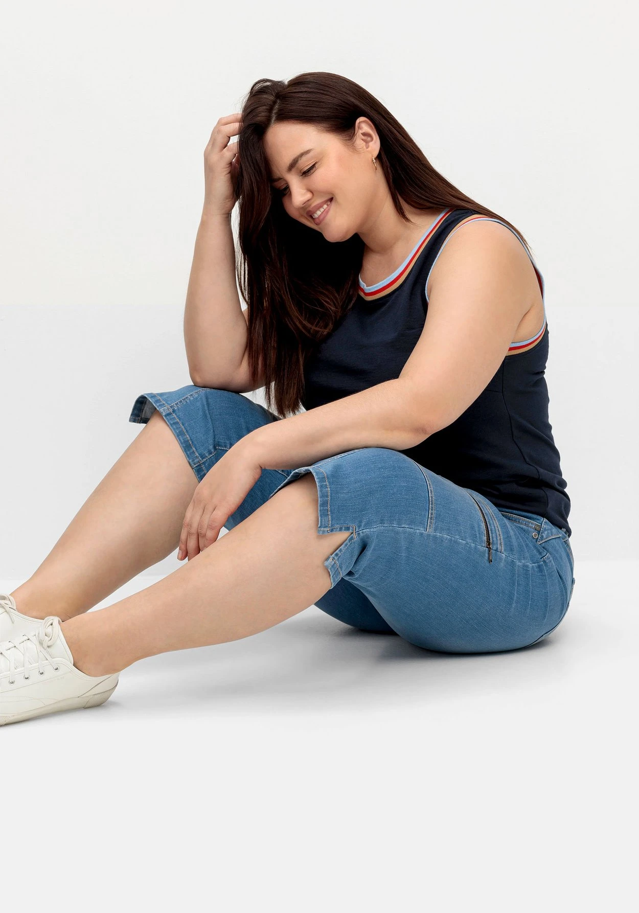 Die elastische Denim-Qualität trägt sich durch den hohen Baumwollanteil sehr angenehm. Mit deinem Kauf unterstützt du die Arbeit von „Cotton made in Africa“. Die Initiative leistet Hilfe zur Selbsthilfe durch Handel und will so die Lebensbedingungen afrikanischer Kleinbauern verbessern. sheego cares!