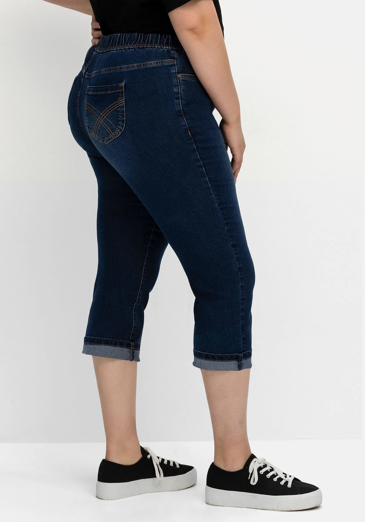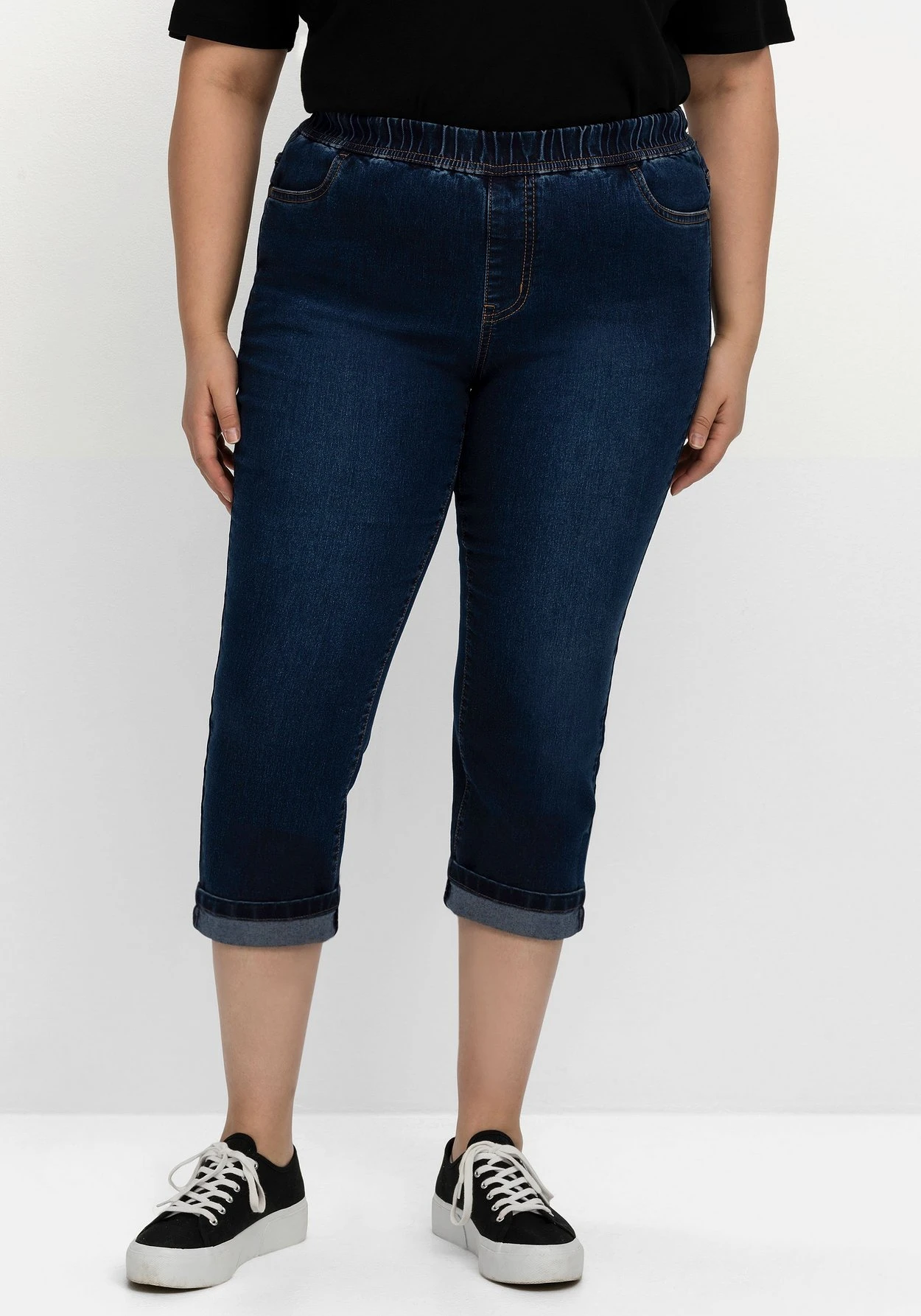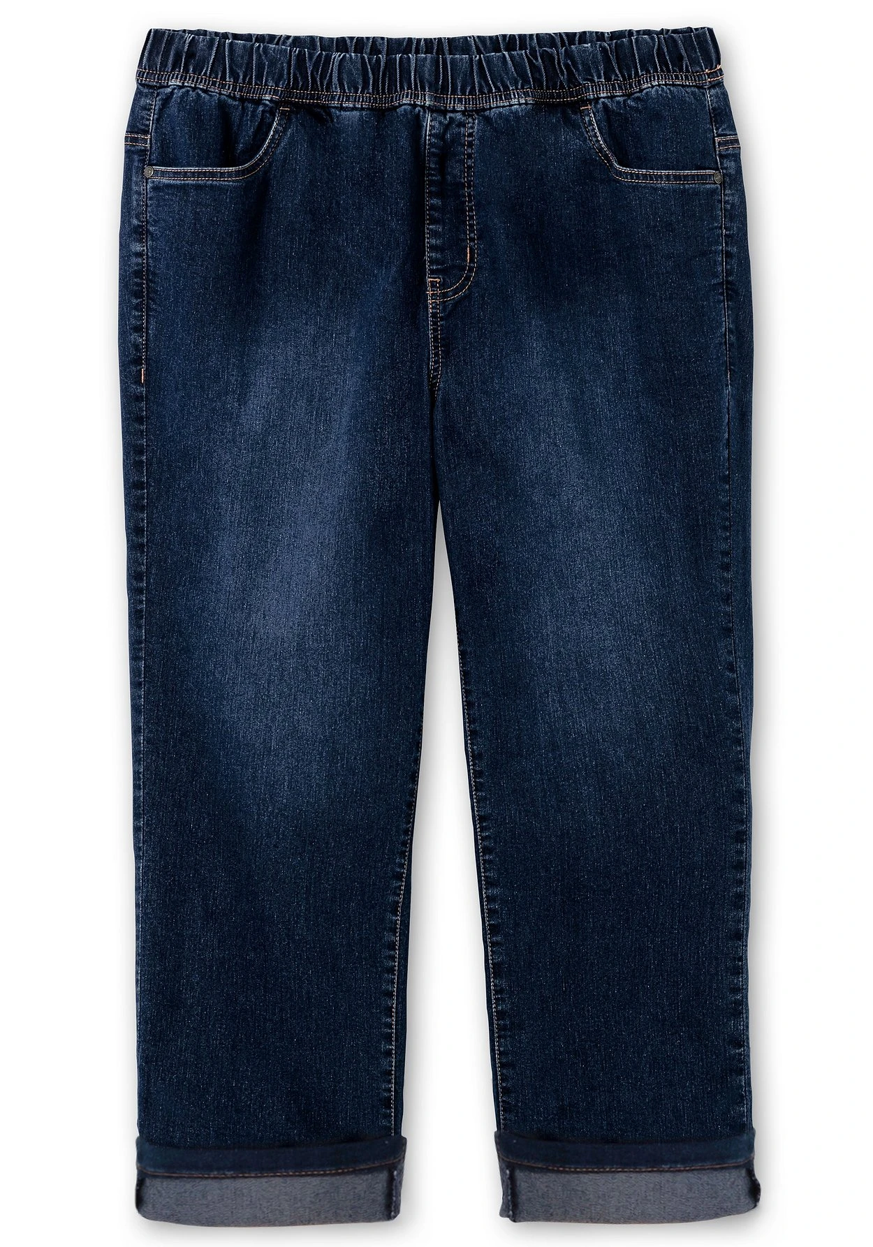 Jeans in lässiger Caprilänge. Durch den elastischen Schlupfbund sitzt die Hose sehr bequem. Charakteristisch ist der Umschlag am Saumabschluss, auch die individuelle Waschung sorgt für Coolness. Ziernähte vorn und aufgesetzte Taschen mit Stickerei hinten ergänzen den Look.