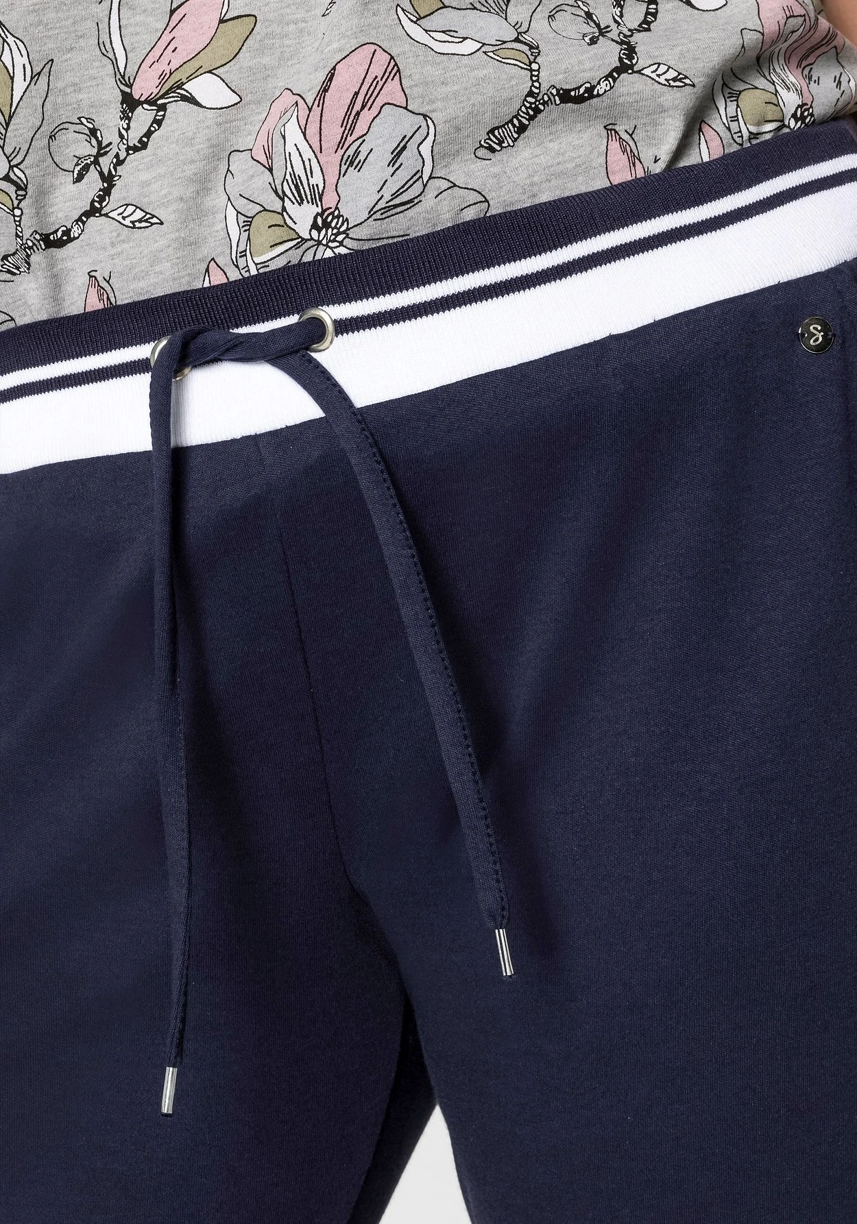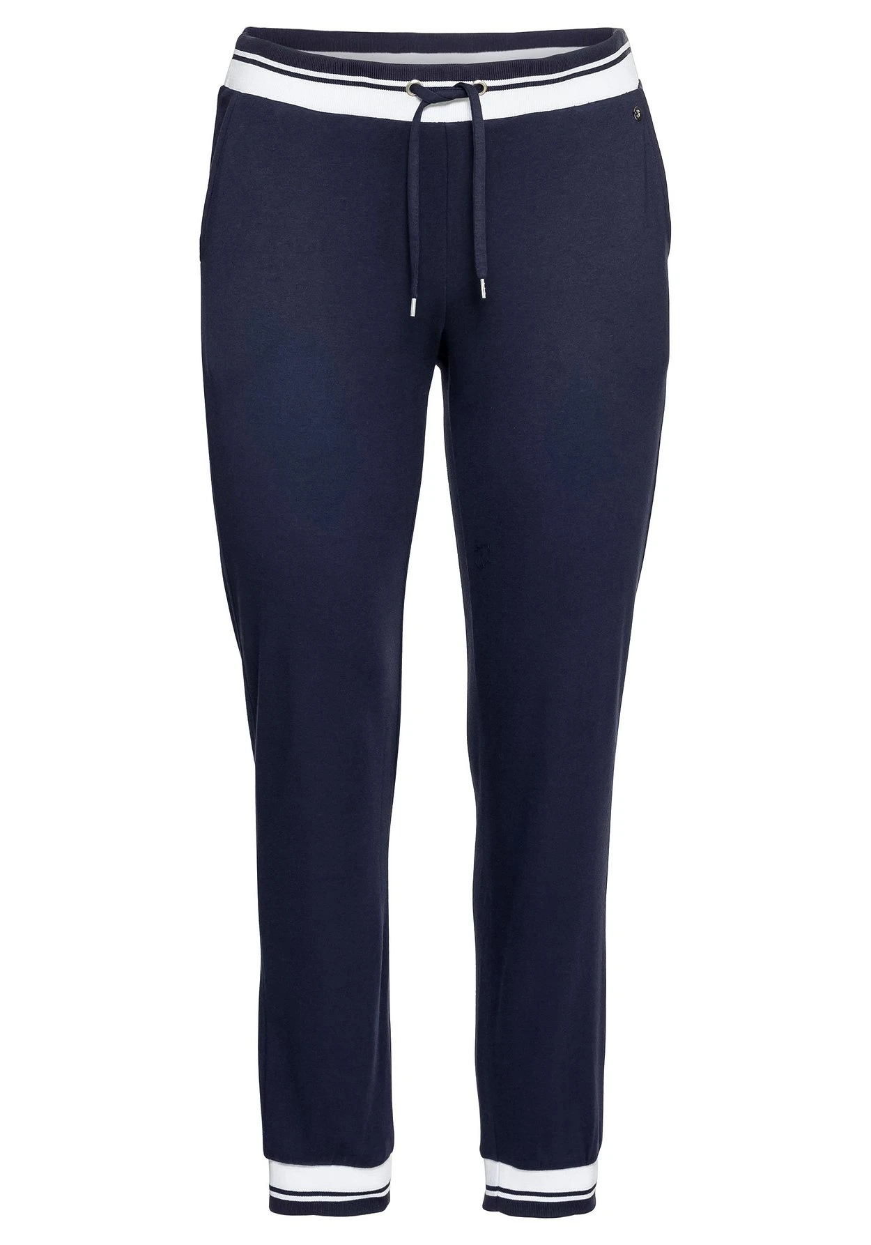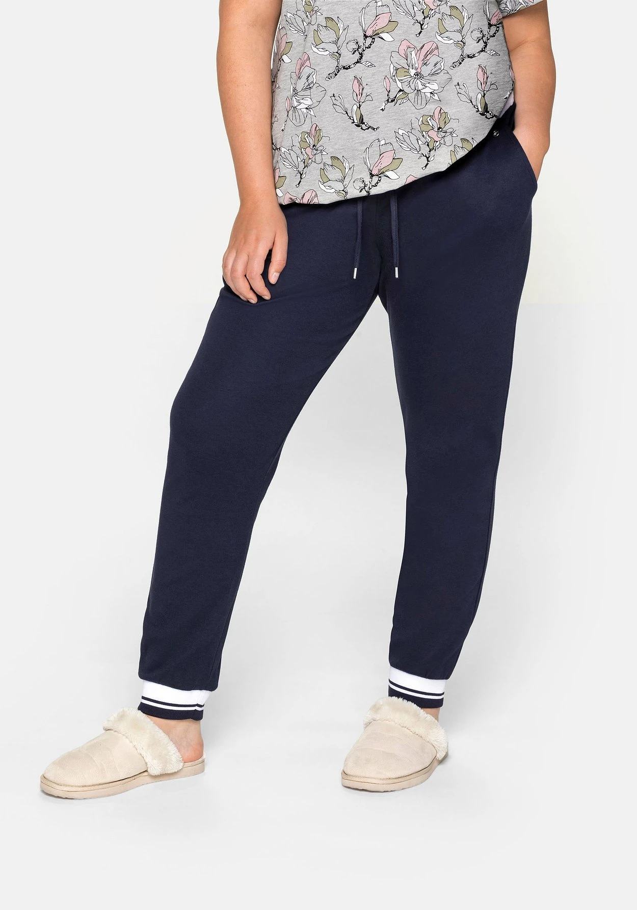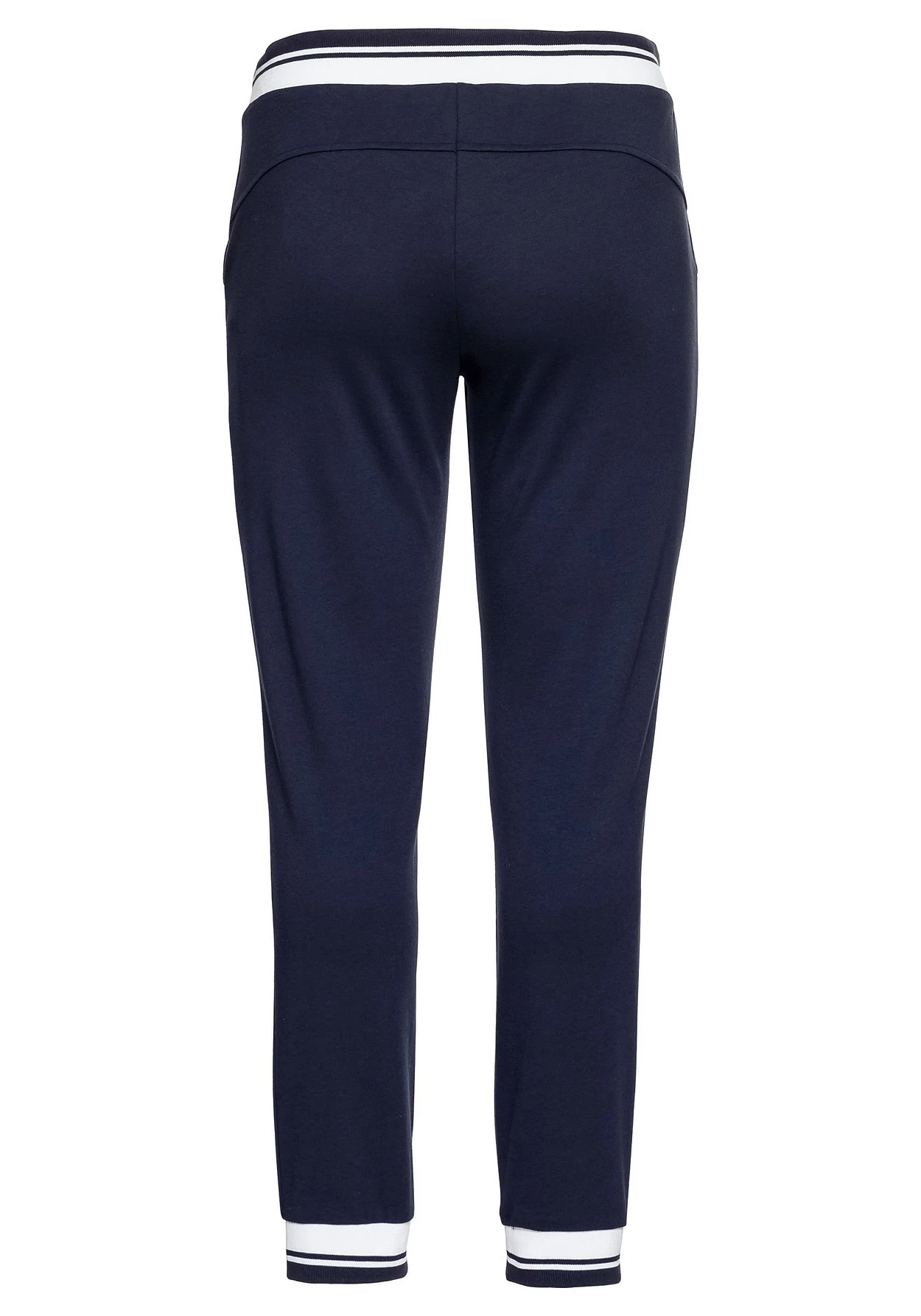 Relaxhose im schmalen Schnitt. Diese Homewearhose ist mit elastischen, kontrastfarbenen Rippbündchen und Bindebändchen versehen. Seitlich sind zwei Taschen angebracht. Die elastischen Beinabschlüsse sorgen für den lässigen Jogginghosen-Look.