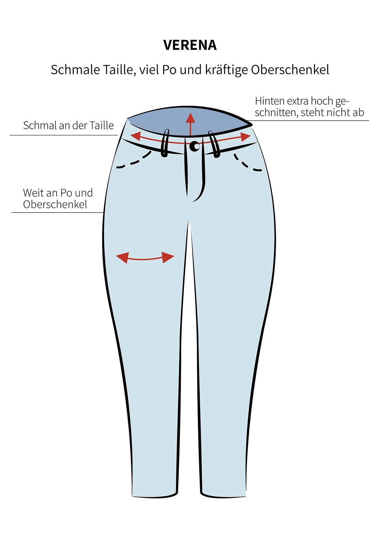 In schmaler Slim Fit Beinform. Die Passform VERENA ist schmal an der Taille und weit an Po und Oberschenkel geschnitten. Durch den hinten höheren Schnitt steht die Hose auch im Sitzen nicht ab, die Passe schmeichelt der Figur zusätzlich.
