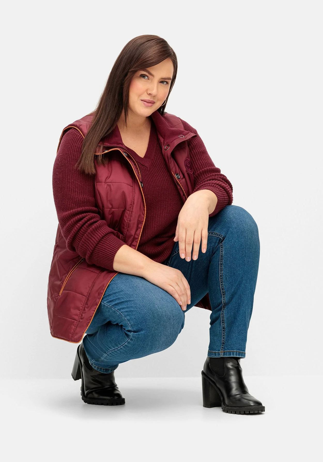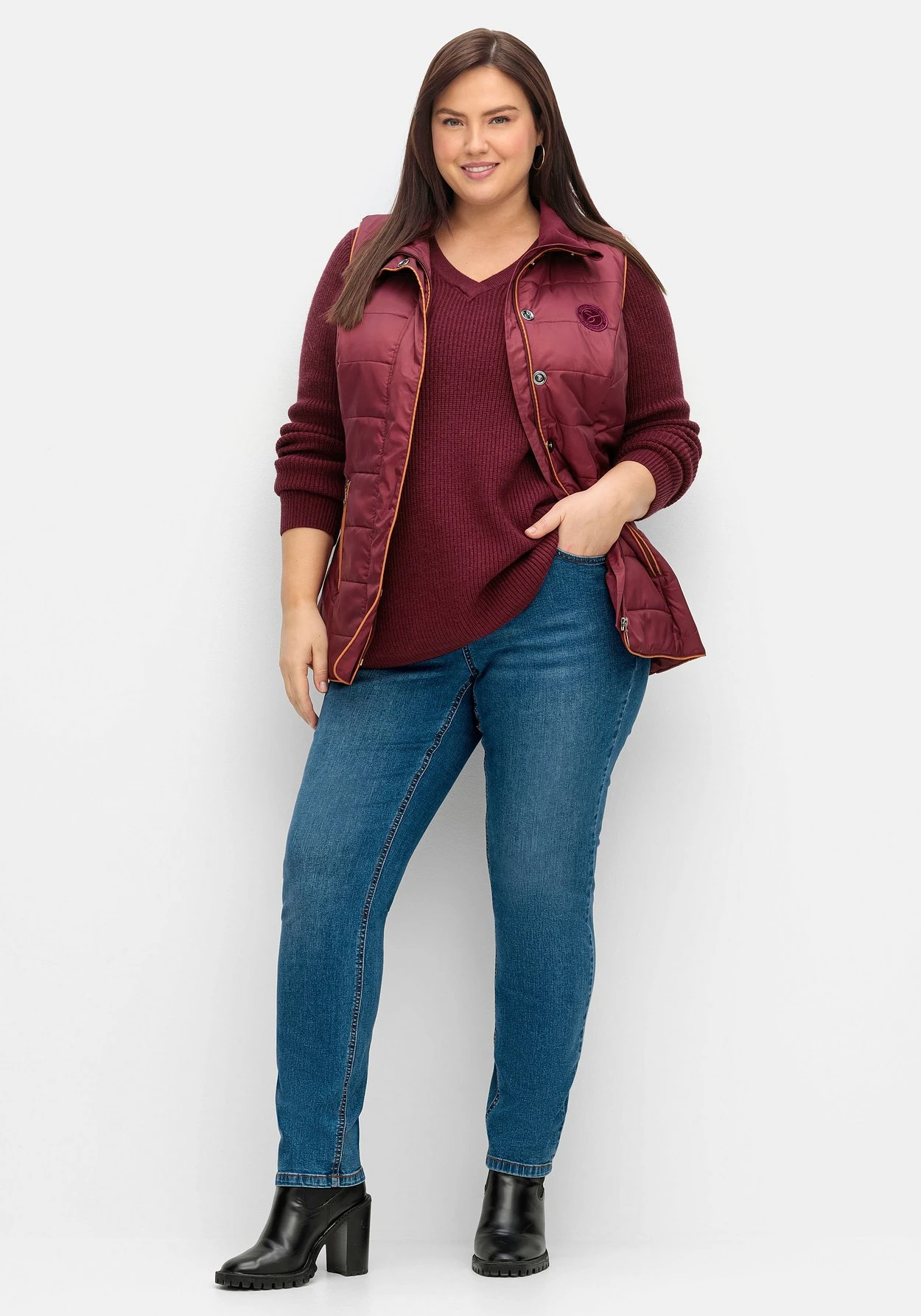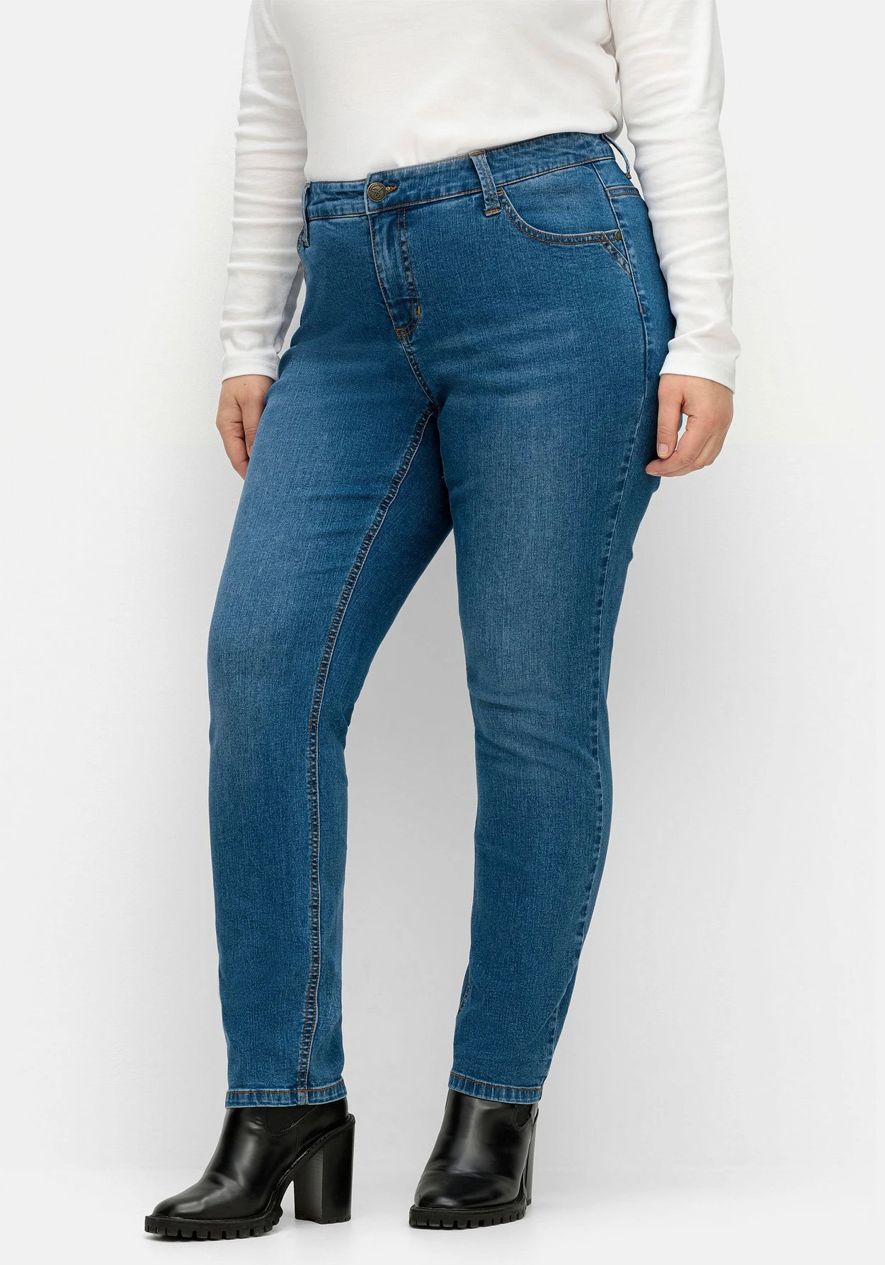 Slim Fit Jeans in Curvy-Schnitt VERENA. Der komfortable Fit ist perfekt auf die Figur mit schmaler Taille, viel Po und kräftigen Oberschenkeln zugeschnitten. Waschung, Catfaces und Kontrastnähte verleihen der Jeans eine legere Optik. Der Formbund mit Gürtelschlaufen sowie die klassische 5-Pocket-Form runden den Look ab.