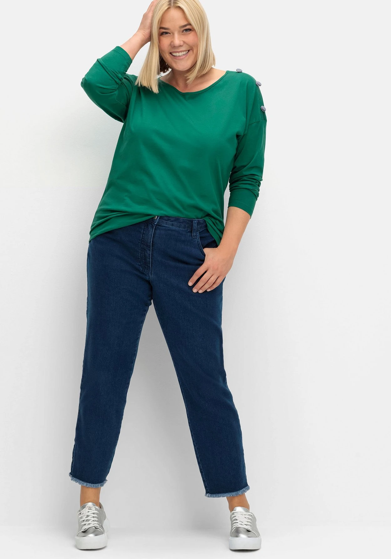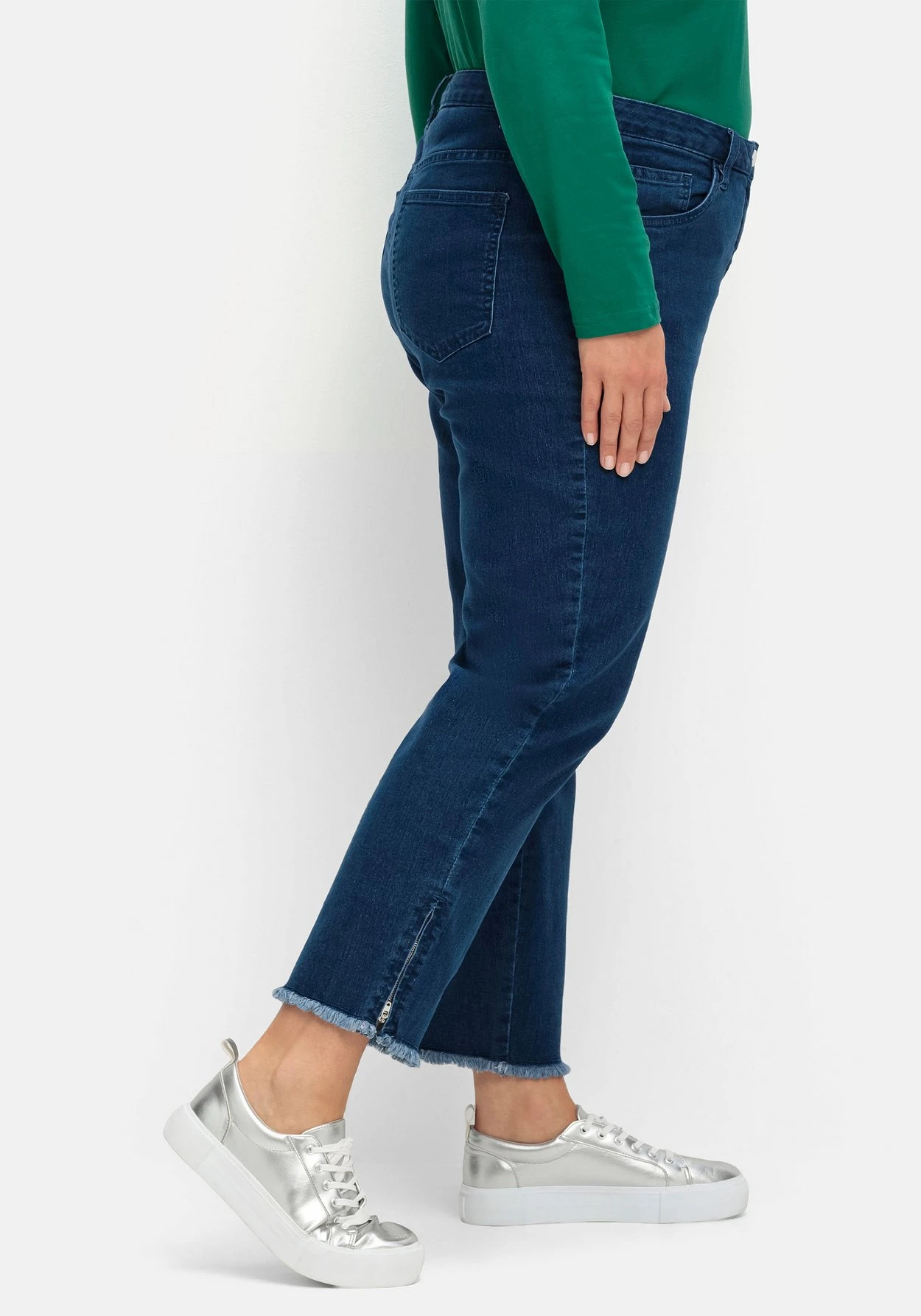 Stretch-Jeans in schmaler Form. Der Formbund ist mit Gürtelschlaufen gearbeitet, geschlossen wird die Hose mit Knopf und Reißverschluss. Modische Details sind die Fransen und der seitliche Reißverschluss am Saum. Die typischen fünf Taschen runden den lässigen Look ab.