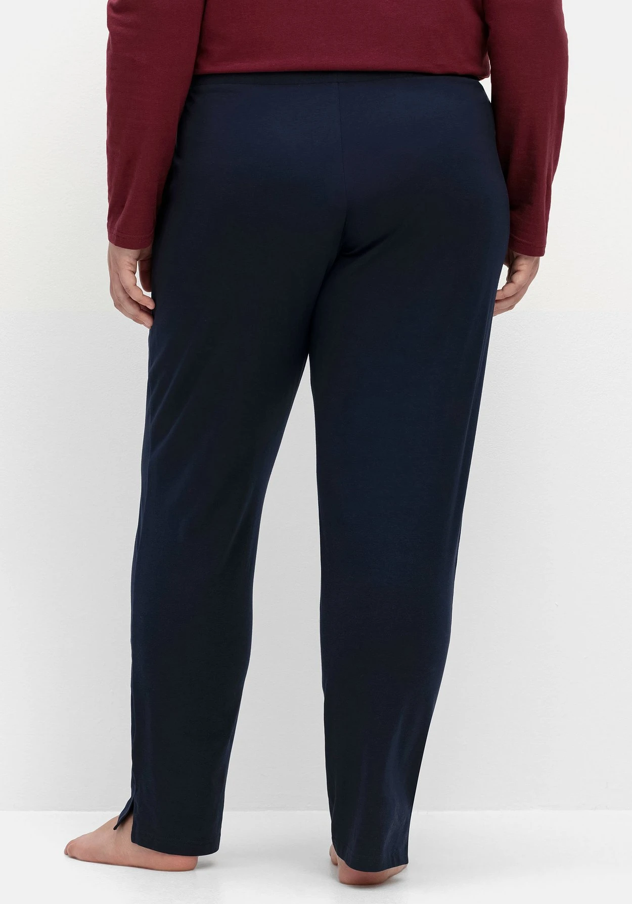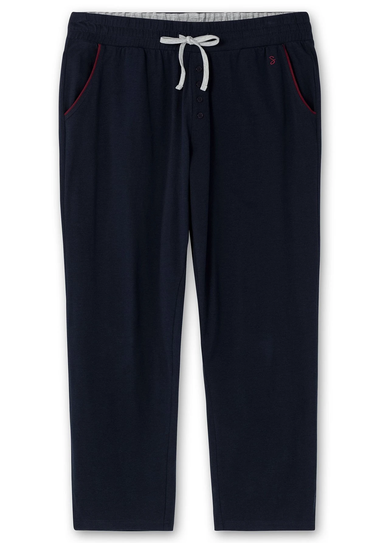 Schlafhose mit elastischem Bund und kontrastfarbenem Bindeband. Diese Pyjamahose endet am Beinabschluss mit seitlichen Schlitzen. Sie besitzt zwei seitliche Taschen, charmantes Detail ist hier der kontrastfarbene Abschluss. Die kleine Stickerei unterhalb des Bundes ist dazu eine harmonische Ergänzung.