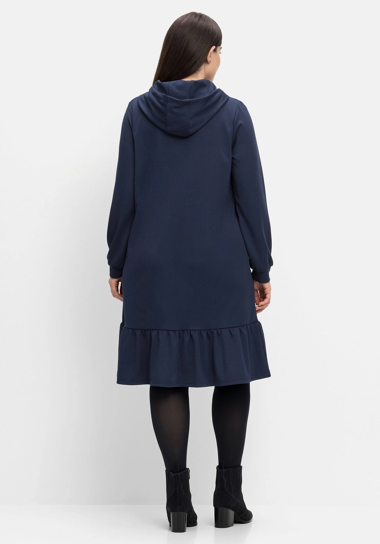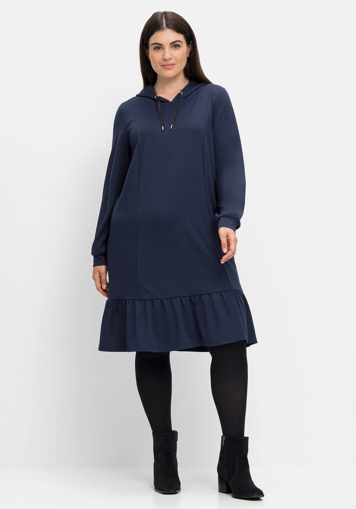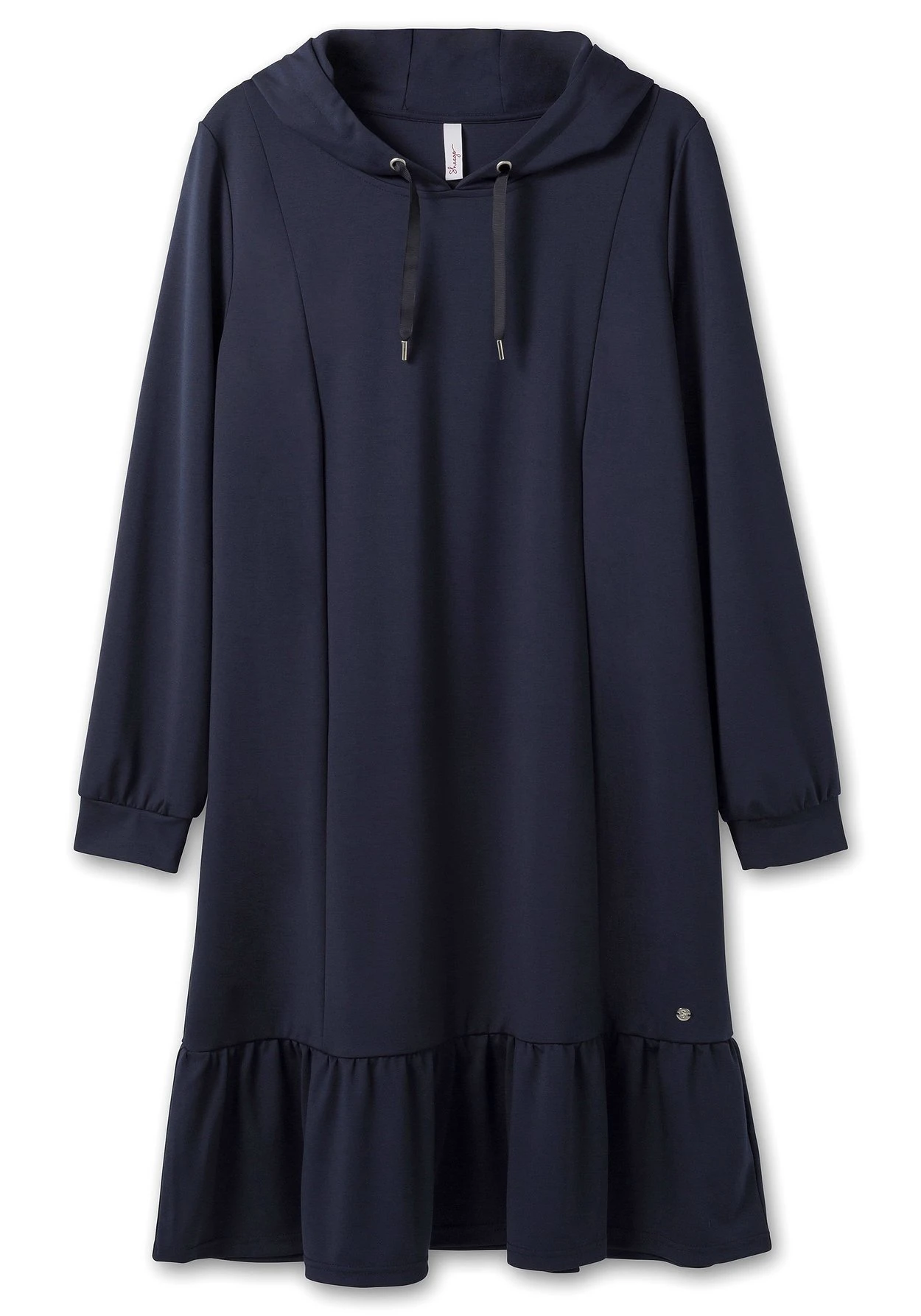 Shirtkleid aus weichem Interlock. Der sportive Look mit Kapuze und Satin-Bindebändchen erhält durch den Volant am Saum ein feminines Upgrade. Die langen Ärmel enden mit engeren Bündchen, Teilungsnähte vorn sind nicht nur ein modisches Detail, sondern sorgen gleichzeitig für eine gute Passform.