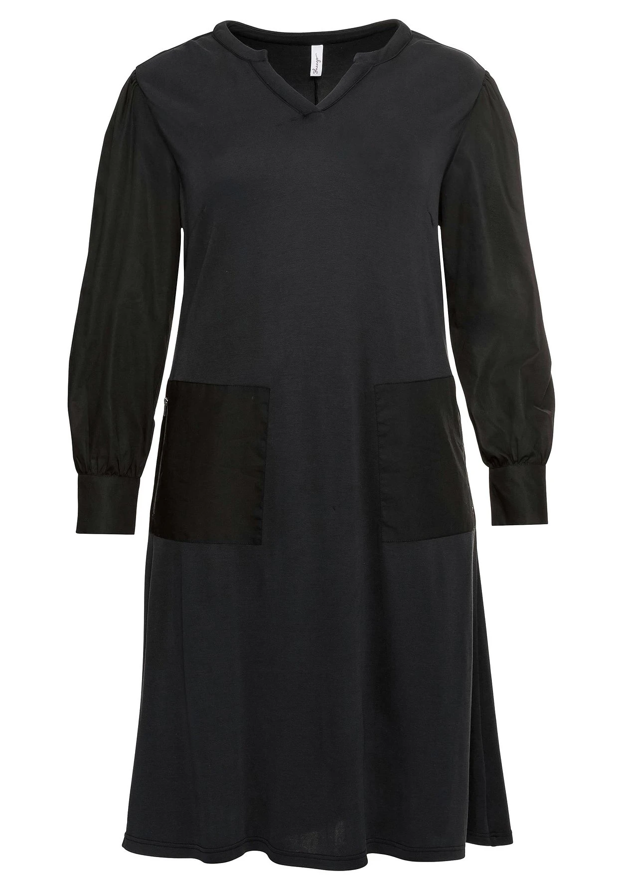 Shirtkleid im Materialmix, mit zwei aufgesetzten Reißverschlusstaschen vorn. Der clean geschnittene Style wird am Rundhalsausschnitt durch eine V-förmige Öffnung dekoriert. An den langen Ärmeln befinden sich Manschetten.
