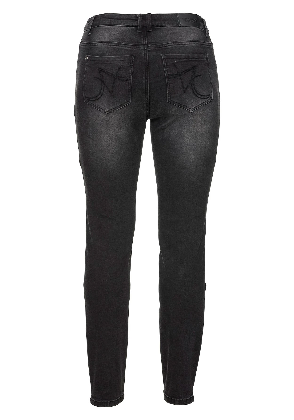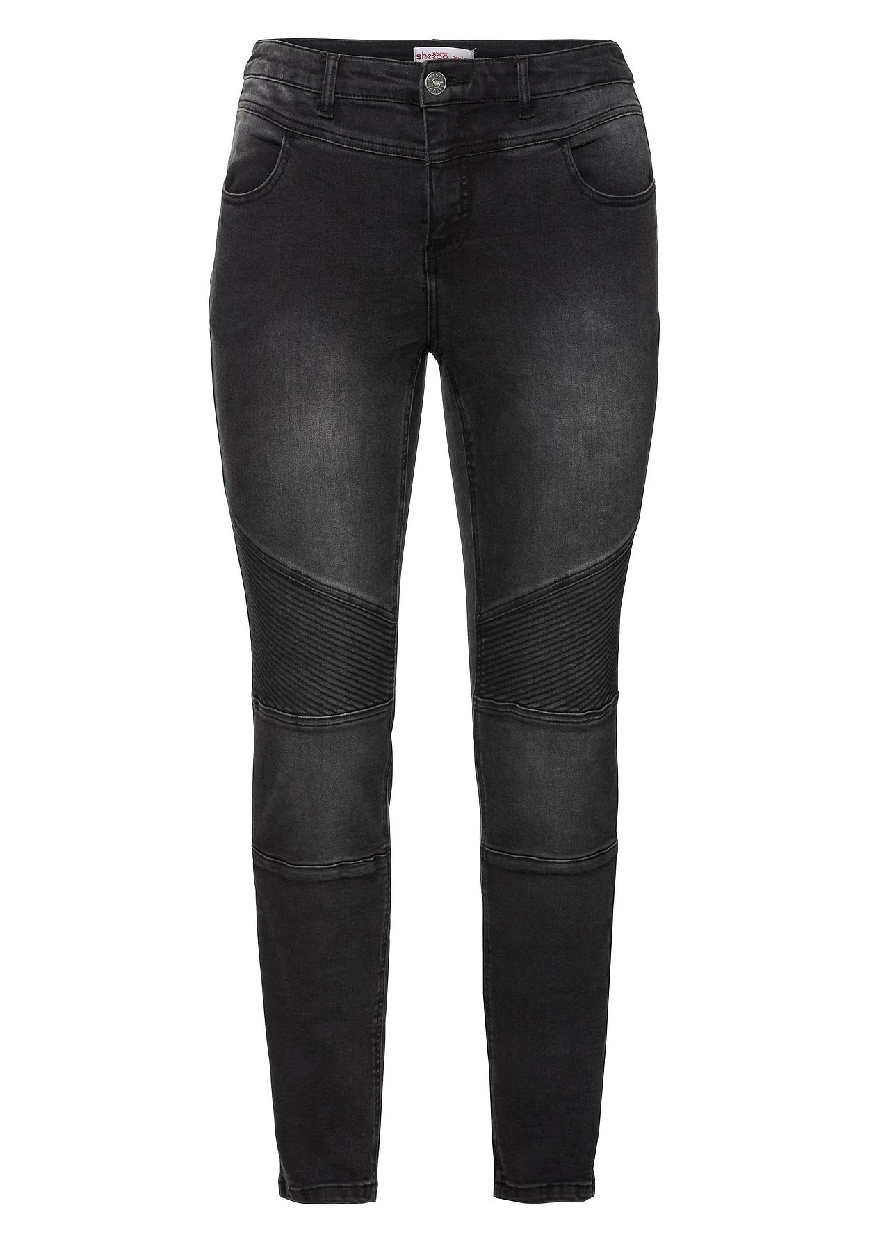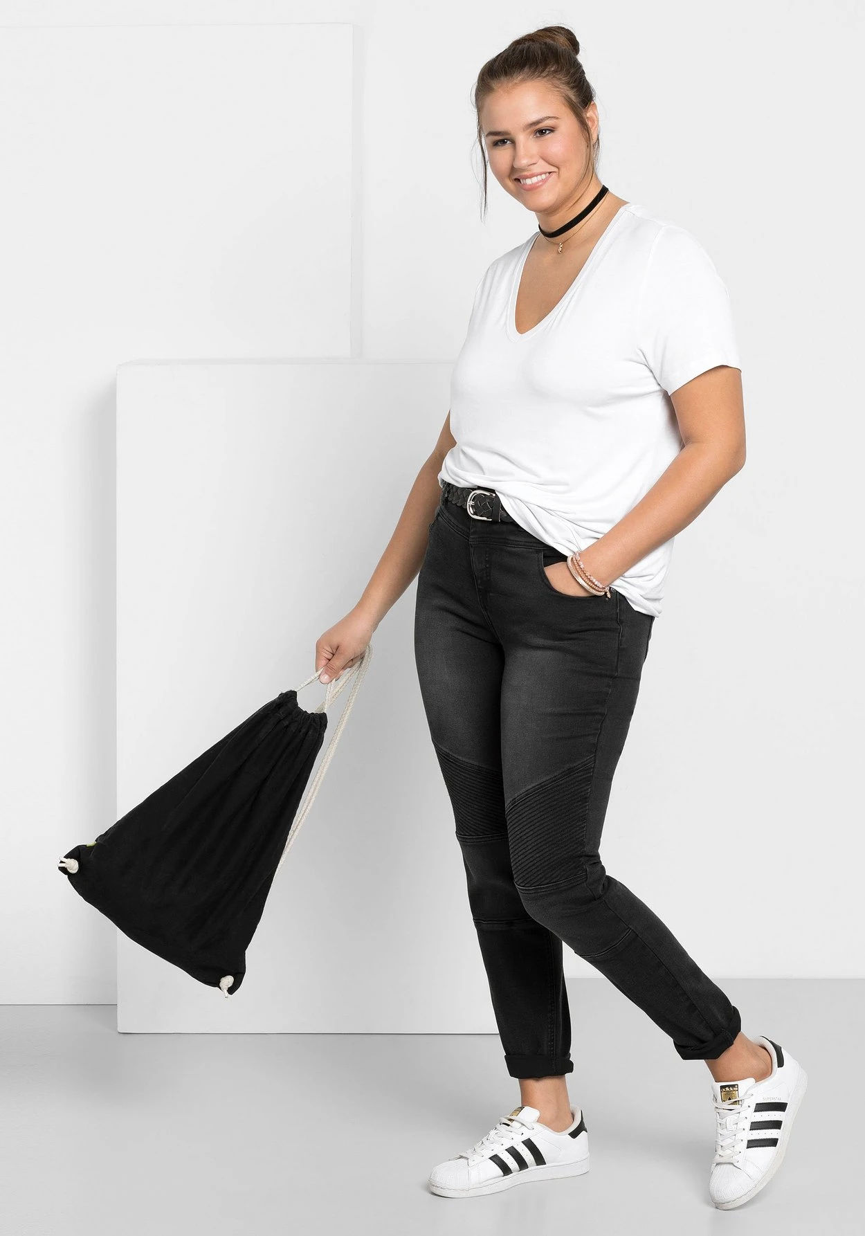 Die skinny geschnittene Jeans von sheego überzeugt mit coolen Bikerdetails über dem Knie. Individuelle Used-Effekte unterstreichen den lässigen Look. Mit Gürtelschlaufen, zwei Gesäßtaschen mit Stickereien und zwei Eingrifftaschen vorn. Ein trendstarkes It-Piece!