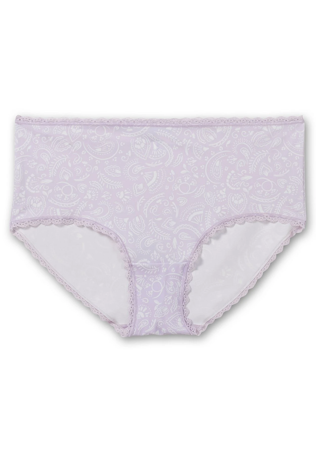 Slip in komfortabler Leibhöhe. Der feminine Paisley-Print wird durch die elastische Spitzenkante an Bund und Bein dekorativ ergänzt. Dazu sorgt der hohe Beinausschnitt für mehr Bewegungsfreiheit.