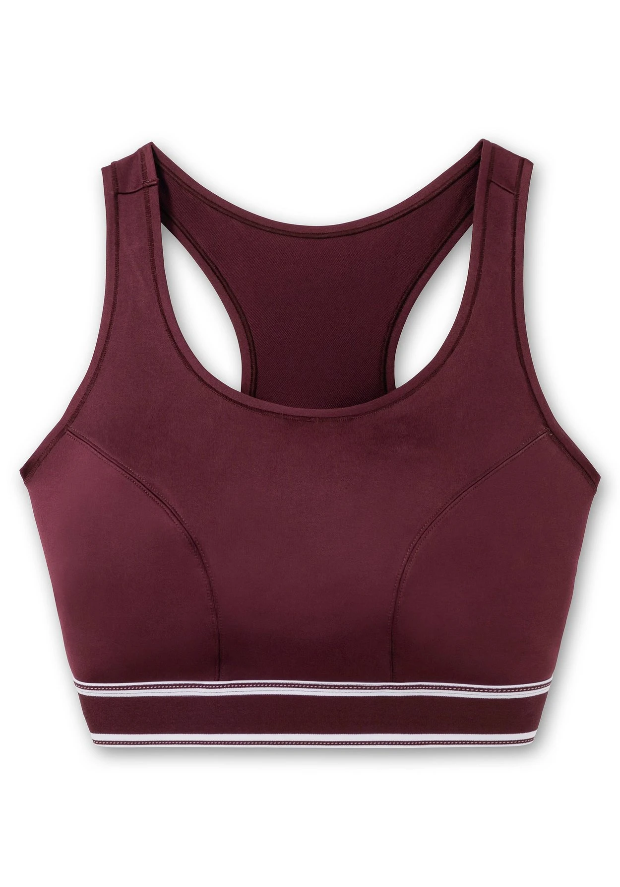 Sport-BH ohne Bügel. Der Bustier ist hinten in Racerback-Form geschnitten und wird einfach über den Kopf gezogen. Um dem Brustbereich mehr Halt zu geben, ist der BH vorn doppellagig verarbeitet. Breite Träger entlasten die Schultern, auch der geringelte breite Gummibund unter der Brust dient der zusätzlichen Unterstützung – das gibt dir ein sicheres Gefühl bei all deinen sportlichen Aktivitäten.