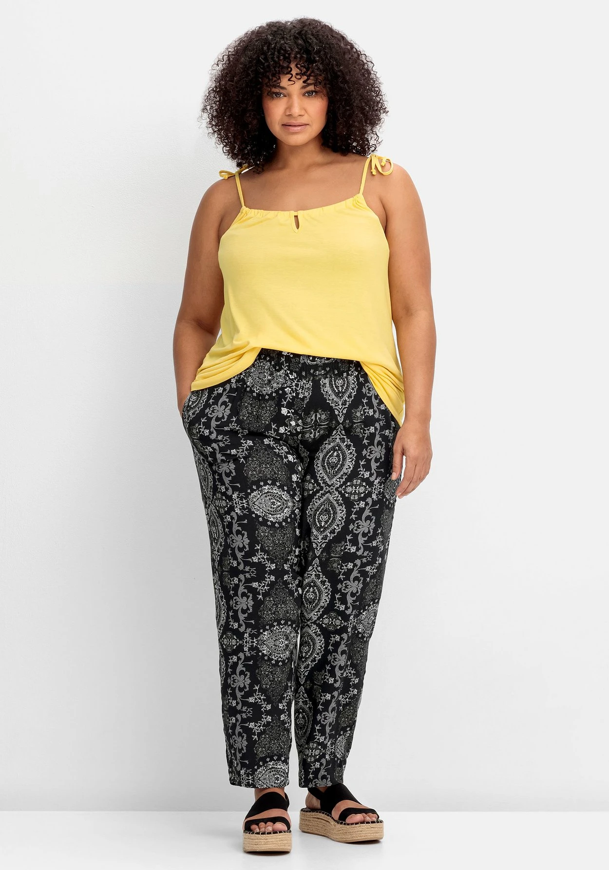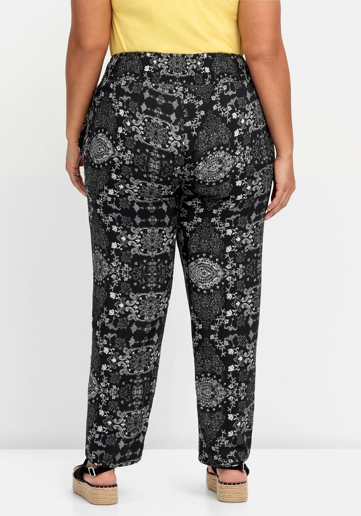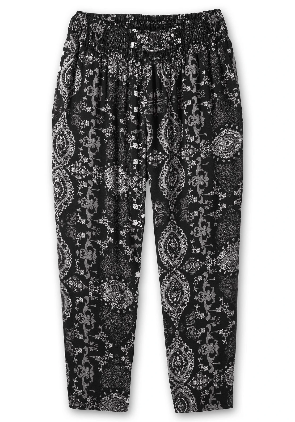 Strandhose mit dekorativem Ornament-Alloverdruck. Der elastische Smokbund und die lockere, gerade Beinform machen sie besonders tragefreundlich. Zwei praktische Seitentaschen ergänzen den Look.