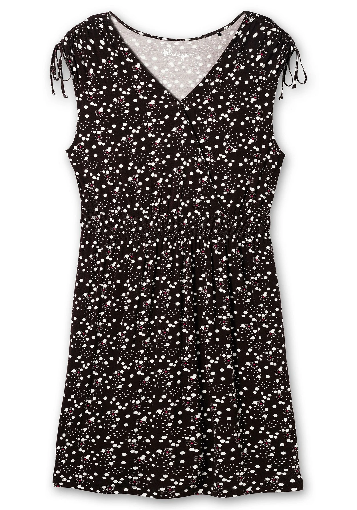 Strandkleid mit Alloverprint aus Punkten und Blumen. Der V-Ausschnitt in Wickeloptik lässt zusammen mit dem breiten gesmokten Taillenbund eine feminine Silhouette entstehen. Die Schulterpartie kann mit Bändern luftig gerafft werden, zwei praktische Eingrifftaschen machen den Urlaubslook perfekt.