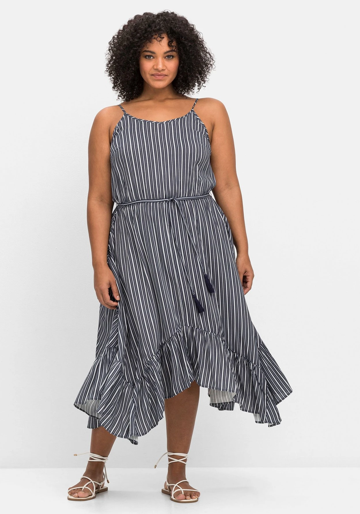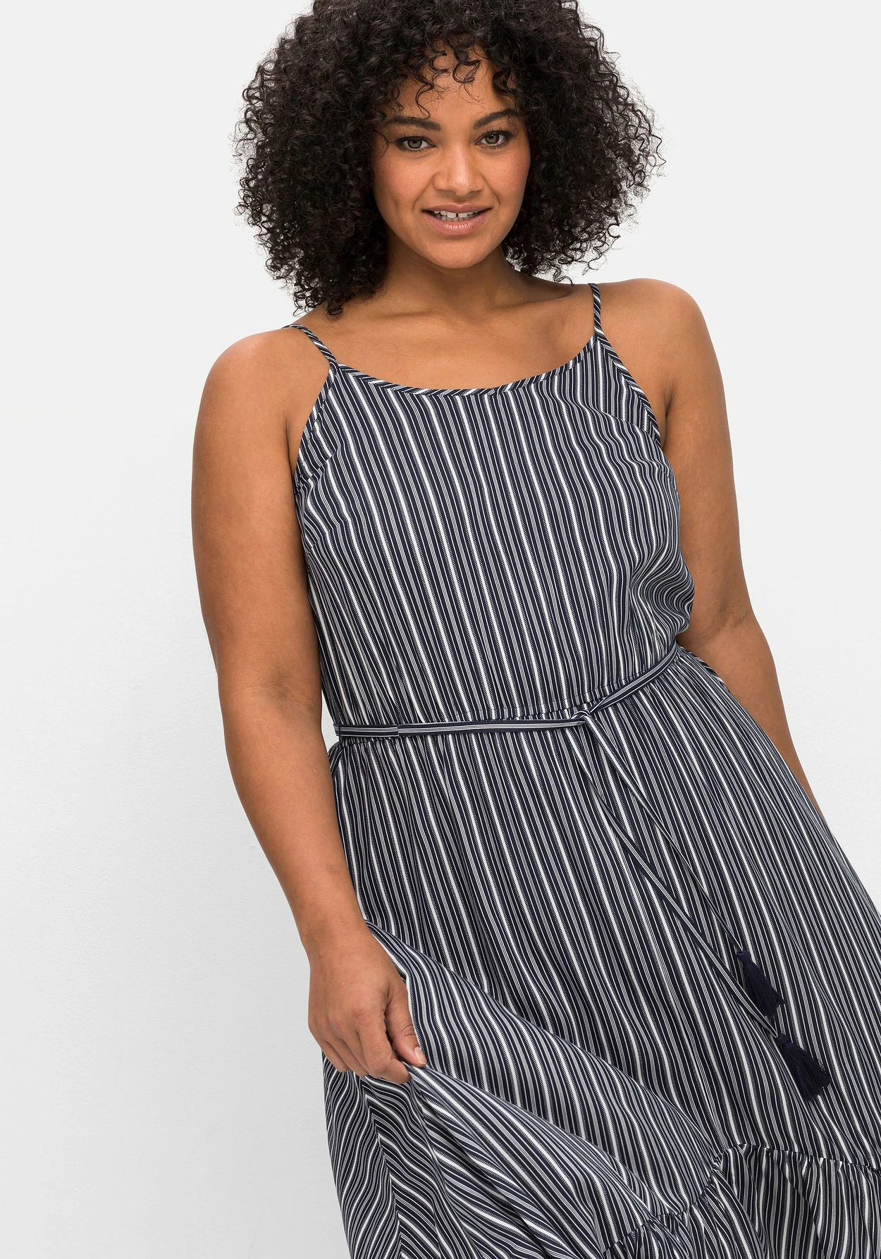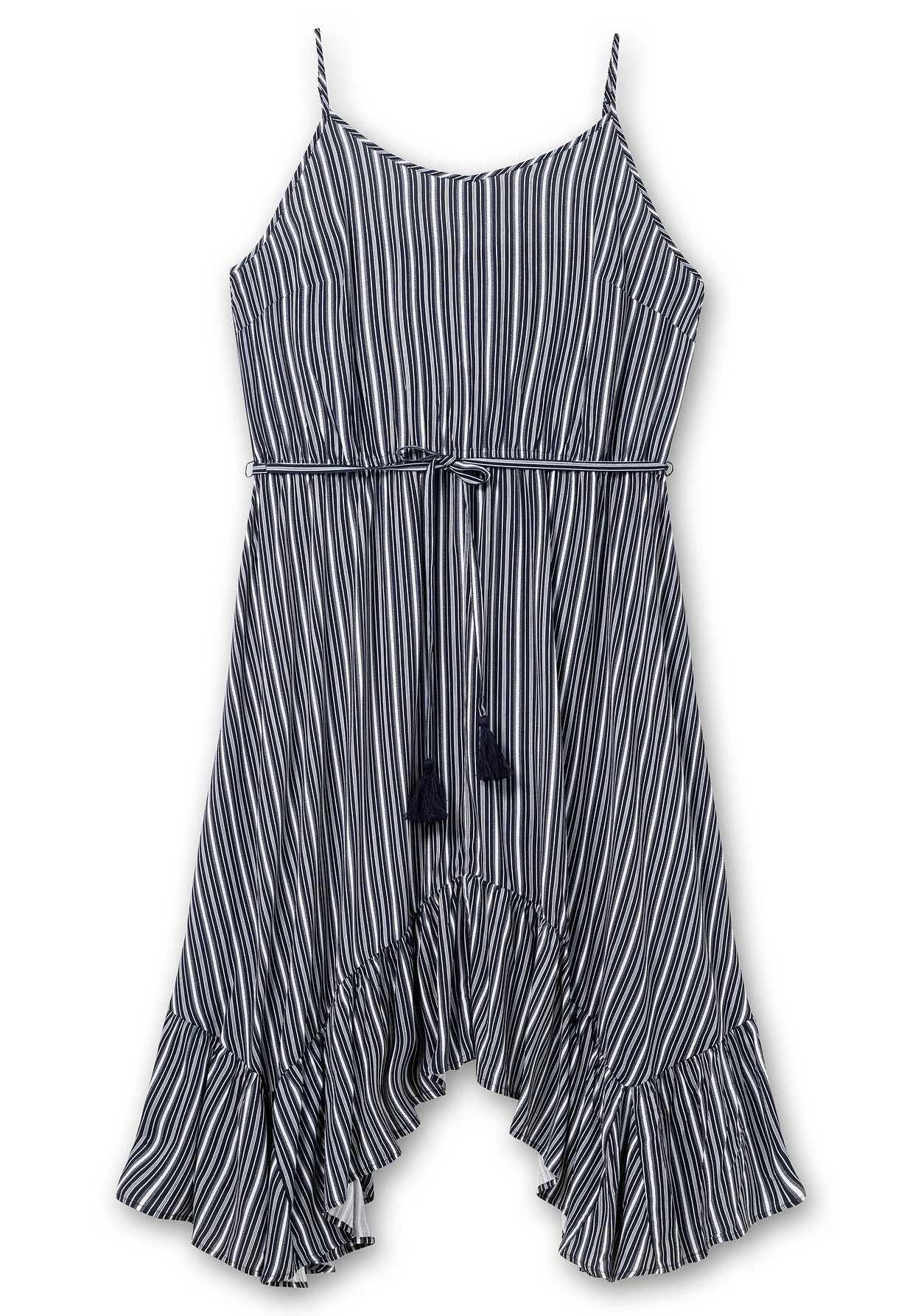 Strandkleid mit Streifen. Zum maritimen Print kommt ein sommerlicher Schnitt mit schmalen Spaghettiträgern und einem weit schwingenden Rock. Dieser wirkt durch die zipfelige Form und den breiten Volant luftig und feminin zugleich. Die Träger sind längenverstellbar, die Taille wird durch den Gummizug und das abnehmbare Bindeband betont. Auch im Rücken sorgt ein elastischer Gummizug für den optimalen Sitz.
