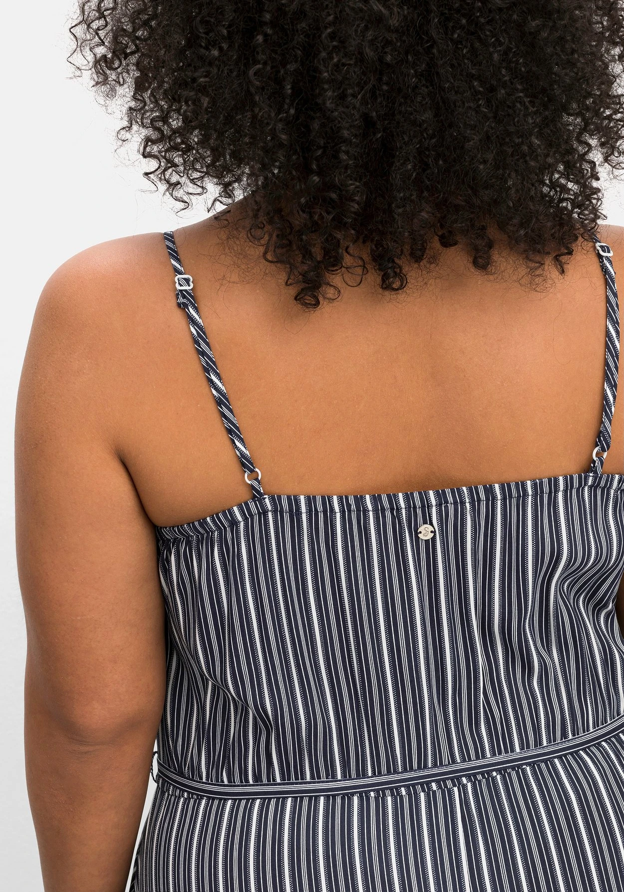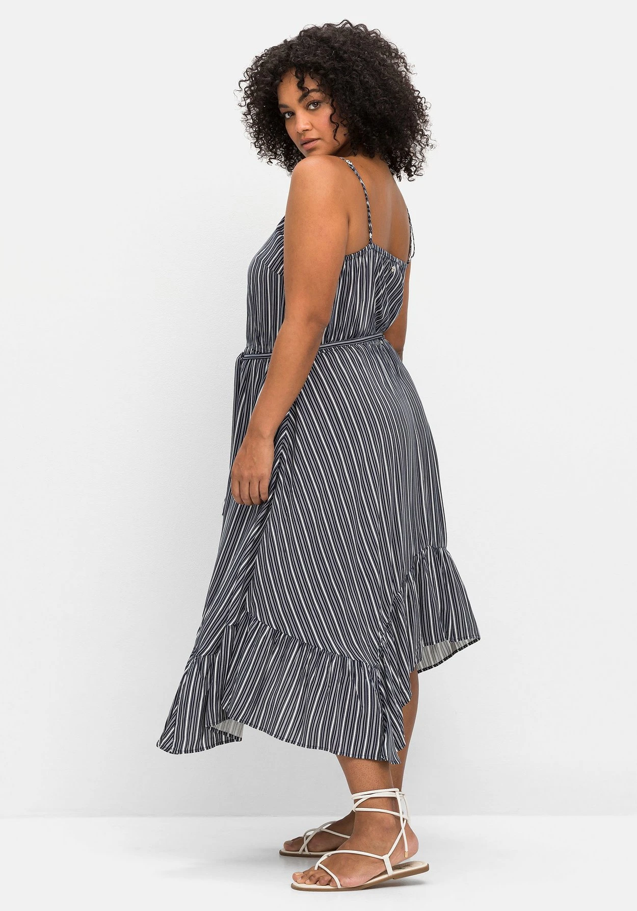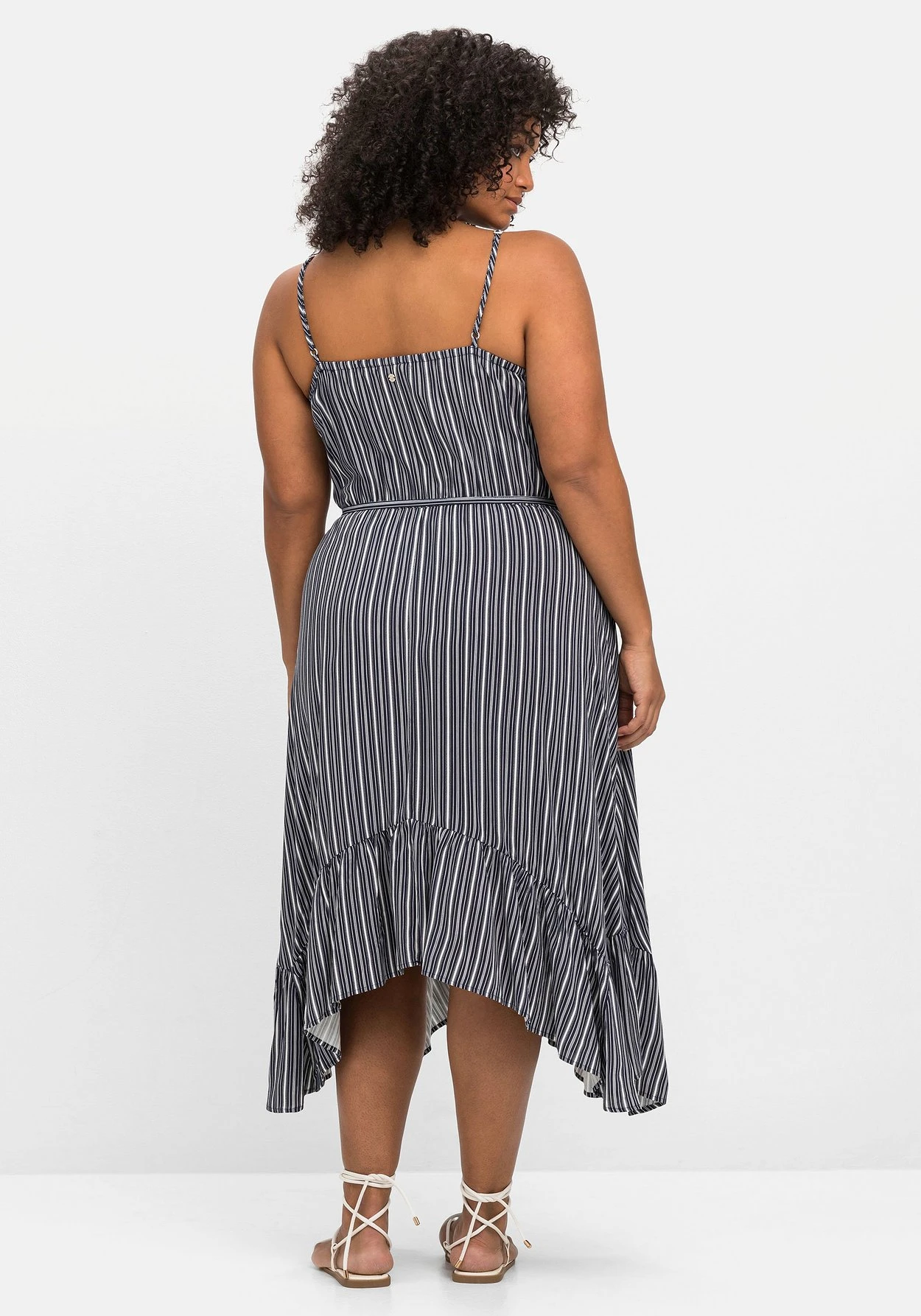 Strandkleid mit Streifen. Zum maritimen Print kommt ein sommerlicher Schnitt mit schmalen Spaghettiträgern und einem weit schwingenden Rock. Dieser wirkt durch die zipfelige Form und den breiten Volant luftig und feminin zugleich. Die Träger sind längenverstellbar, die Taille wird durch den Gummizug und das abnehmbare Bindeband betont. Auch im Rücken sorgt ein elastischer Gummizug für den optimalen Sitz.