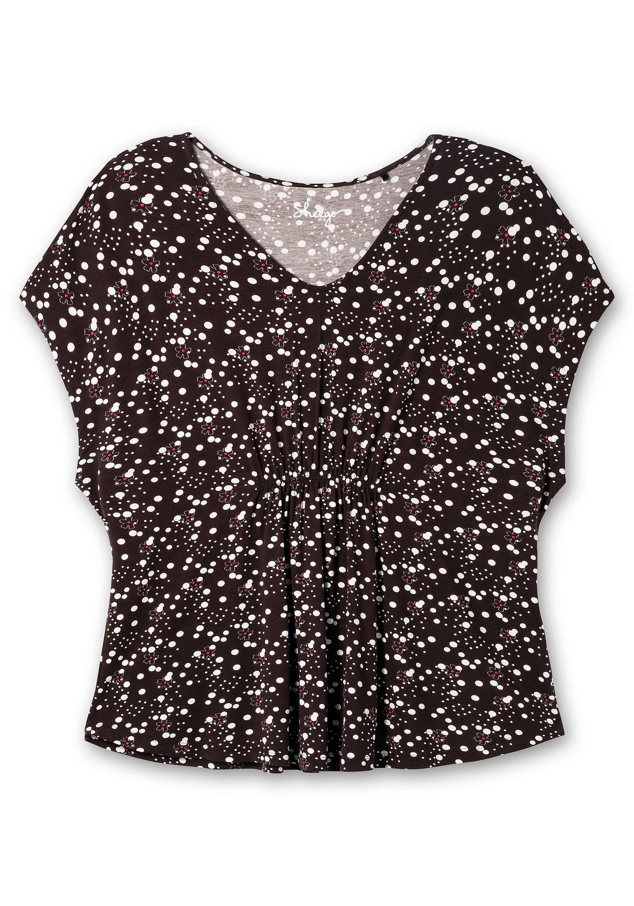 Strandshirt mit V-Ausschnitt. Der zarte Blütendruck setzt im Zusammenspiel mit den Tupfen feminine Akzente. Überschnittene Schultern sorgen für eine entspannte, moderne Optik. Ein elastischer Tailleneinsatz vorn und hinten betonen dezent die Körpermitte.