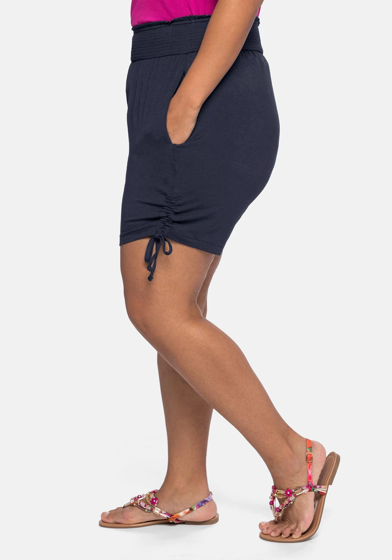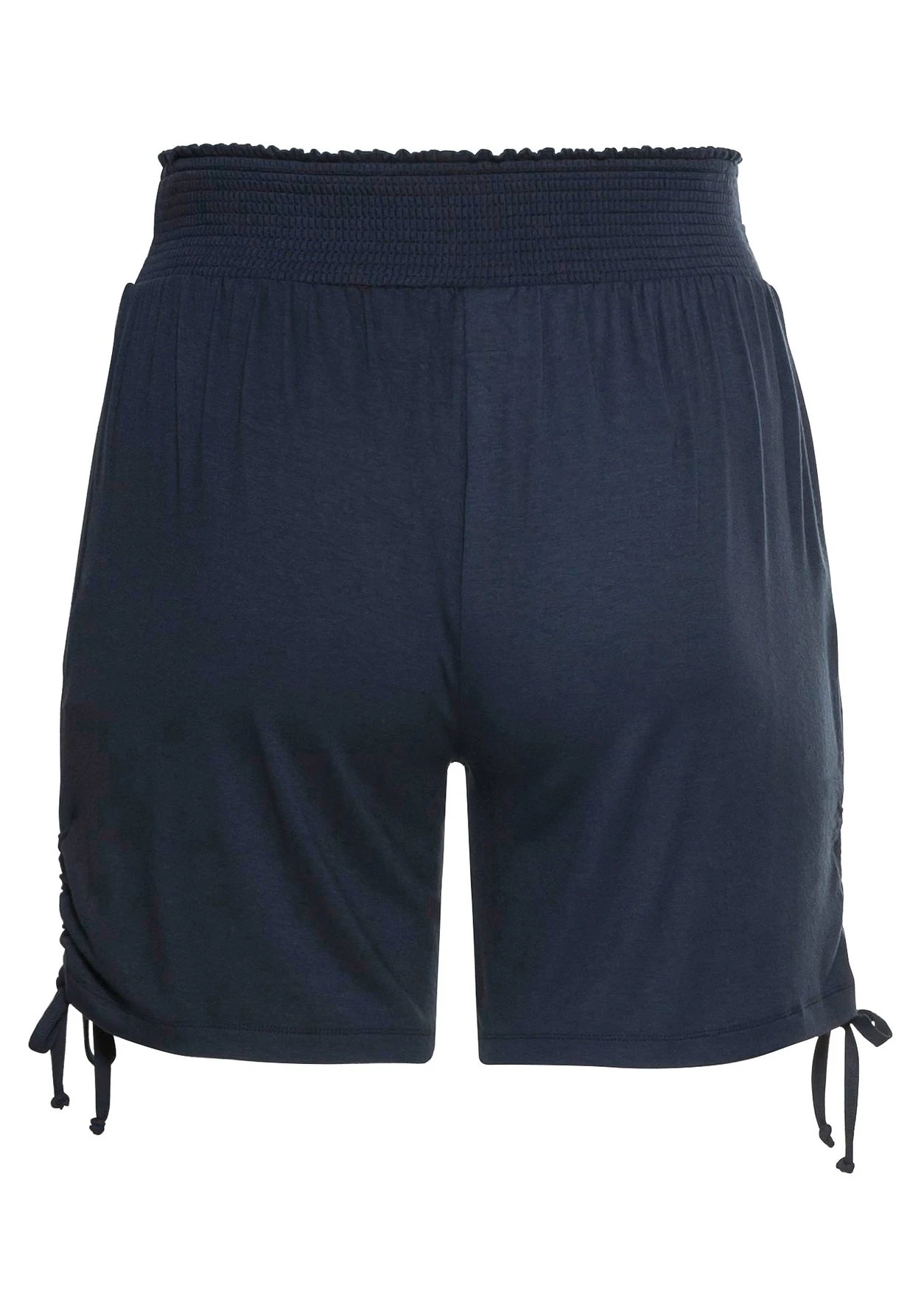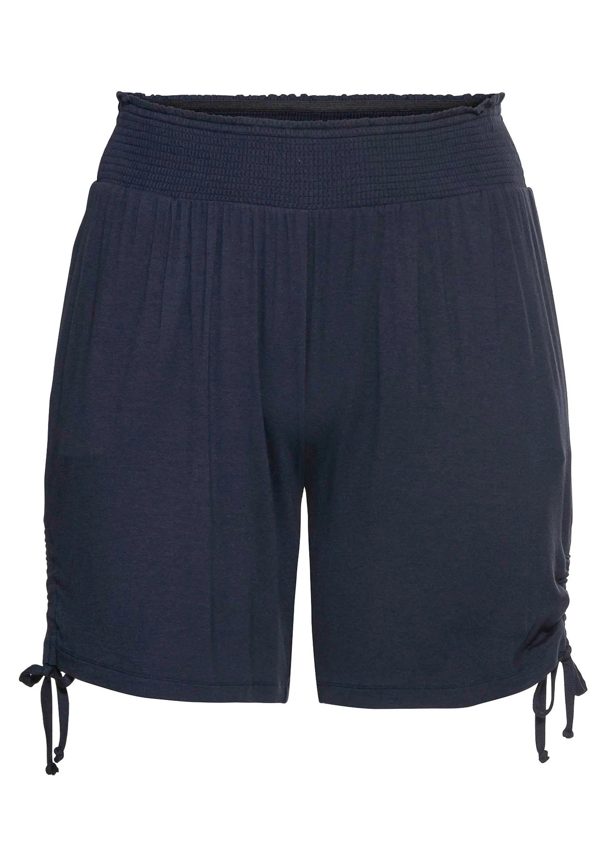 Strandshorts mit weitem Bein. Durch den legeren Schnitt und den bequemen Smokbund eignet sich die kurze Hose optimal, um sie schnell über die Badekleidung zu ziehen. Seitlich befinden sich zwei praktische Engrifftaschen. Die Zierbänder seitlich können dekorativ gerafft werden und runden so den Look feminin ab.